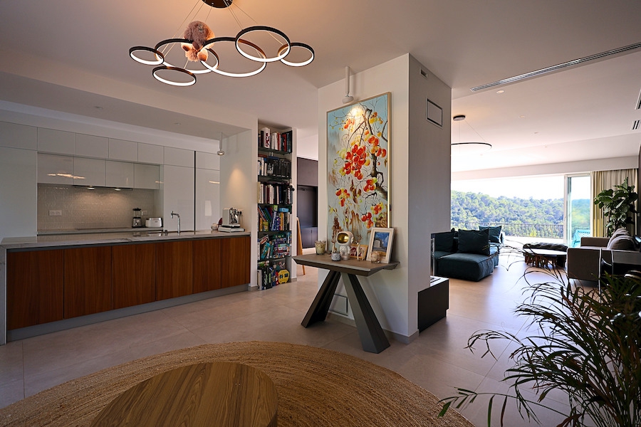 A large fully equipped open-plan kitchen, ideal for family meals and entertaining, opening onto a warm and inviting living area.