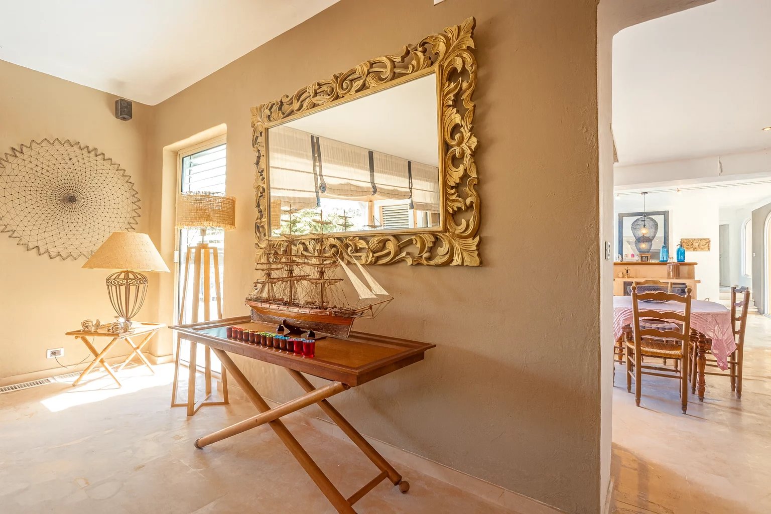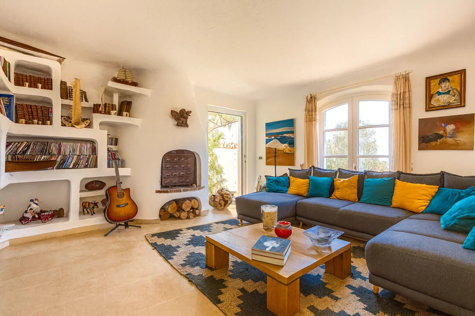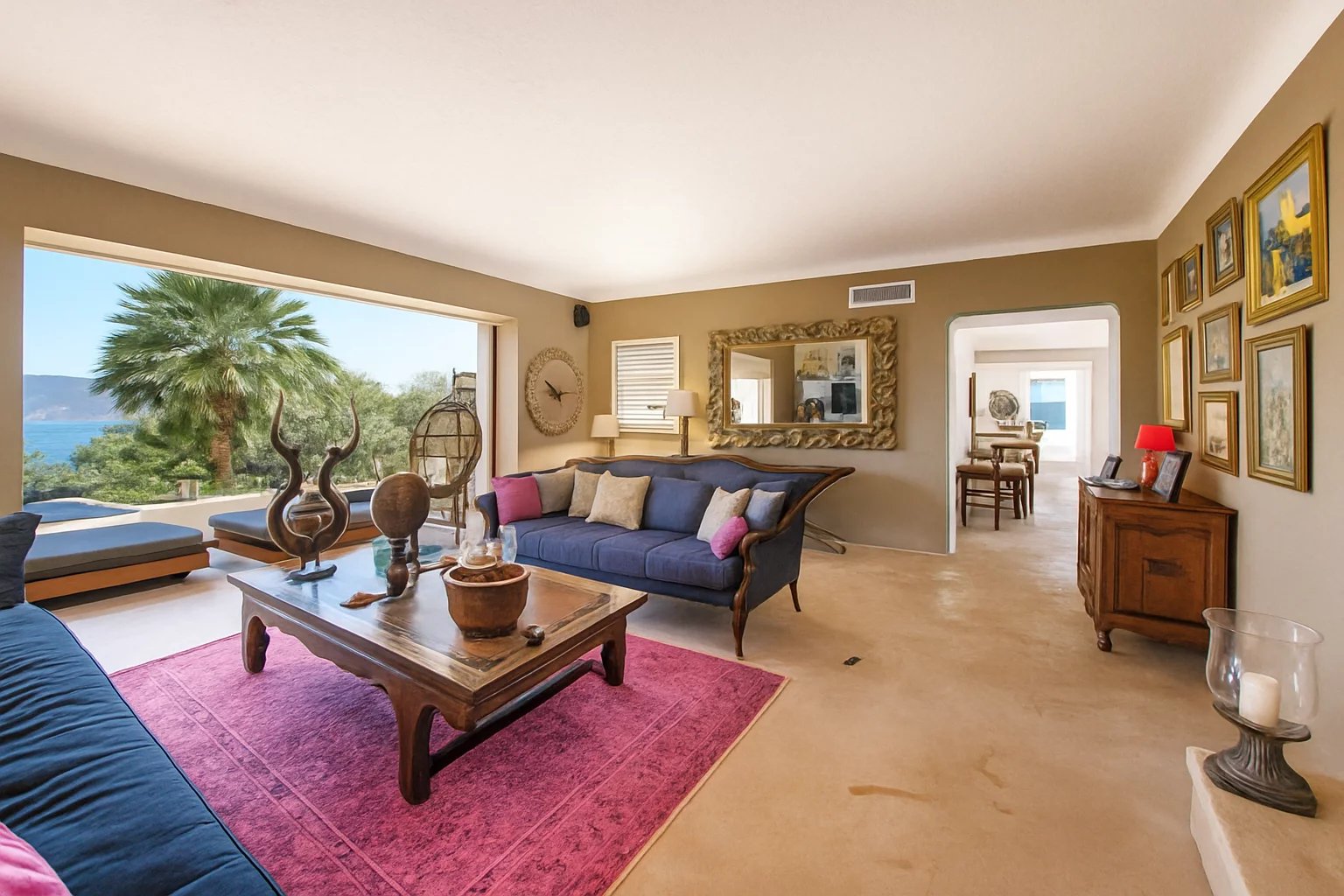 Built in the early 1980’s, the villa has been designed for mainly single-level living, with the upper floor dedicated to the master suite and study. The layout enhances a refined indoor-outdoor lifestyle: the main living room opens onto a wide shaded terrace, creating a natural extension of the interiors. The large infinity pool, set against the sea, is complemented by a summer kitchen and bar, offering a convivial setting for entertaining.