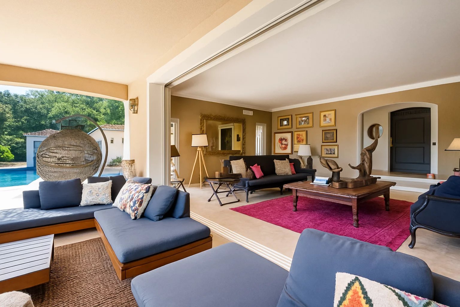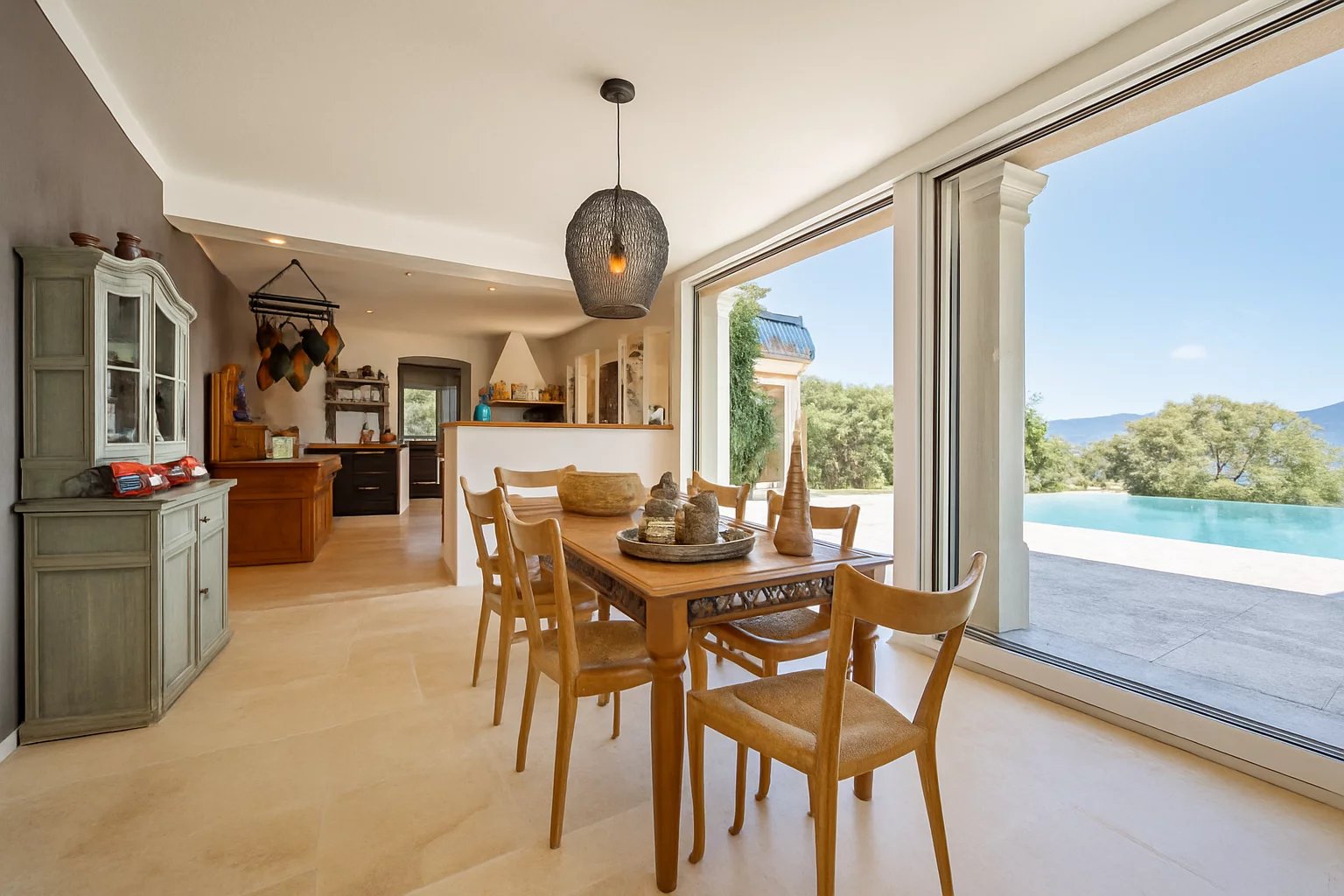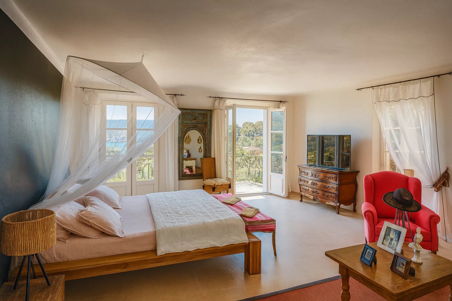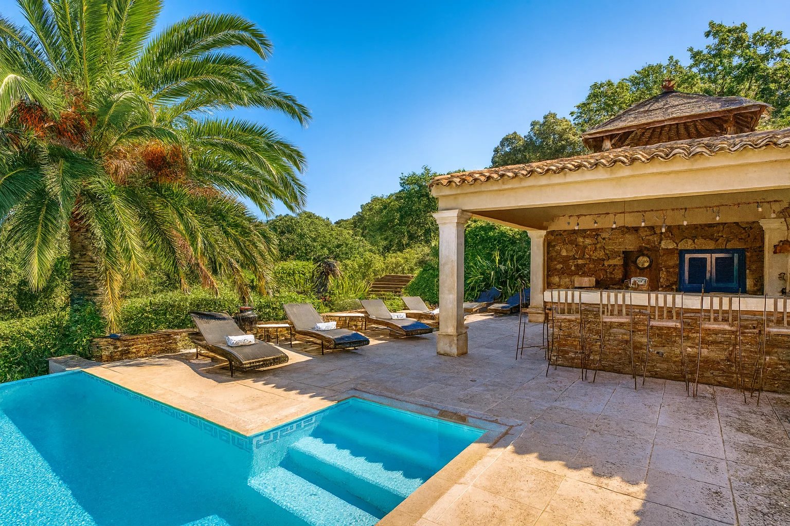 Built in the early 1980’s, the villa has been designed for mainly single-level living, with the upper floor dedicated to the master suite and study. The layout enhances a refined indoor-outdoor lifestyle: the main living room opens onto a wide shaded terrace, creating a natural extension of the interiors. The large infinity pool, set against the sea, is complemented by a summer kitchen and bar, offering a convivial setting for entertaining.