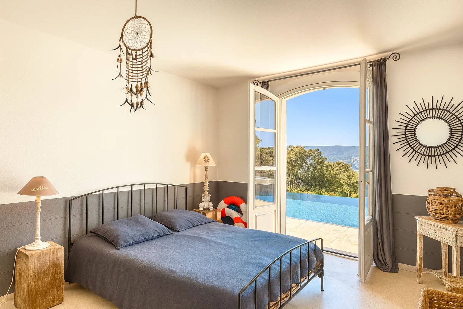 Offering approximately 350 m2 of living space, the property is divided into two distinct buildings and comprises 6 to 7 bedrooms, including a vast master suite occupying the upper floor, complete with study, dressing room, bathroom, and a private sea-facing terrace. The reception areas unfold in succession, featuring two spacious living rooms followed by a dining area and an open-plan kitchen extending seamlessly to the terrace and the infinity pool.