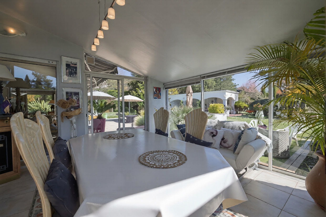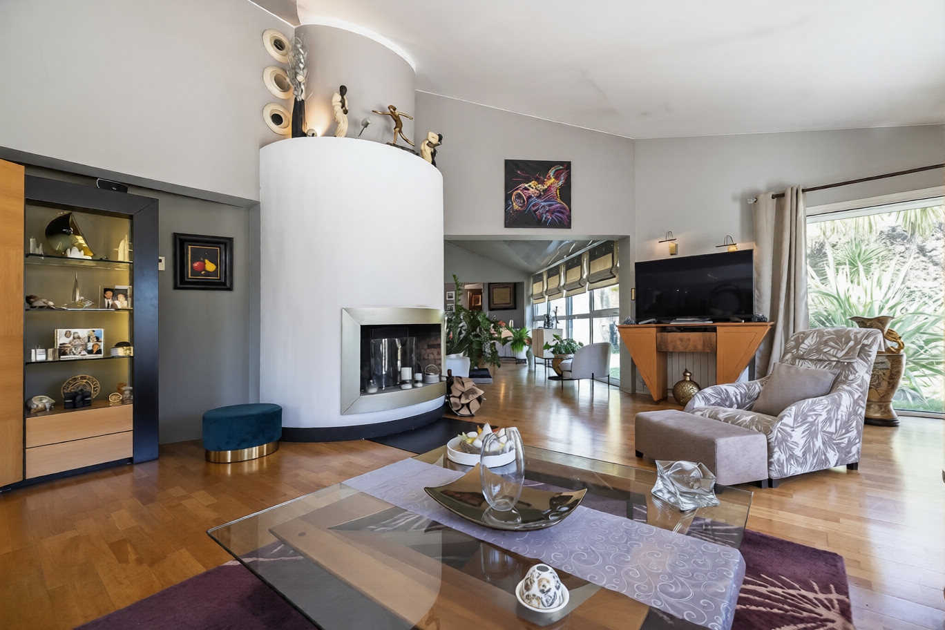 Inside, life naturally revolves around a 45 m2 living room with a fireplace, comprising a dining area opening onto a south-facing veranda and a lounge, which opens onto the south-facing terrace and pool area through large French doors. Adjoining this is an open-plan office with a private view of the garden.