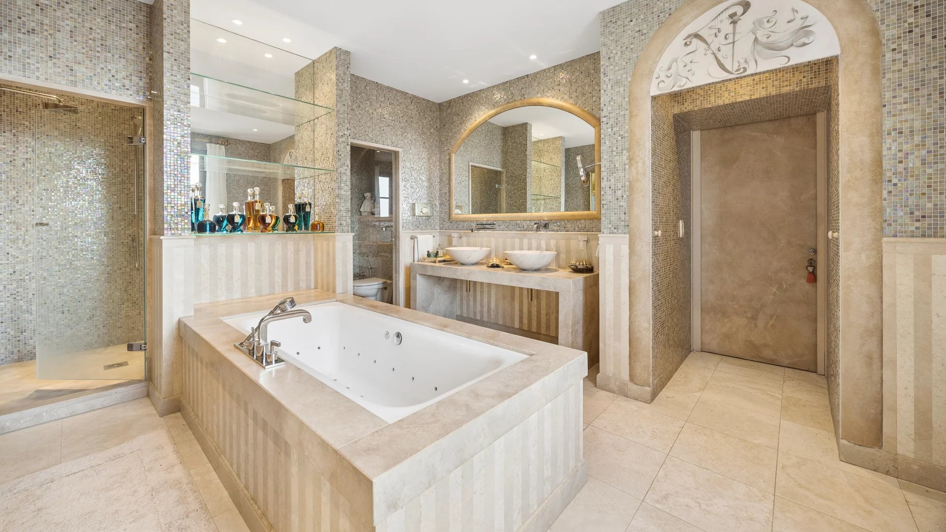The main villa features two distinct reception areas, including a spacious 75 m2 living room with sculptural Gaudí-inspired ceilings, as well as a more intimate lounge designed for family living. In total, the property offers seven en-suite bedrooms.