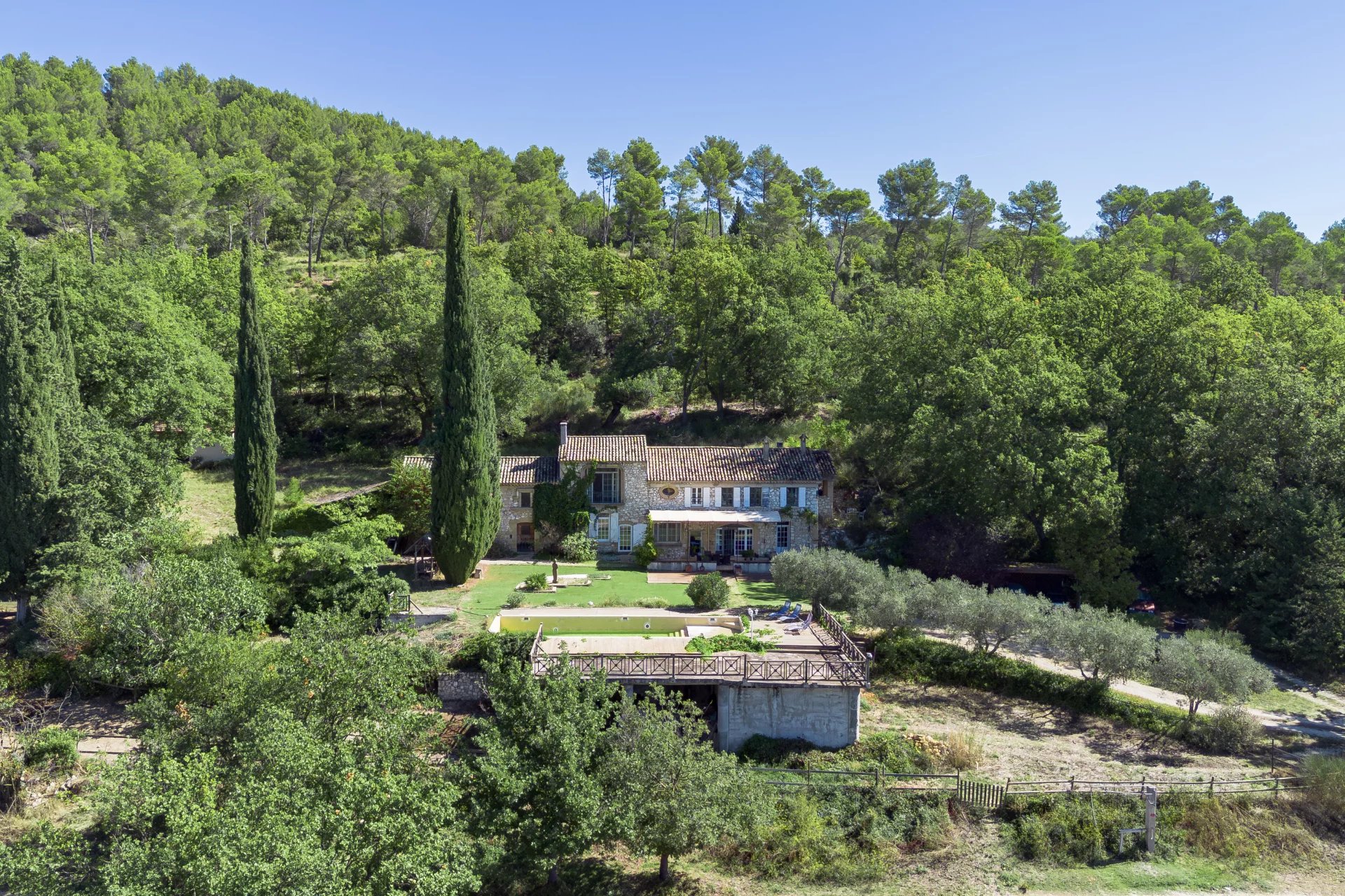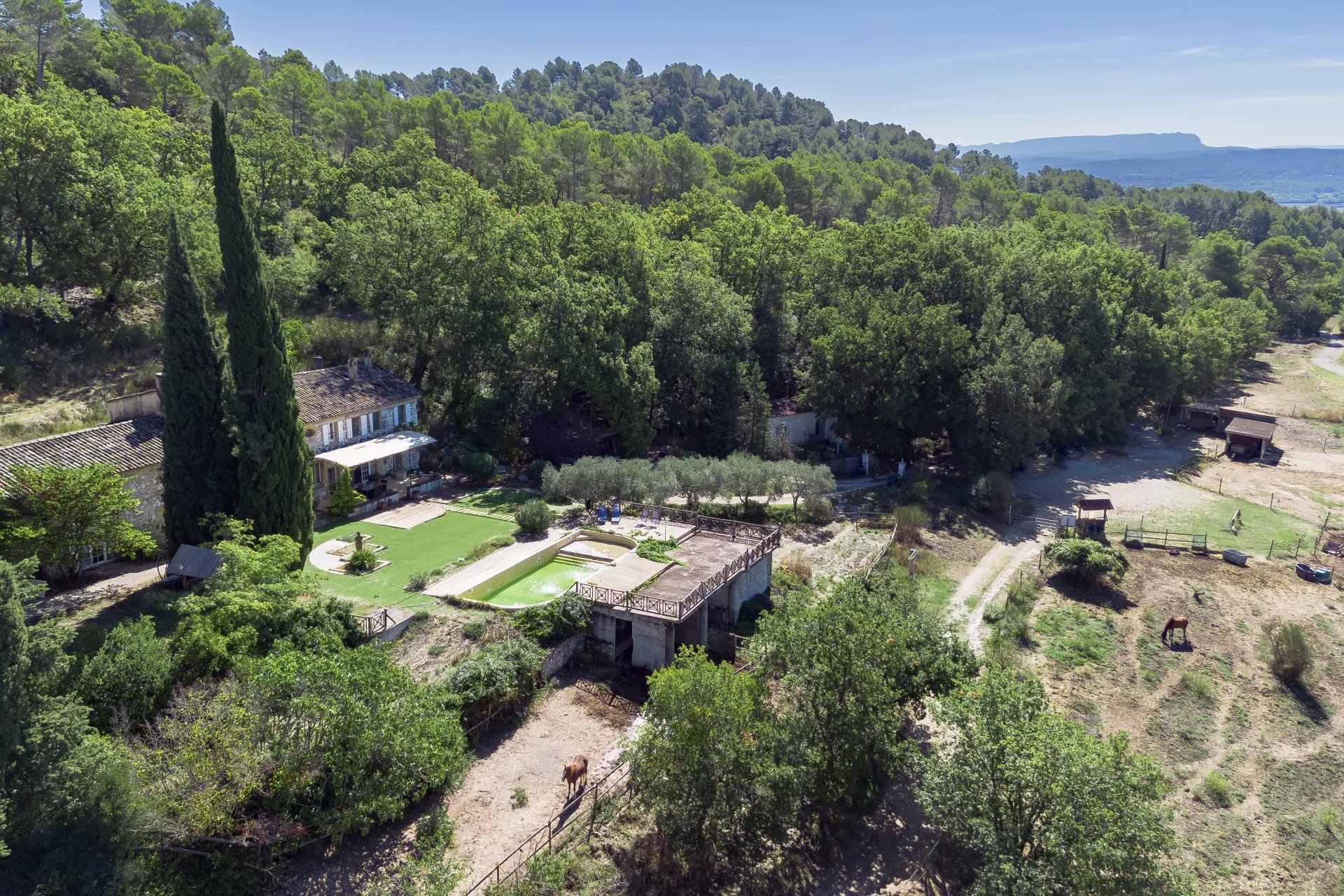 Luberon. 35 km from the city of Aix-en-Provence and its TGV station. 15 minutes from the village of Lourmarin, in a quiet, sought-after area overlooking the Durance Valley with a superb view of the Sainte-Victoire mountain, an imposing stone bastide, surrounded by its 1ha6 hectares of land (or more if needed) bordered by Mediterranean plants.