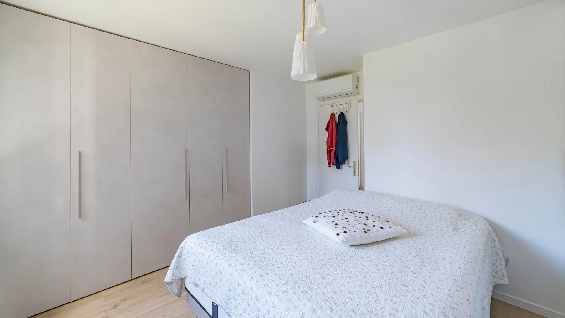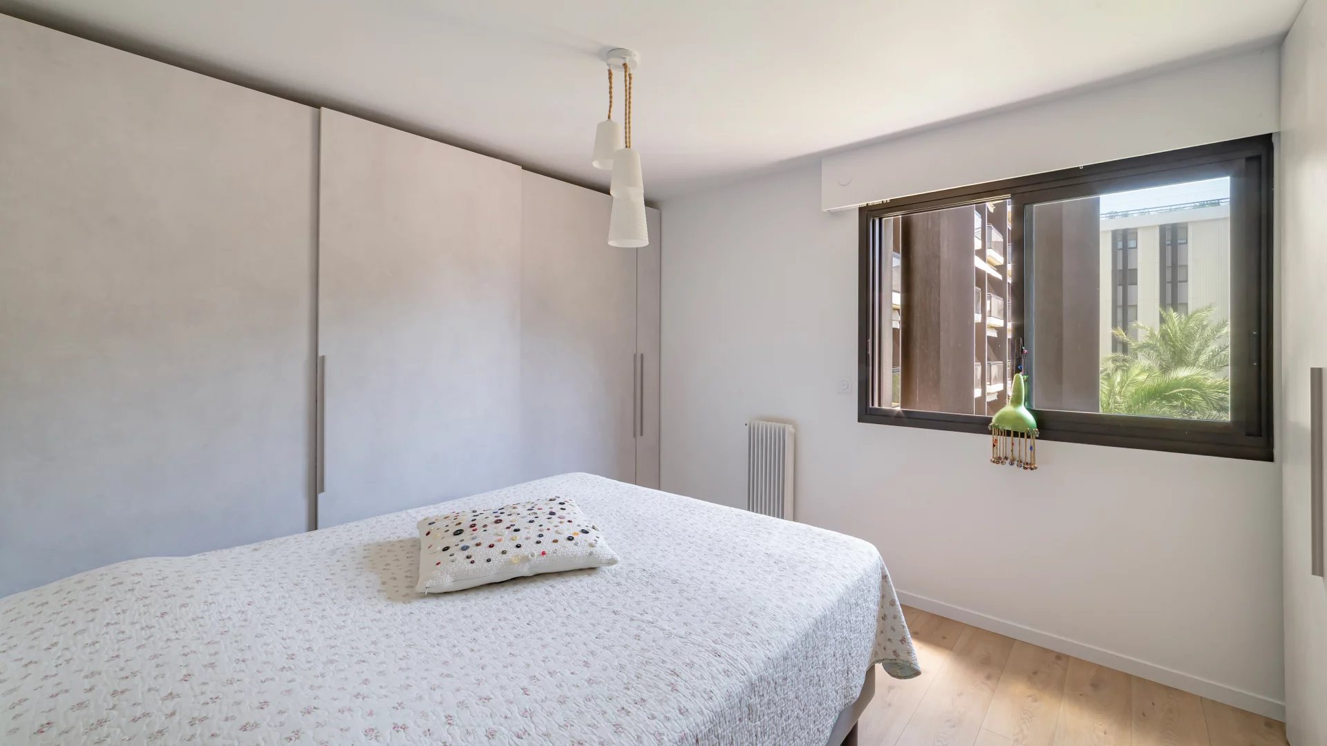 The property, bright and airy, comprises an entrance hall, a living room with a fully equipped open-plan kitchen opening onto the terrace with a slight sea view, a spacious bedroom with two large dressing rooms and a shower room with toilet.