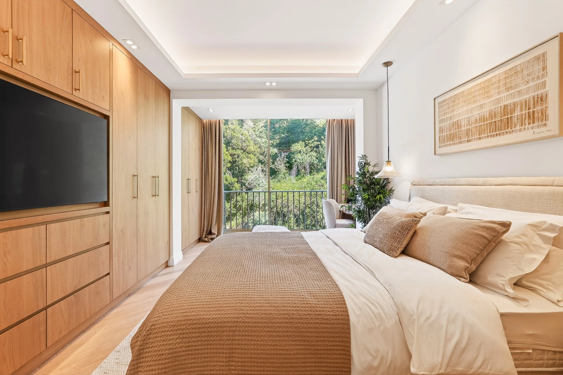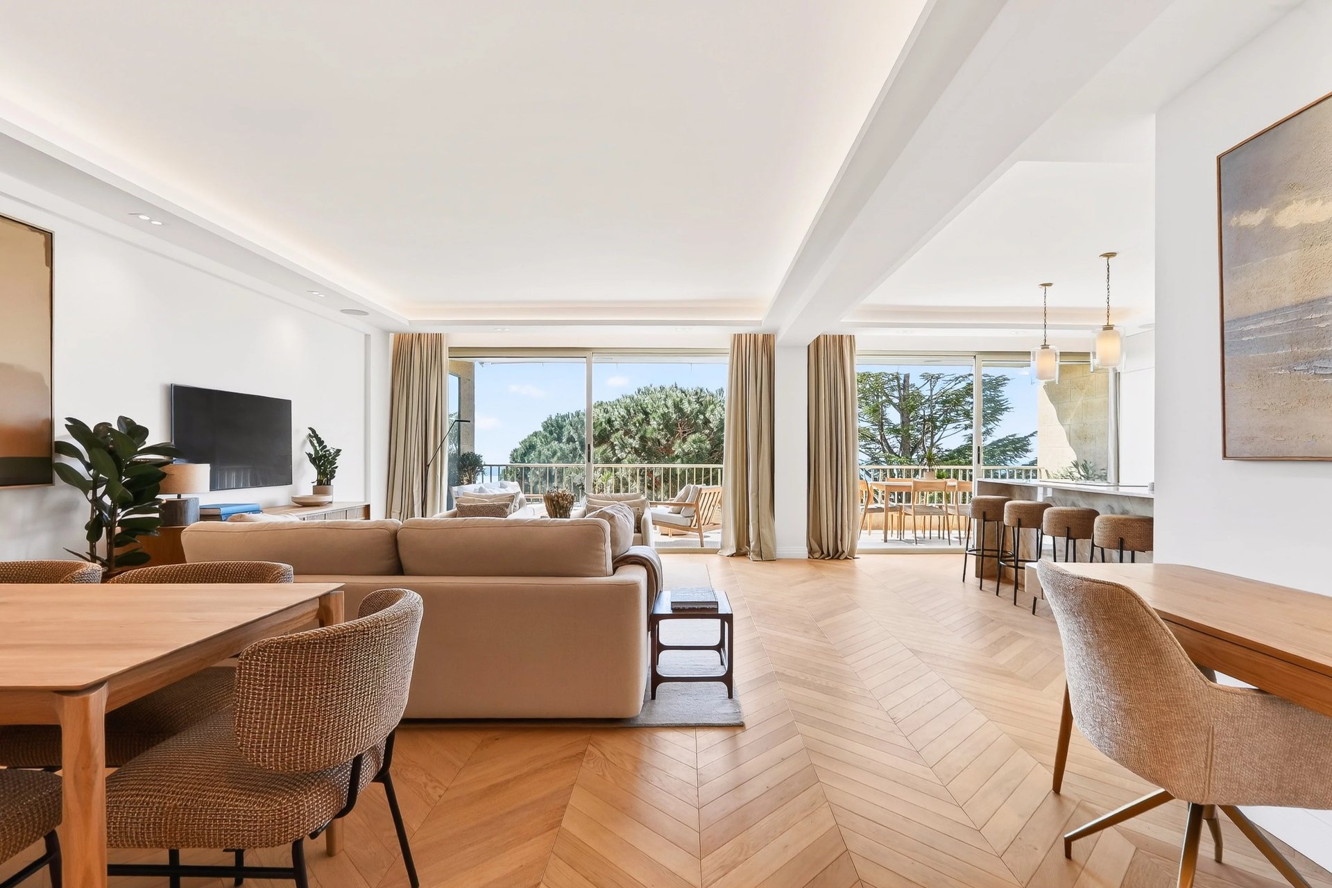 The apartment consists of a large, bright double living room with a sumptuous open kitchen, opening onto a southwest-facing terrace offering a pleasant view of the greenery and the Bay of Cannes. It also has two bedrooms, each with an en suite bathroom.