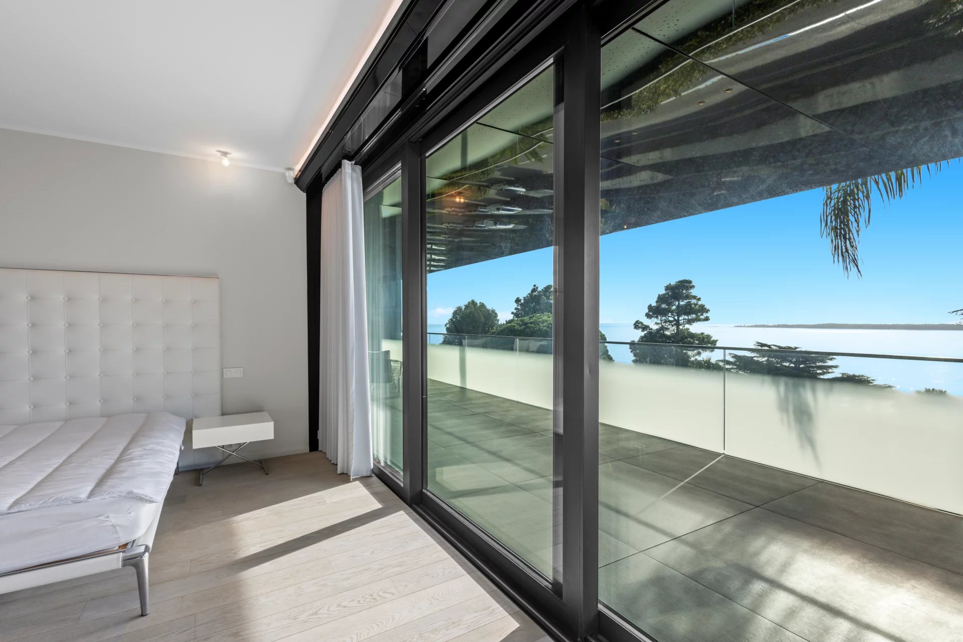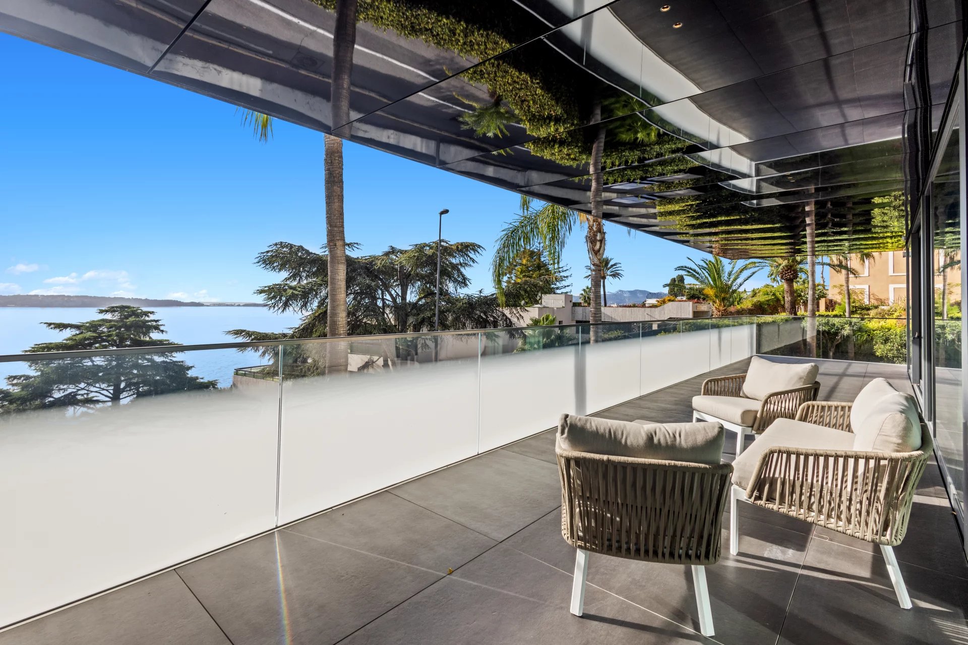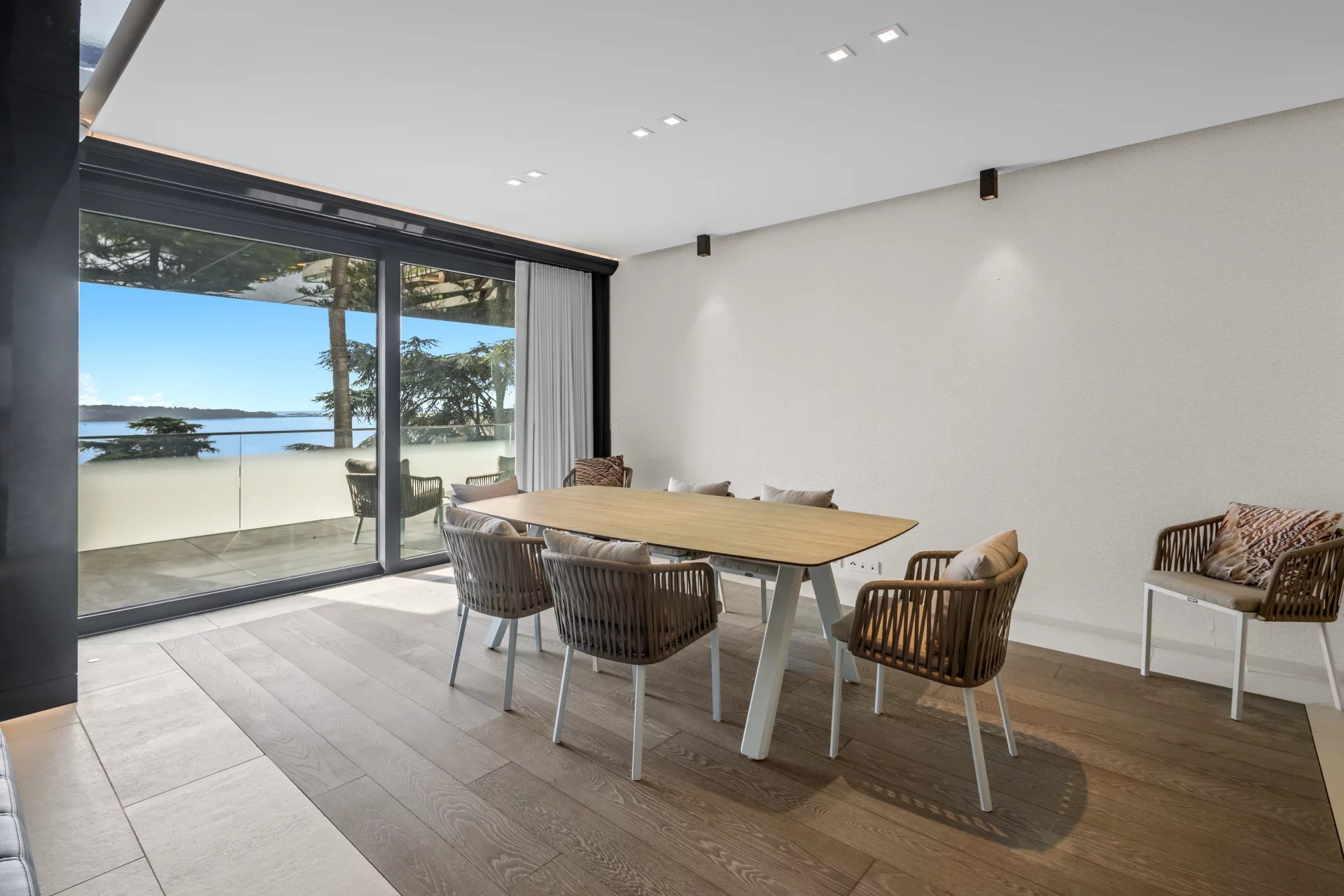 This contemporary seafront residence in Cannes Californie epitomizes refined coastal living through its architectural purity and uncompromising views. The sleek, glass-enclosed terrace provides a seamless indoor-outdoor experience, with frameless glass balustrades preserving the sweeping Mediterranean panorama.