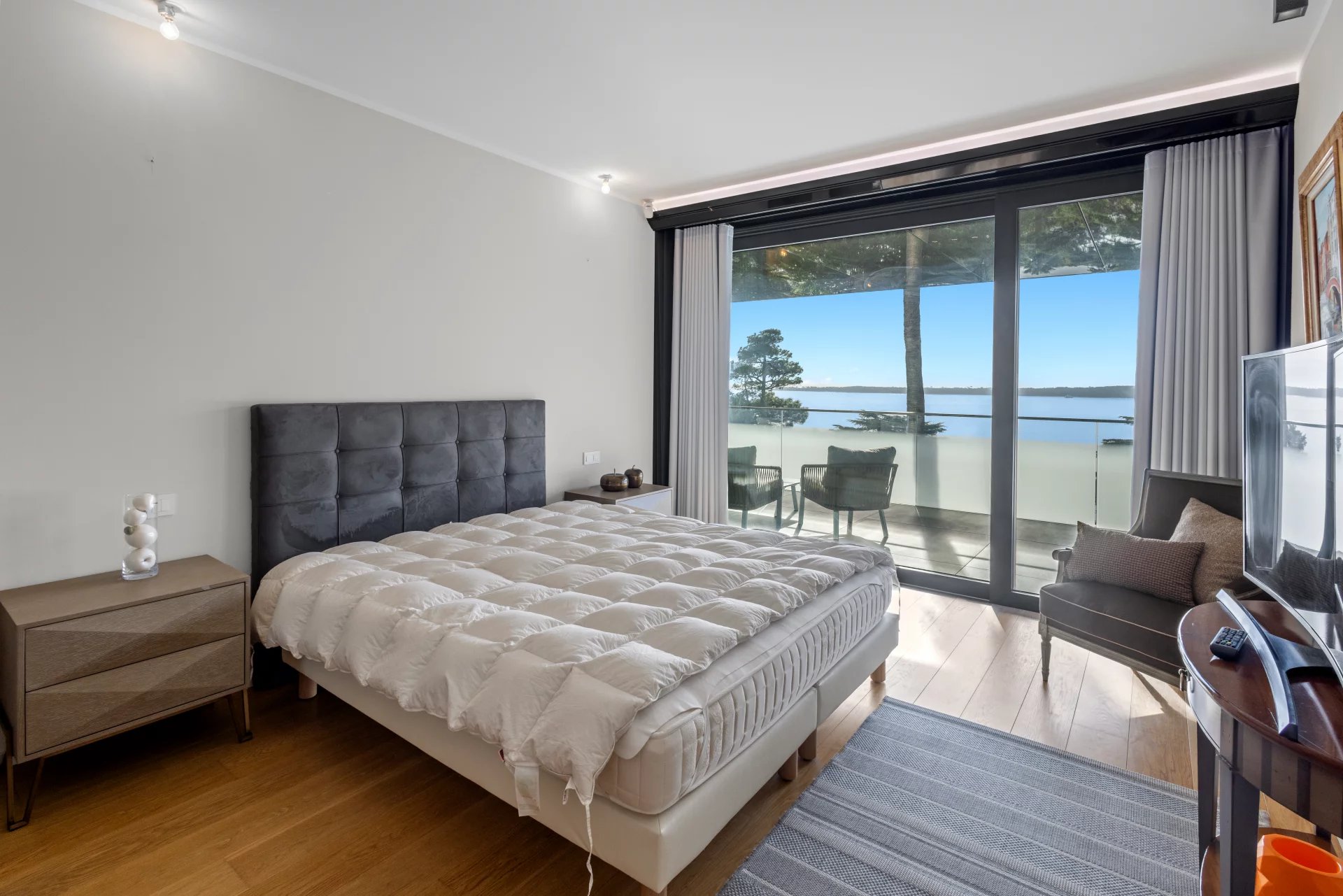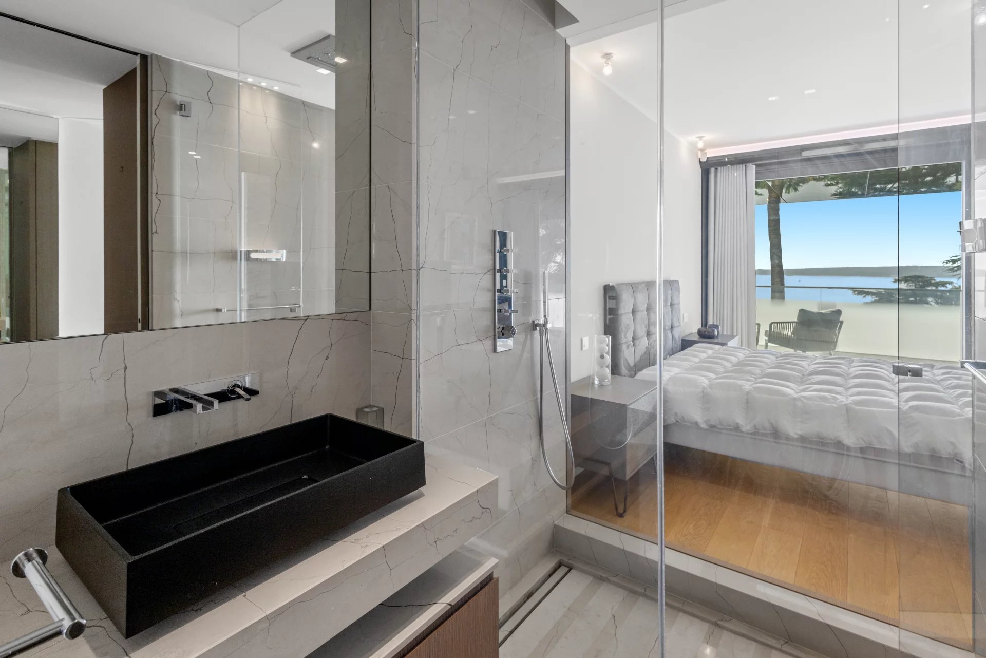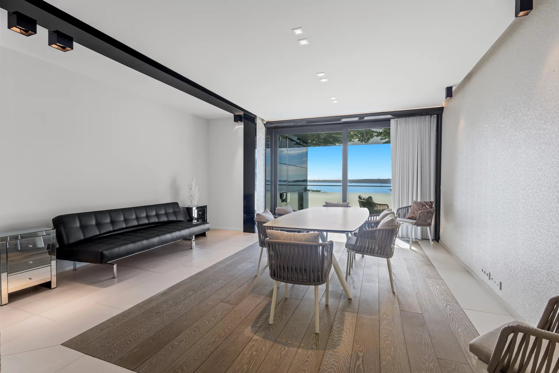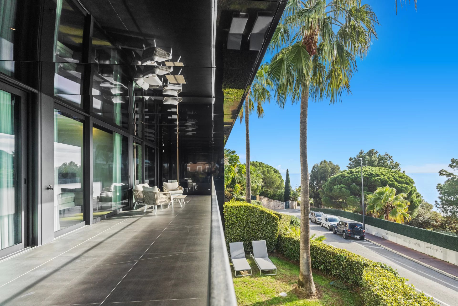 This contemporary seafront residence in Cannes Californie epitomizes refined coastal living through its architectural purity and uncompromising views. The sleek, glass-enclosed terrace provides a seamless indoor-outdoor experience, with frameless glass balustrades preserving the sweeping Mediterranean panorama.