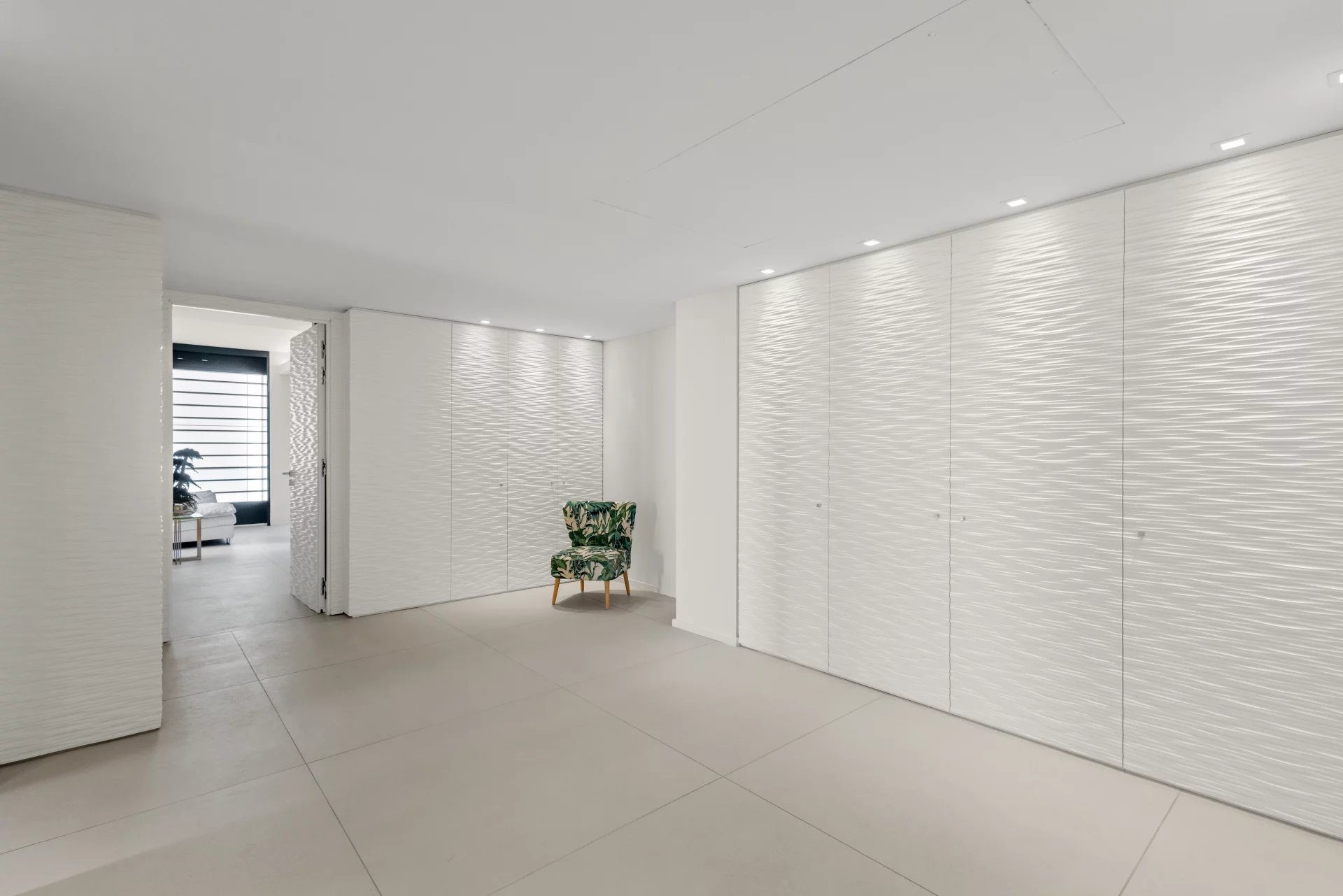 The apartment’s interior features pristine white surfaces complemented by subtle textural elements and monochromatic accents. Natural light floods the living spaces.