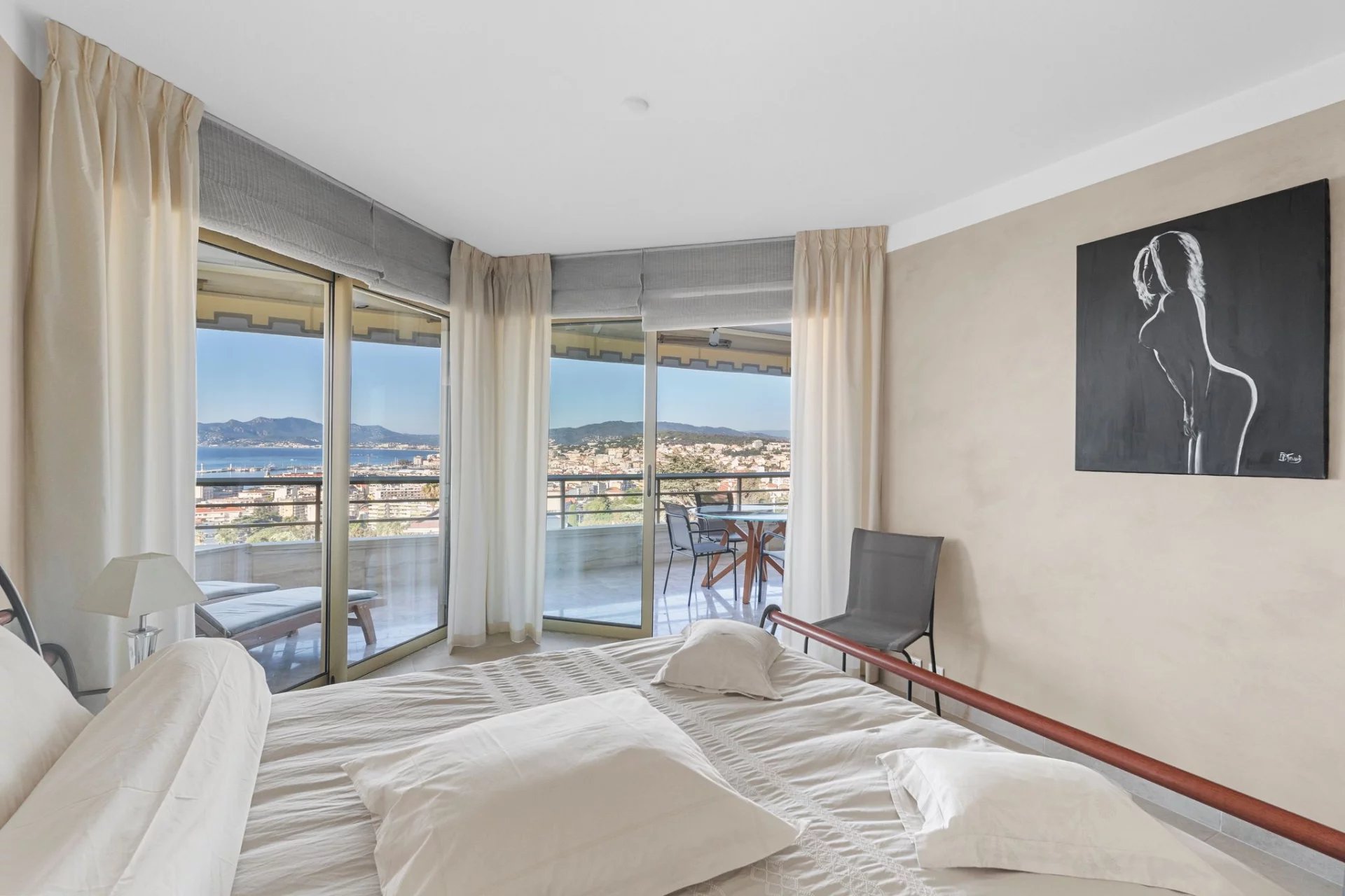 Nestled on a high floor, this bright apartment consists of a spacious living room with an open kitchen, offering a breathtaking unobstructed view. You will be charmed by the panoramic terrace overlooking the bay of Cannes and extending to the Esterel, a true haven of peace where you can relax.