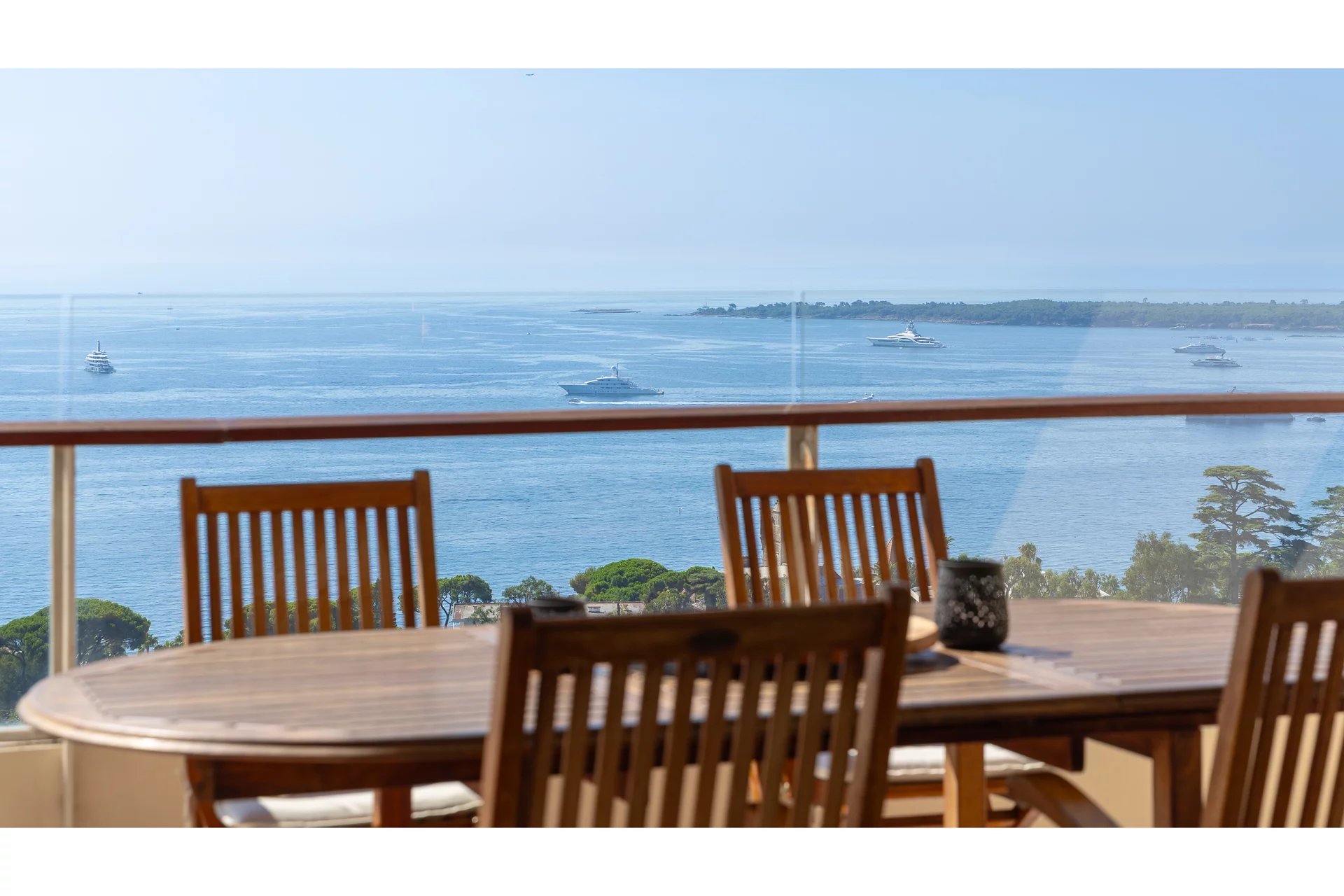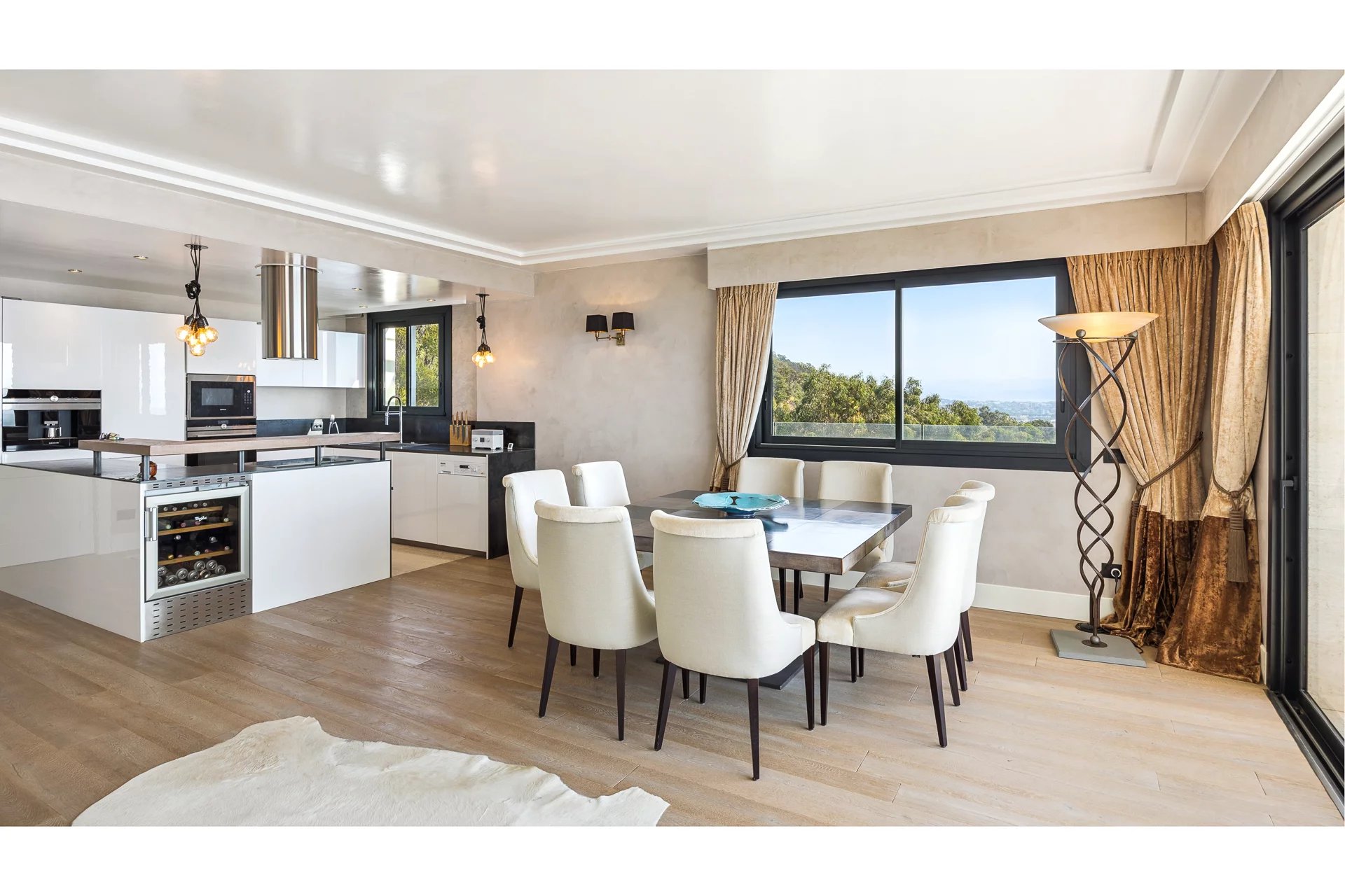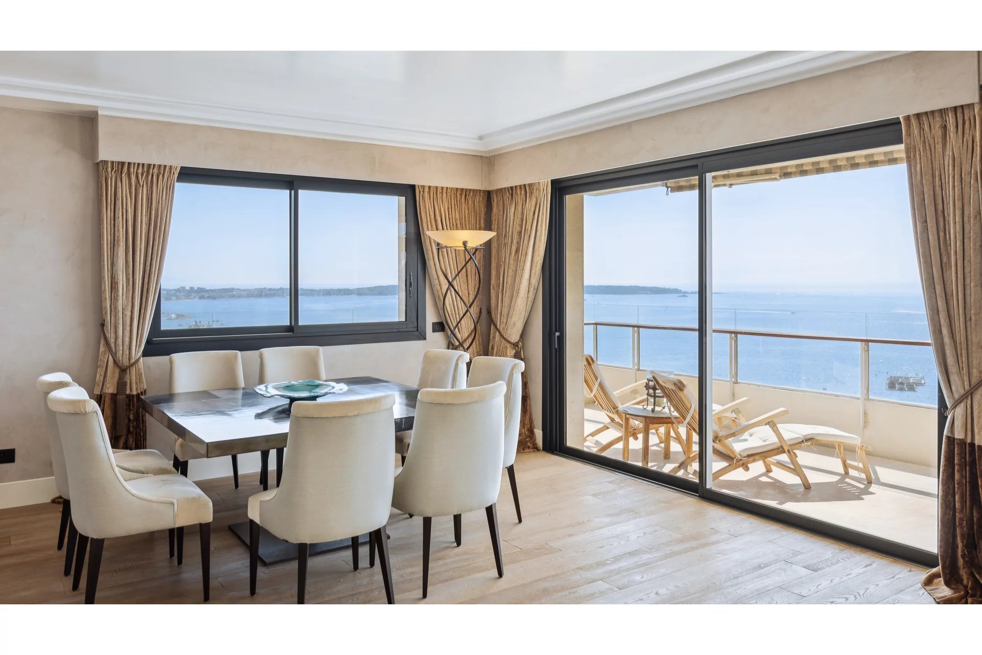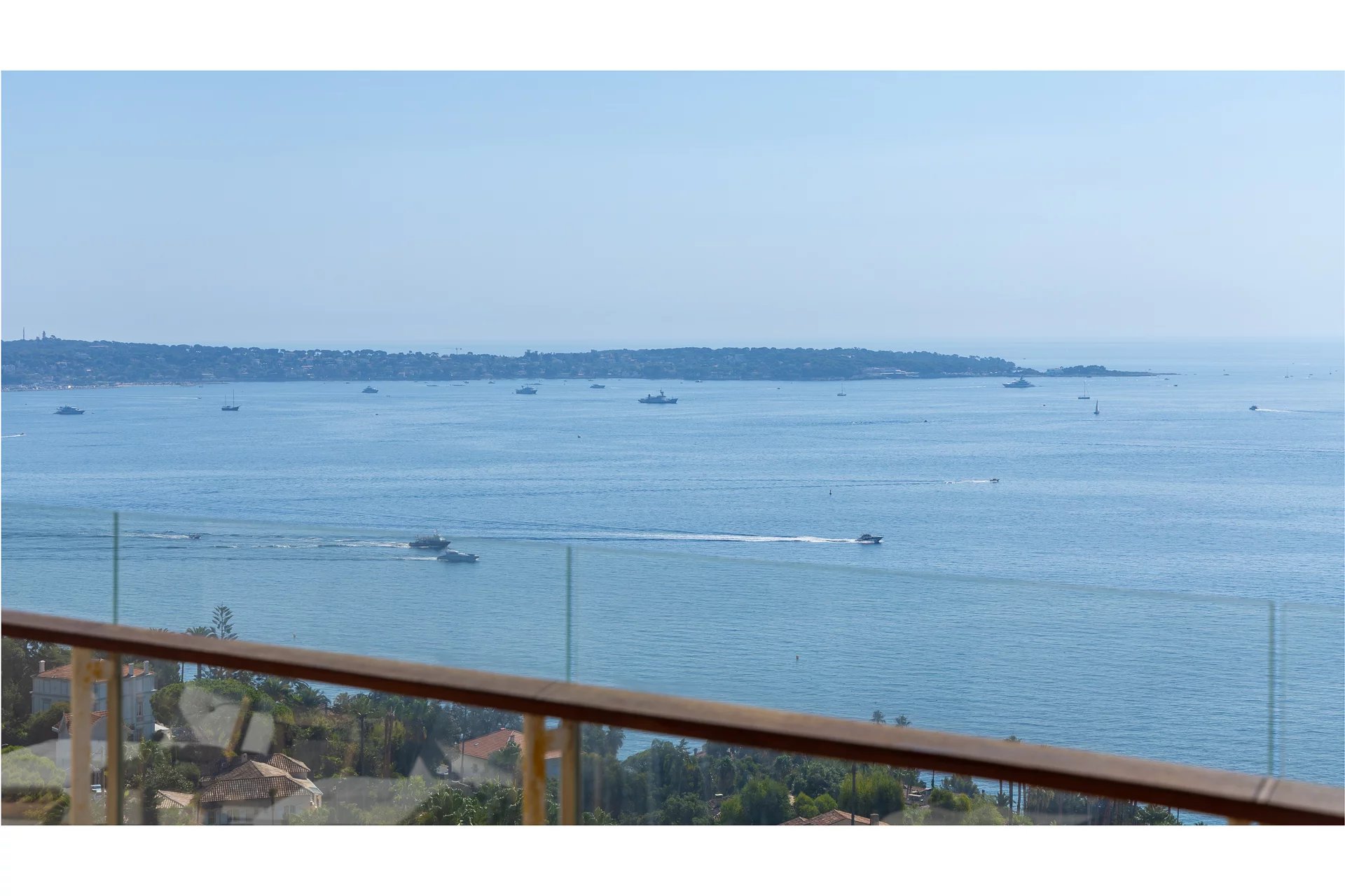 Generously sized, the large, bright living room opens onto a magnificent 47.50 m2 corner terrace, offering breathtaking panoramic views of the sea, Cap d’Antibes, and the Bay of Nice.