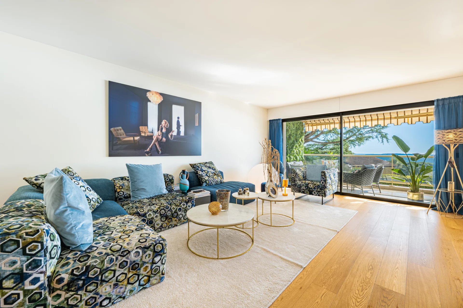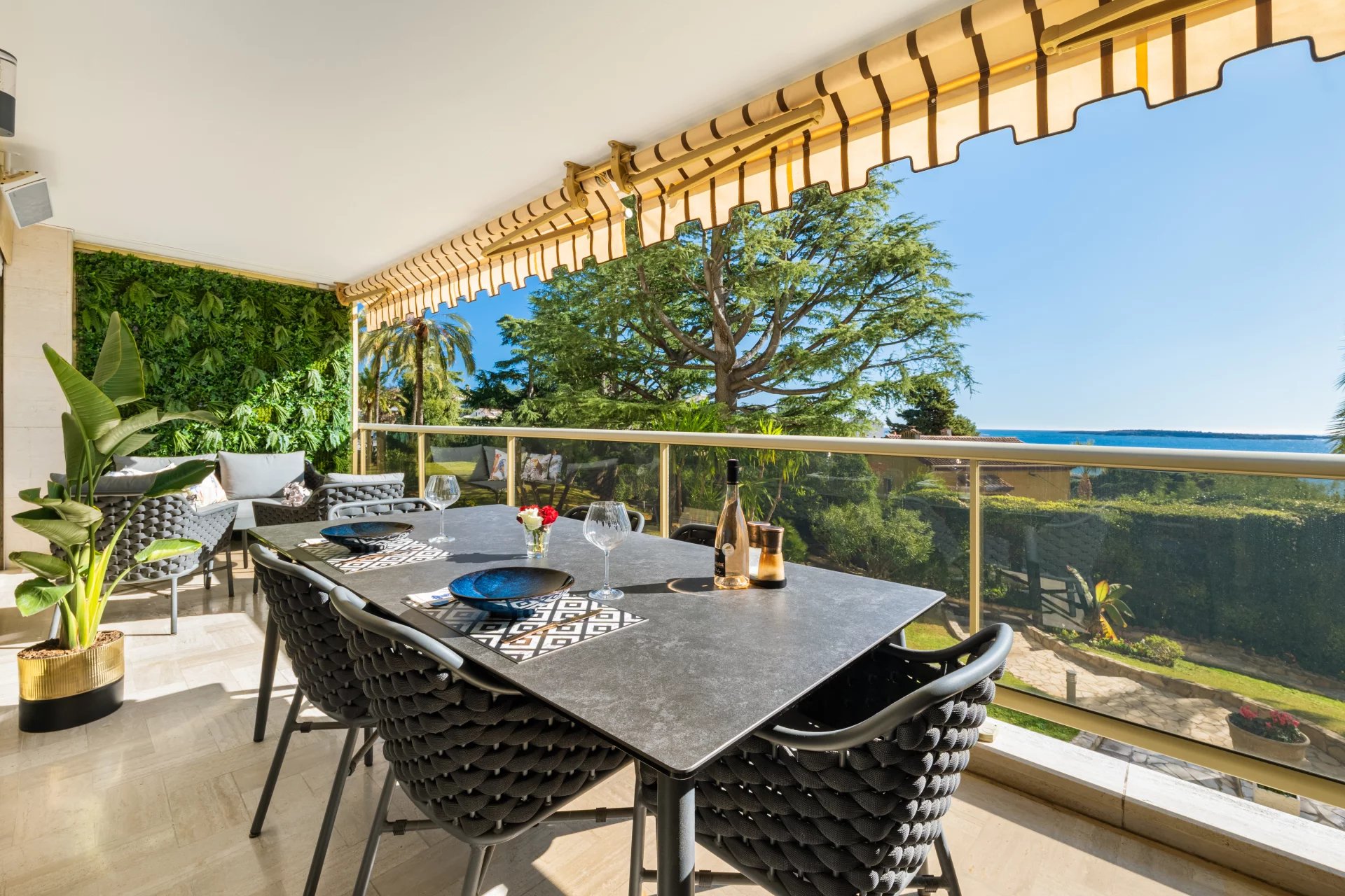 The apartment comprises a bright living room with a fully equipped open-plan kitchen, opening onto a large terrace offering breathtaking views of the sea and the Lerins Islands.