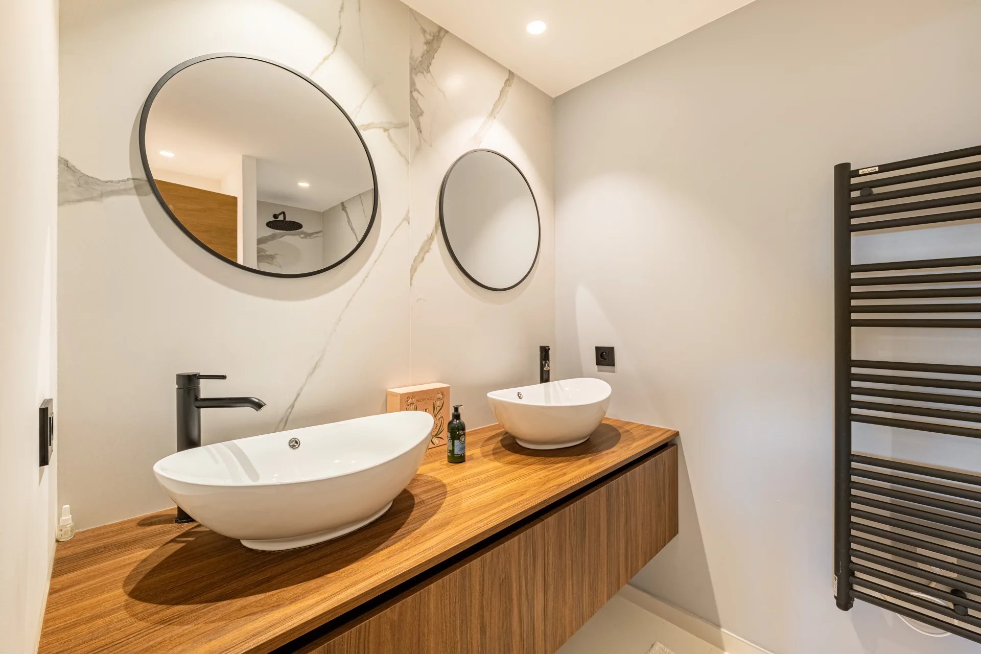 The sleeping area, located at the rear of the apartment, comprises two bedrooms: a master suite with dressing room and shower room with toilet, and a second bedroom with its own shower room. Guest toilet.
