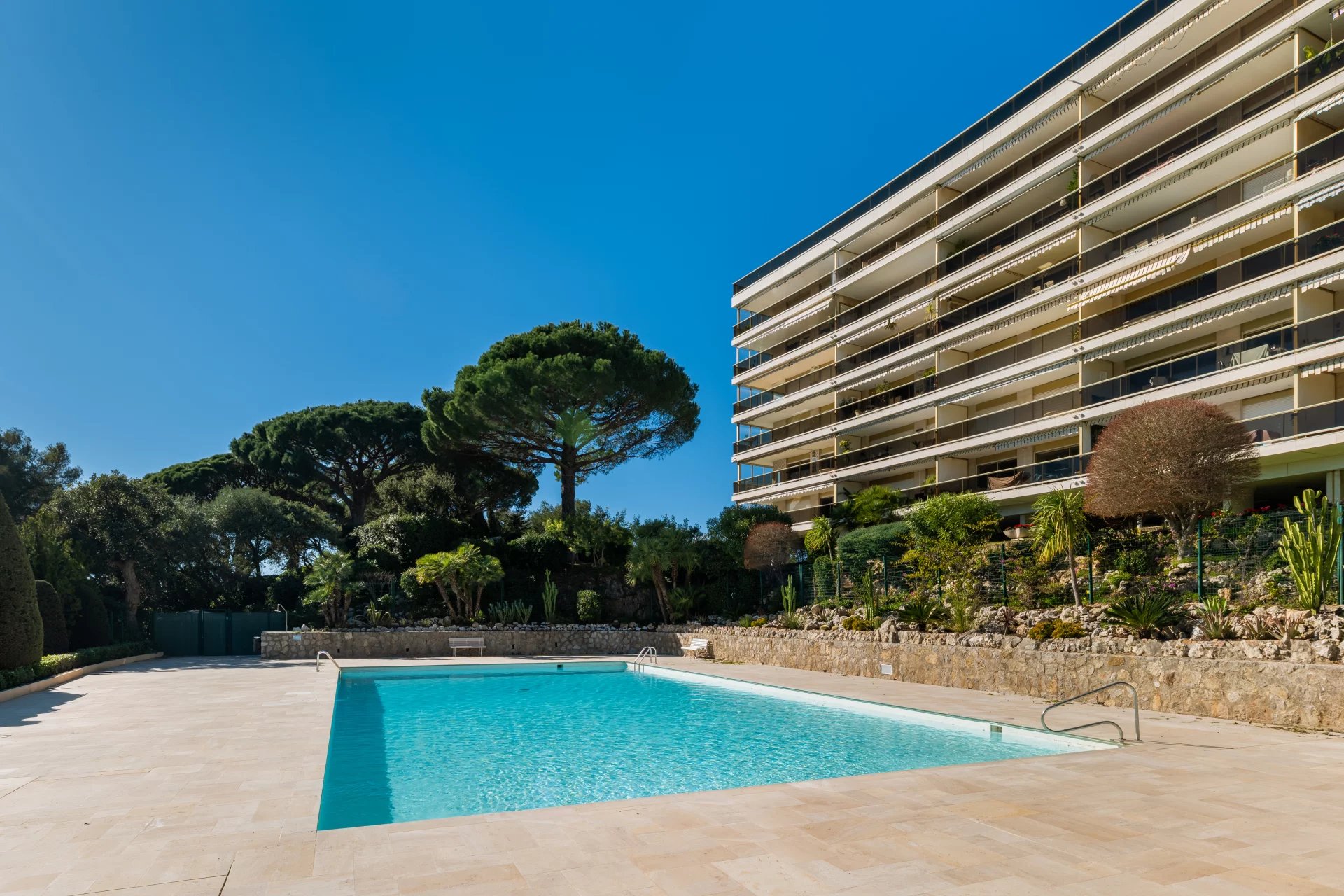 Magnificent, fully renovated 85m2 2 bedroom apartment located in a luxury residence with a swimming pool and tennis court in the sought-after Croix des Gardes area. Absolutely quiet, yet close to amenities and beaches.