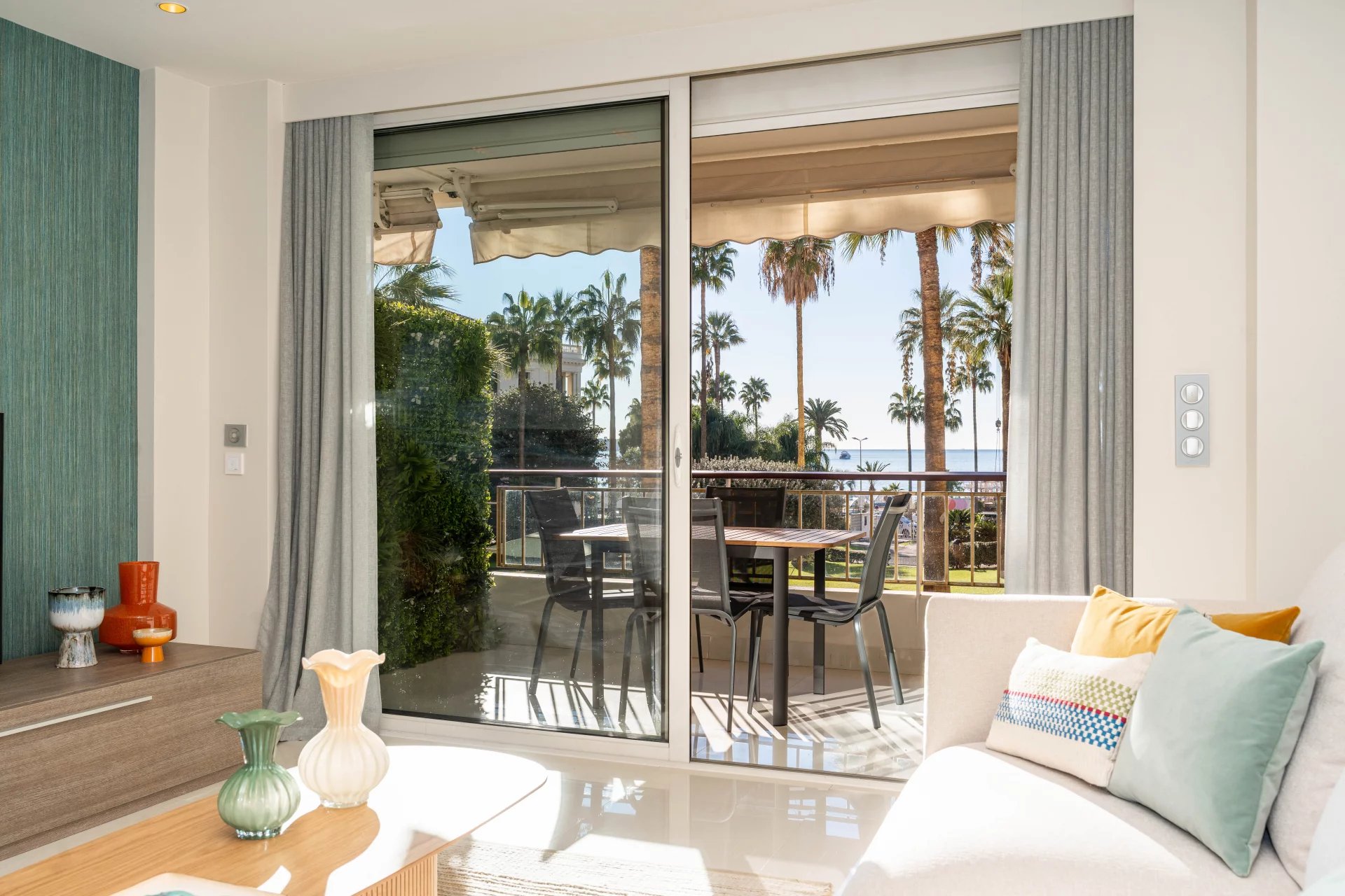 In the heart of the Grand Hotel gardens, on the prestigious Croisette, discover this superb fully renovated, dual-aspect three-room apartment with a total surface area of 82 m2. It features an 8 m2 south-facing terrace offering a pleasant view over the park and the sea.