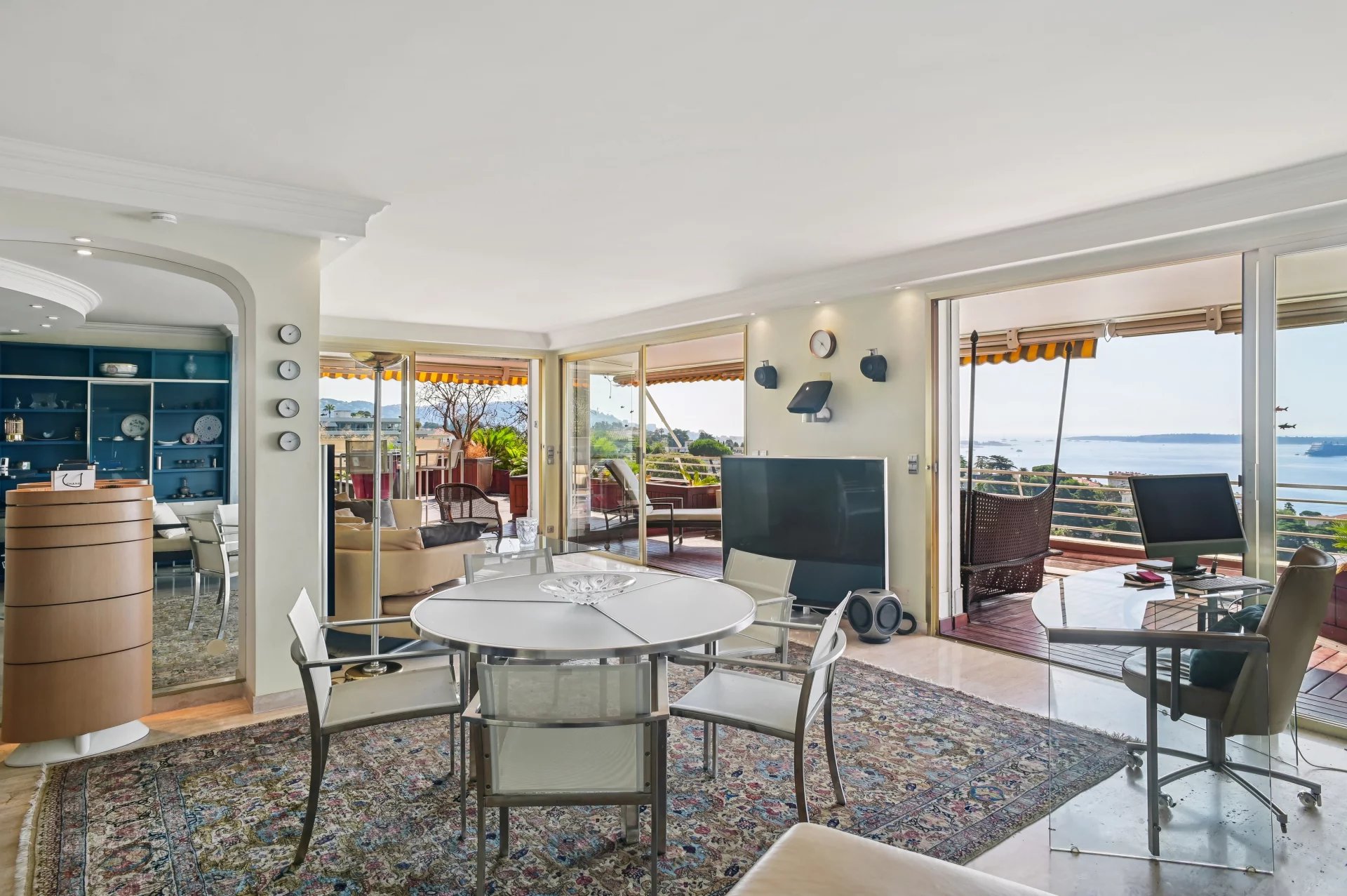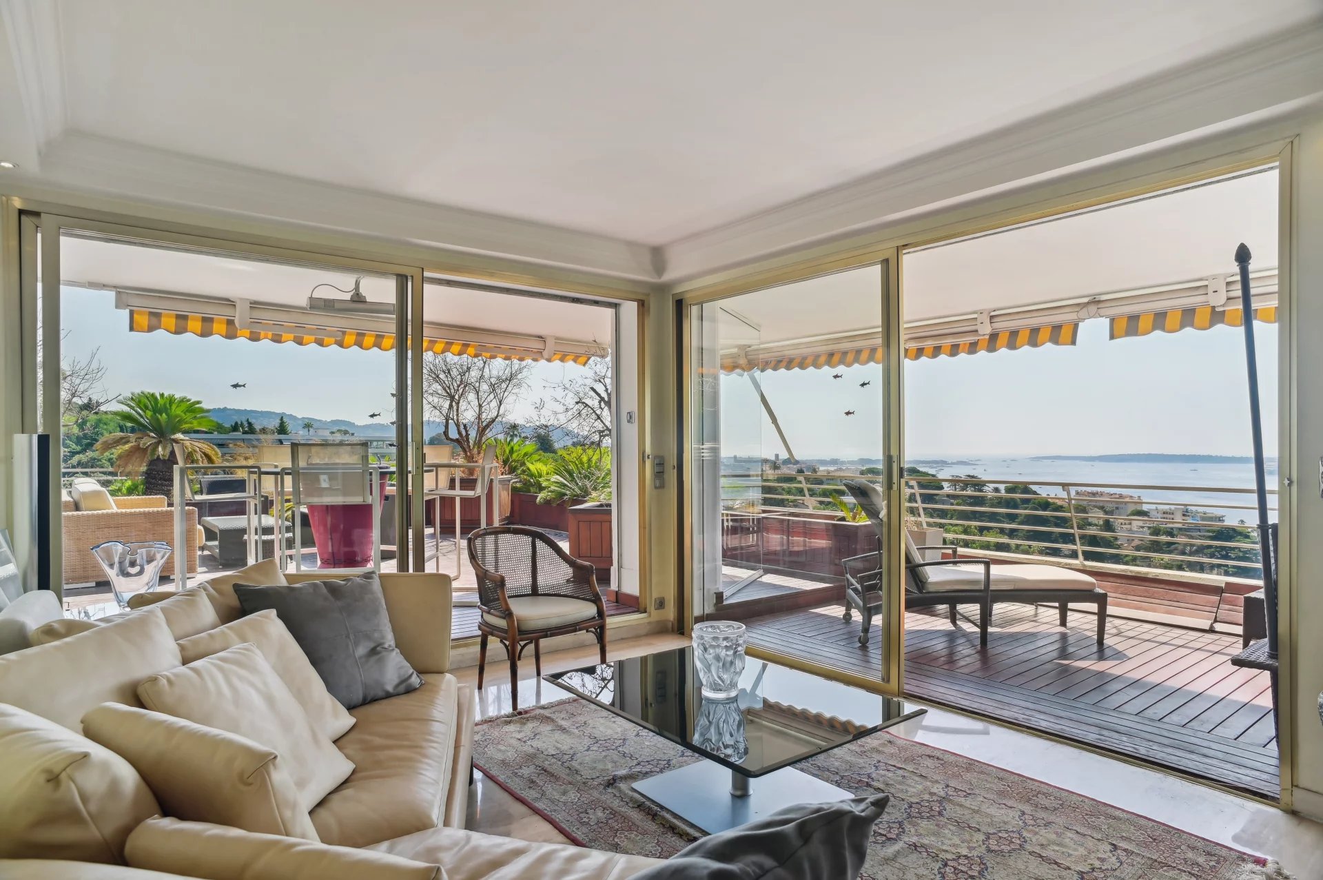 This property benefits from a large terrace of over 130 m2 with jacuzzi and enjoys panoramic views of the sea, the Lerins islands, Le Suquet, Palm Beach and the Estérel massif.