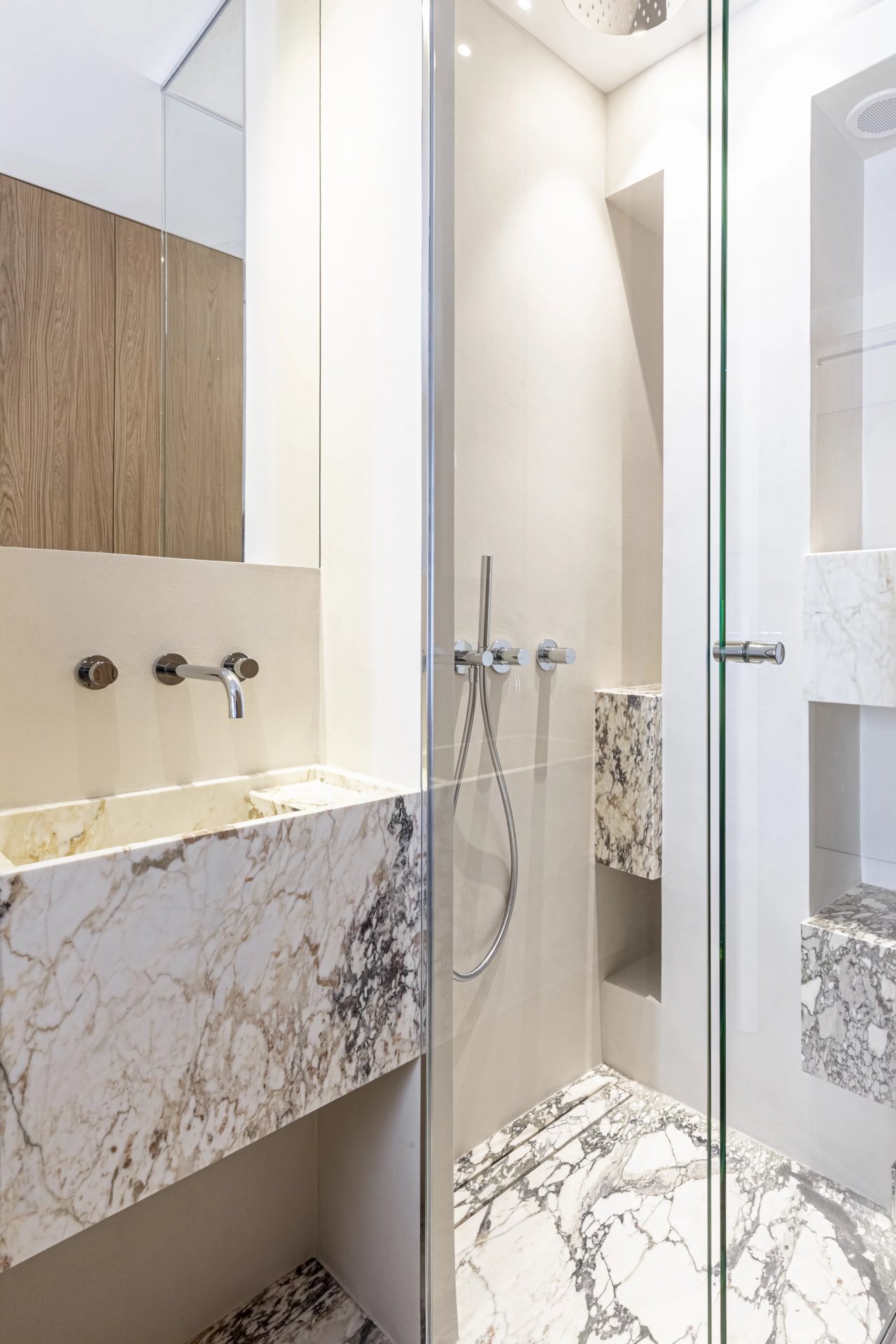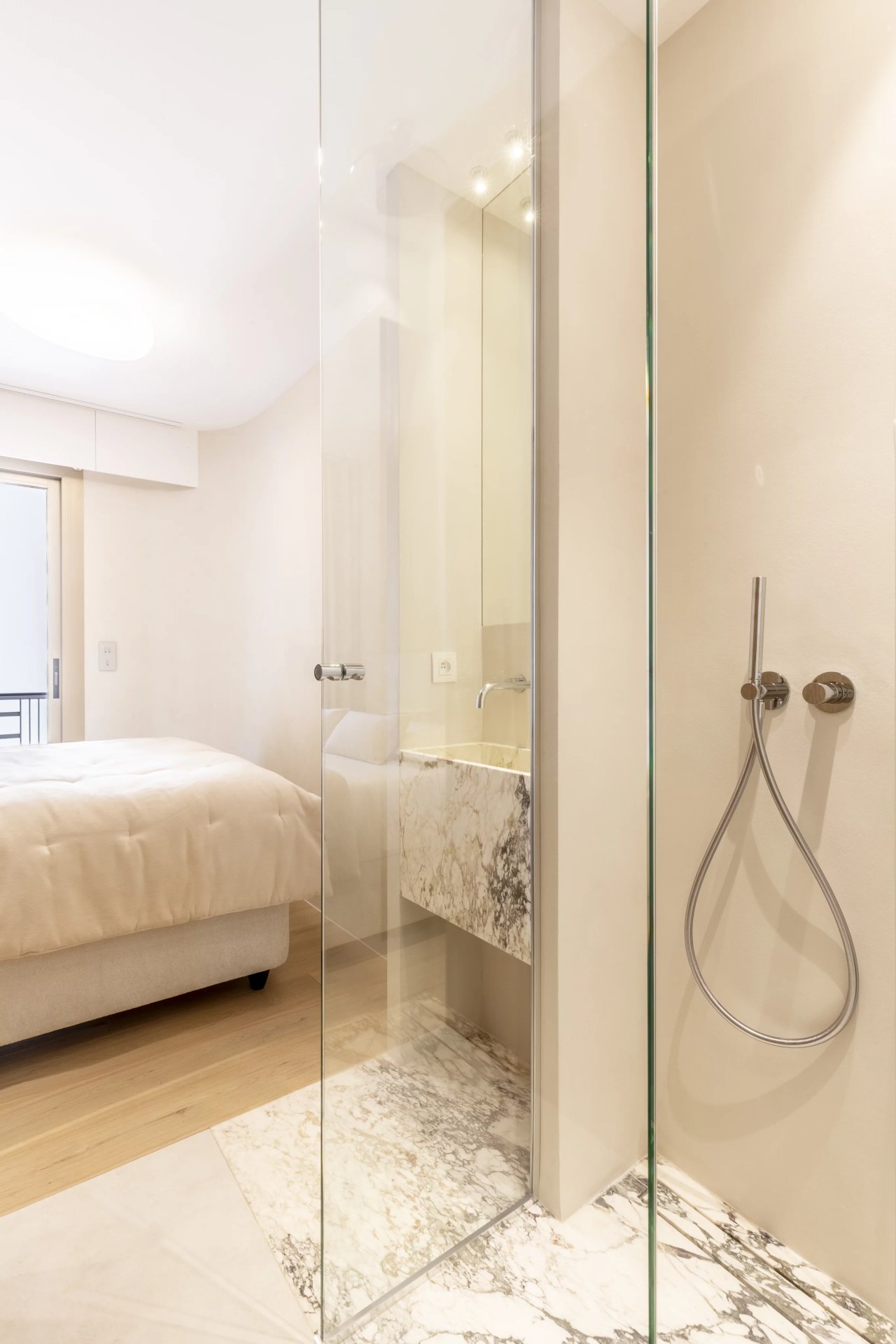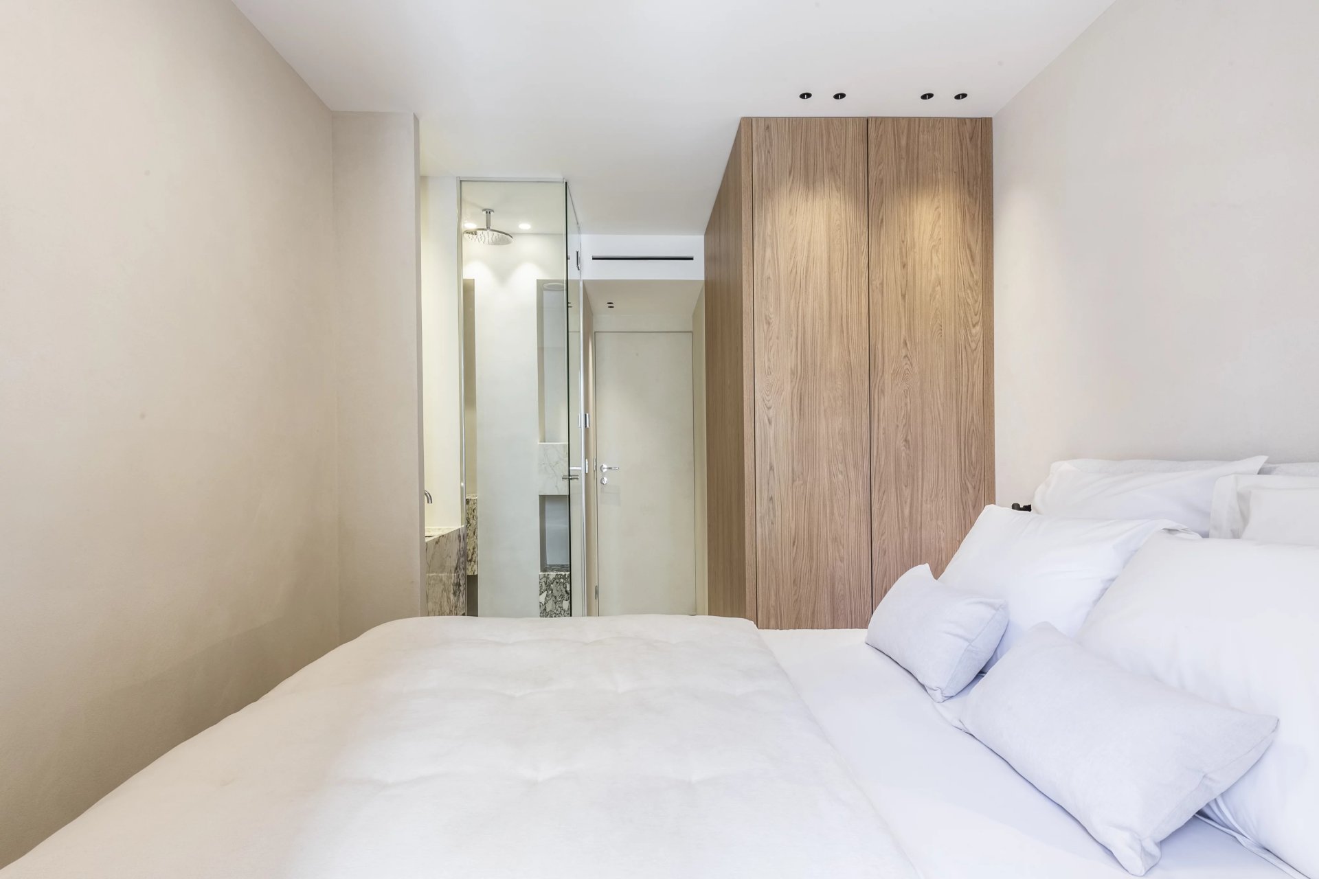 The 56m2 apartment comprises an entrance hall, a bright living room with open kitchen, two masters bedrooms each with private shower room, and an 11.3m2 terrace with unobstructed sea views, facing southwest.