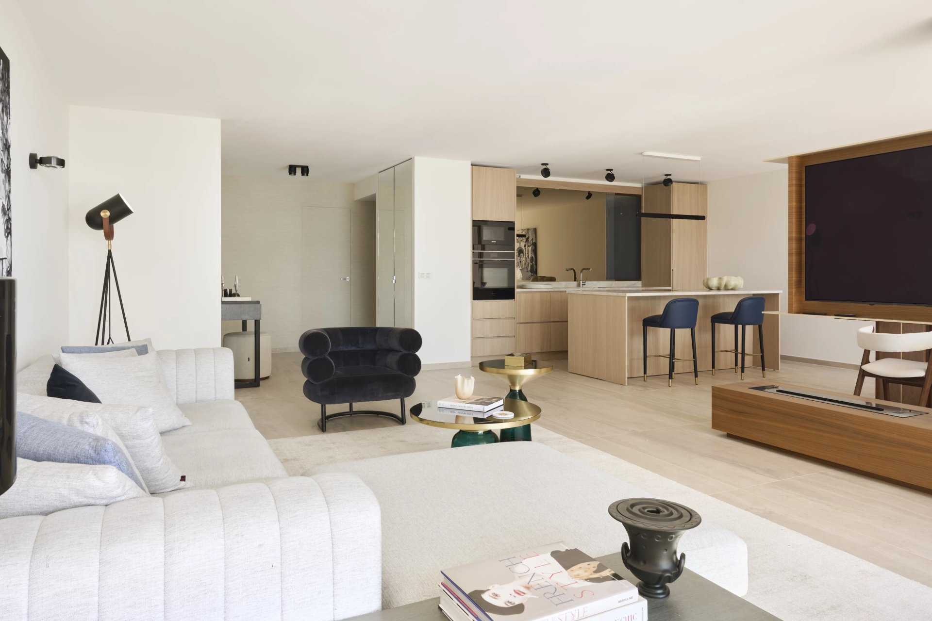 The apartment has been completely renovated with high-end features and refined contemporary decor. It includes a spacious 54 m2 living room with an open kitchen, two bedrooms each with their own bathroom and independent WC en suite, as well as numerous closets.