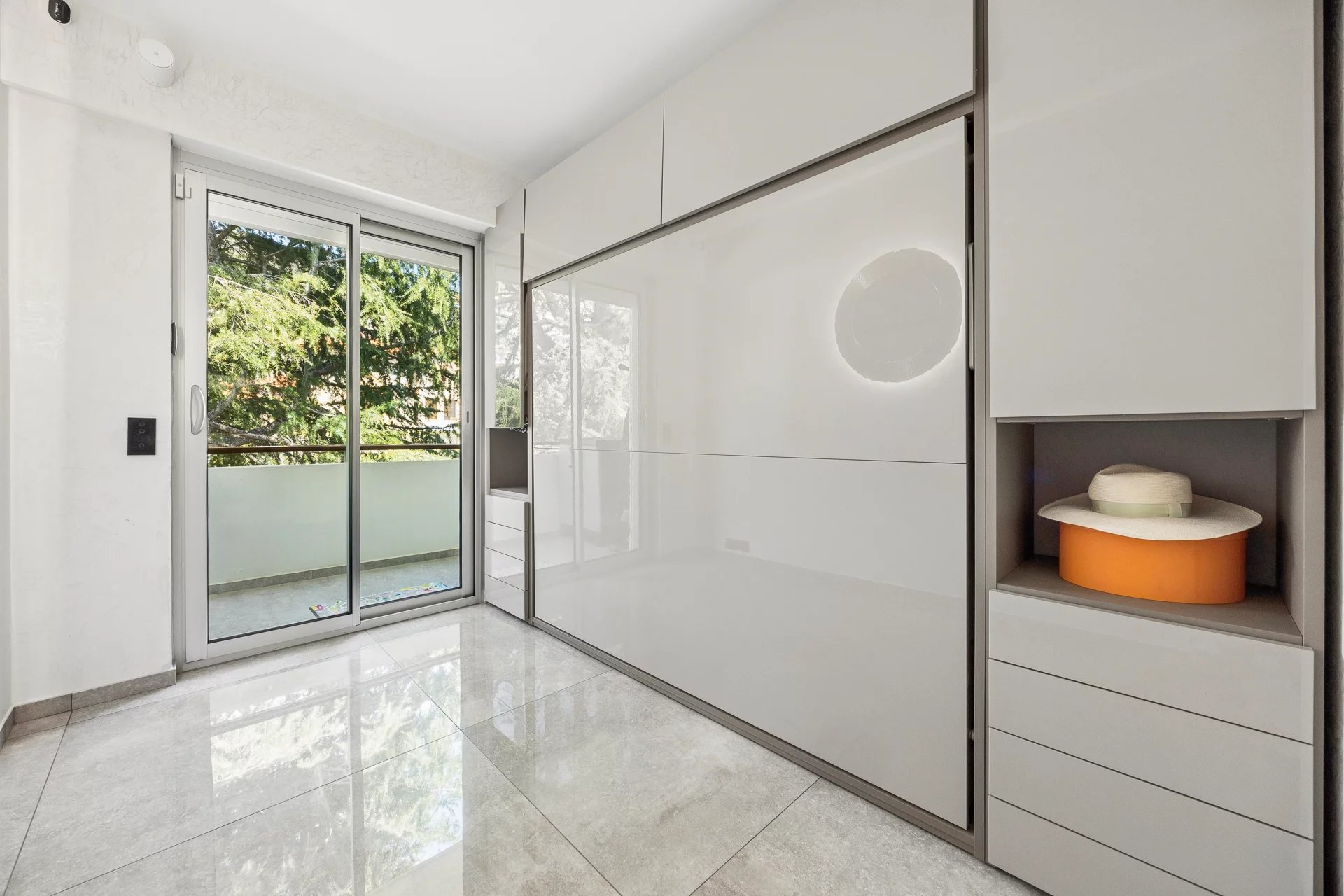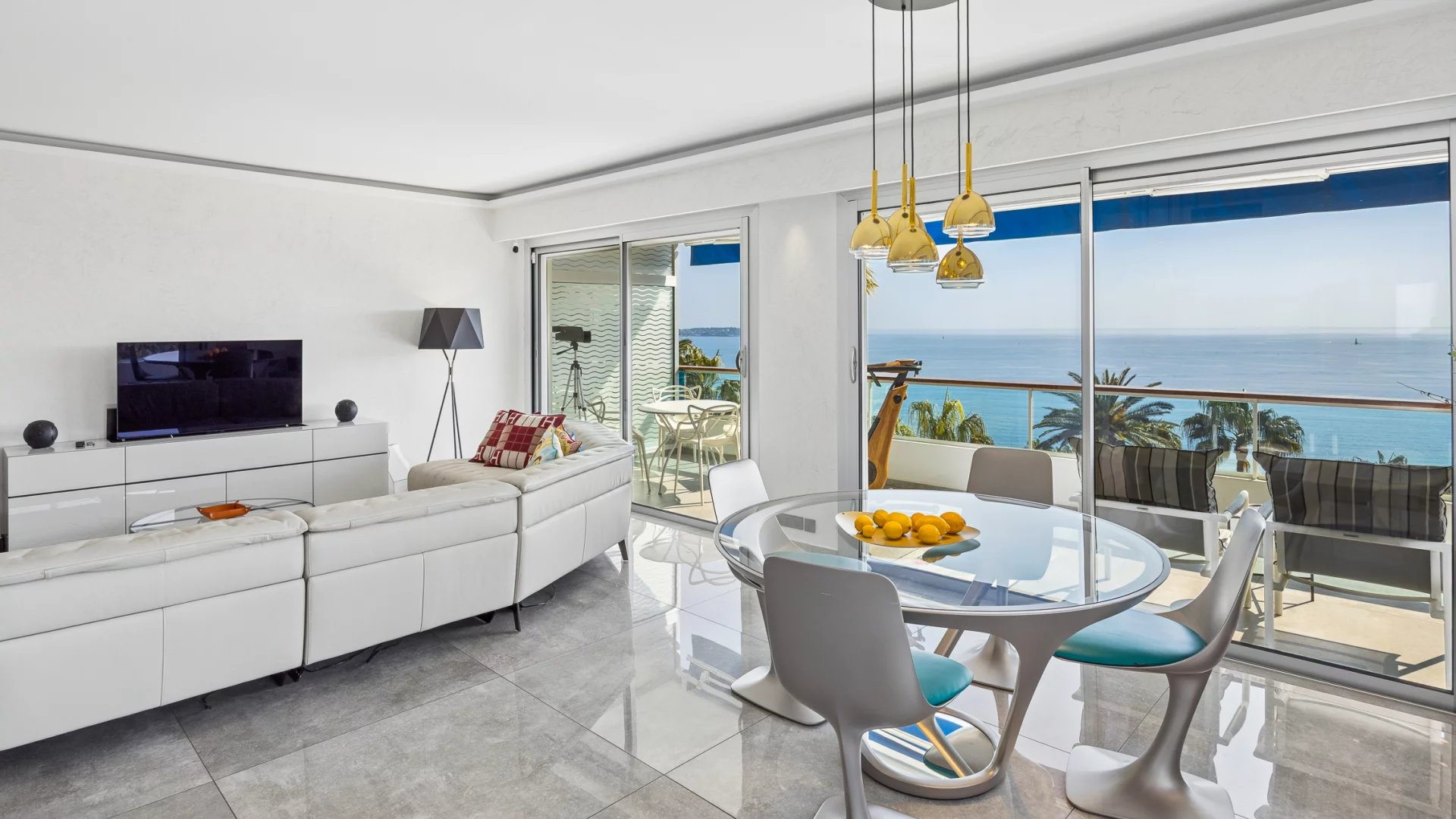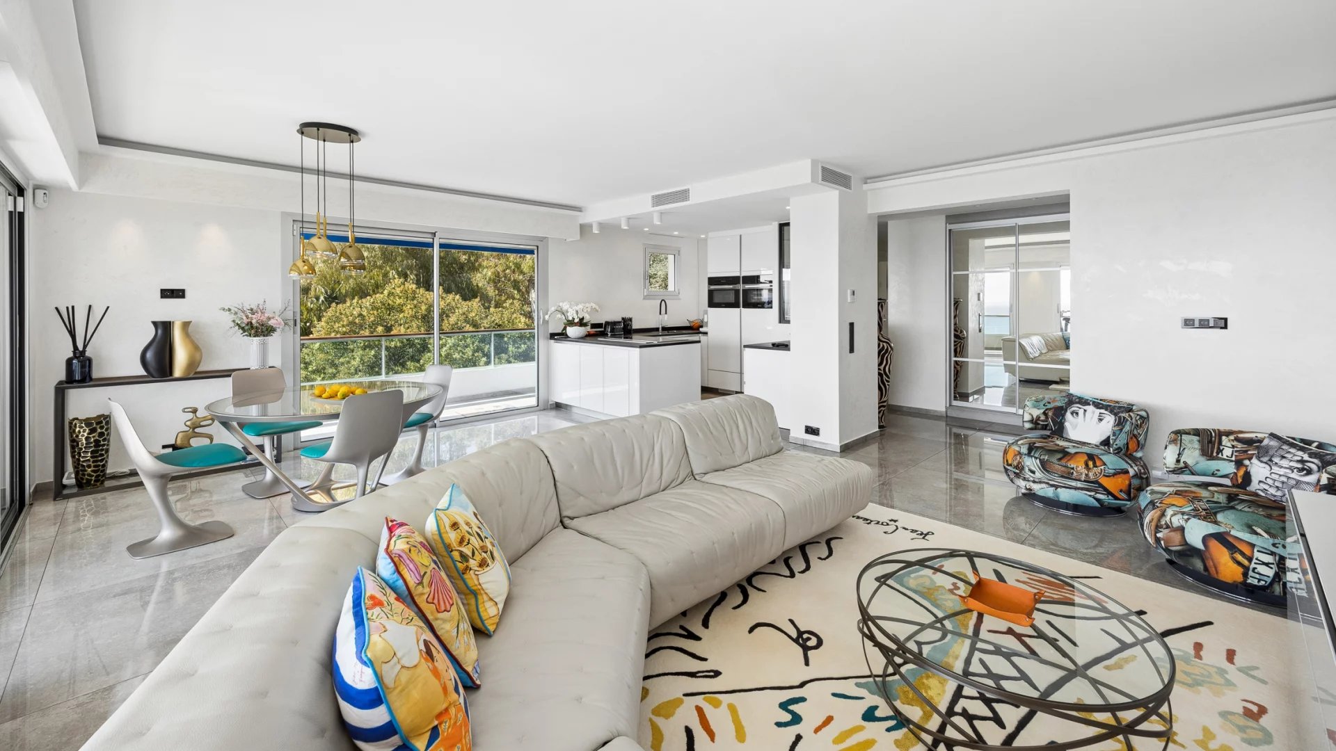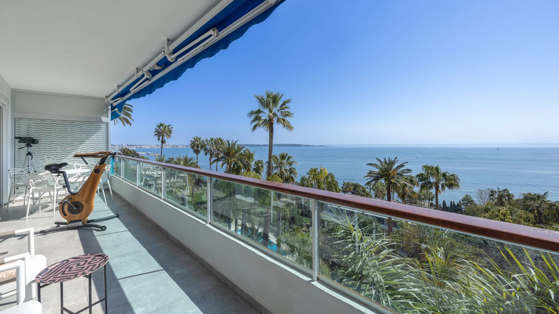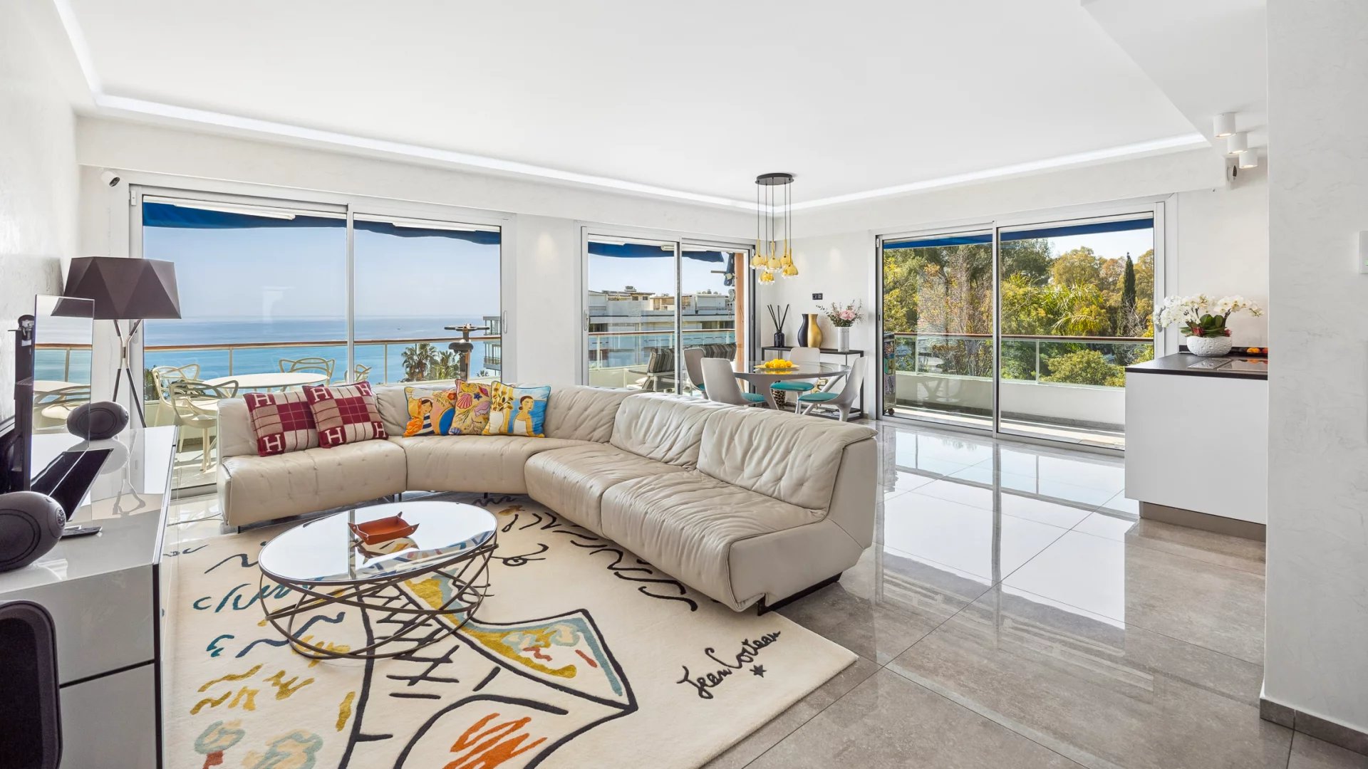 The apartment, in excellent condition, is a true haven of peace. Its bright living room opens onto a terrace offering breathtaking panoramic views of the Mediterranean and the Cap d’Antibes. The modern, open-plan kitchen is fully equipped, ideal for food lovers.