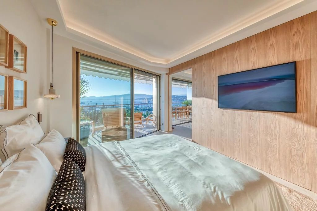 It boasts a breathtaking view from its terrace overlooking the Bay of the Lerins Islands to the Esterel Massif. Includes a cellar and a garage.