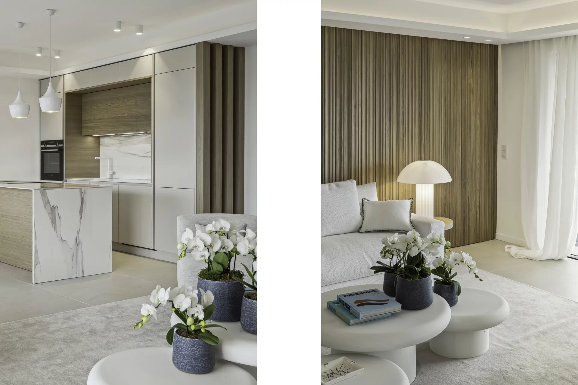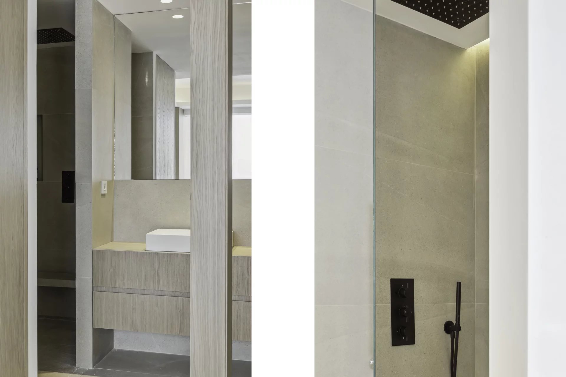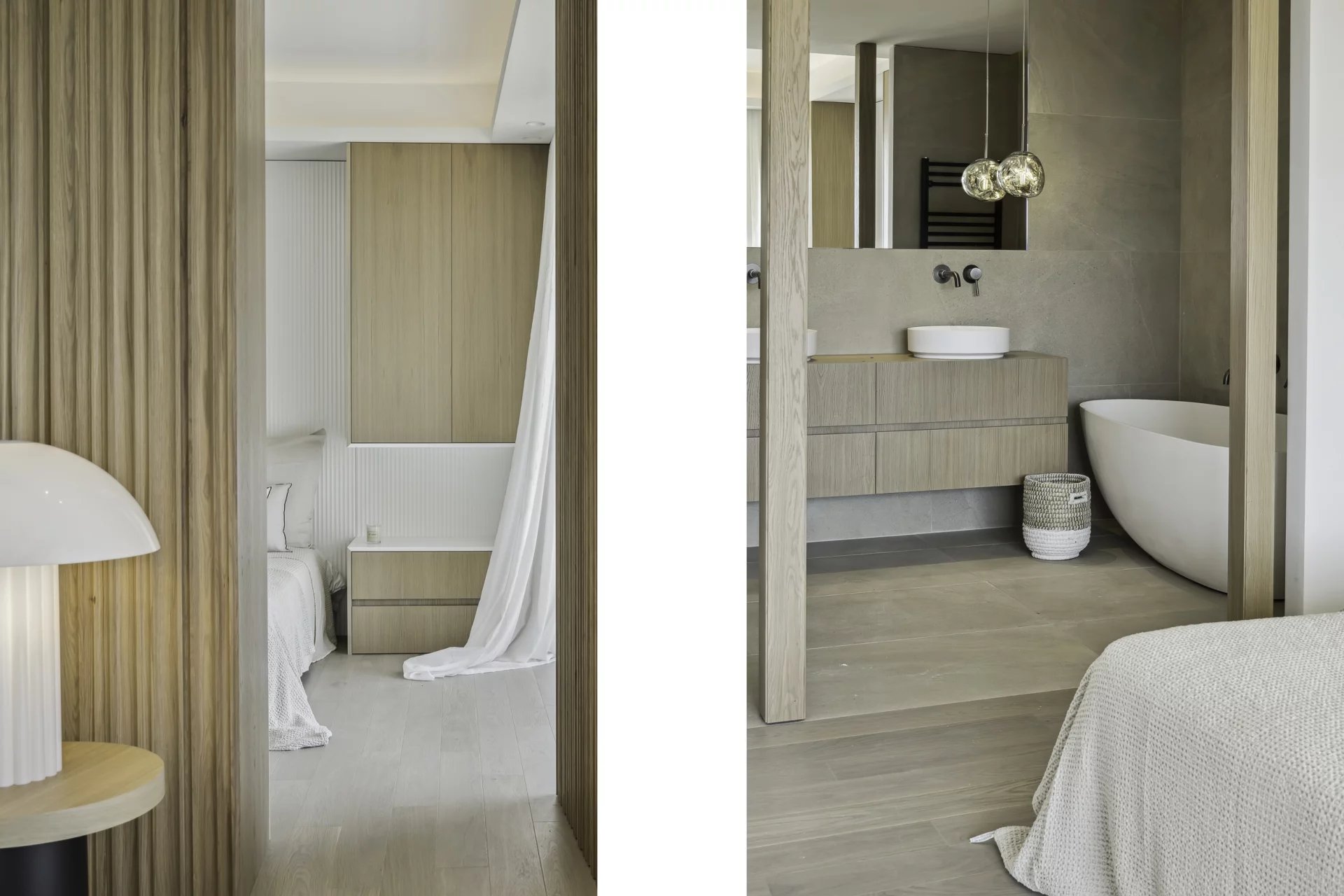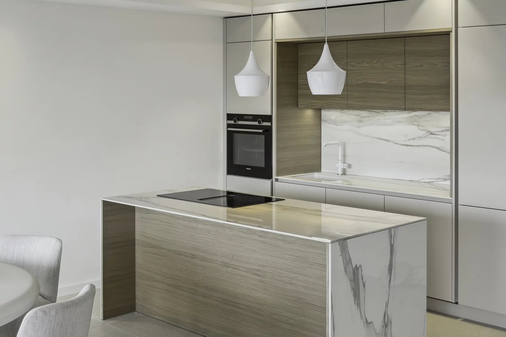Luxurious finishes, including contemporary parquet flooring, bring a touch of sophistication and warmth to the space.