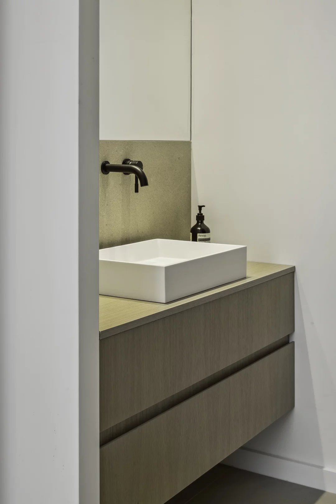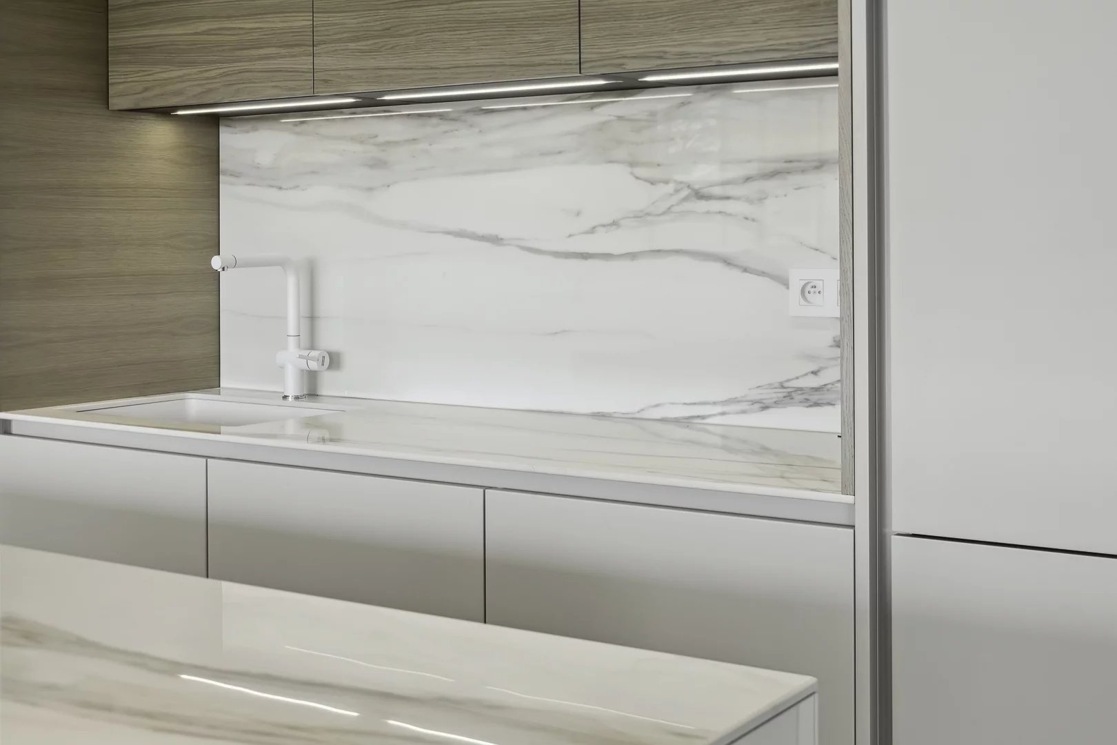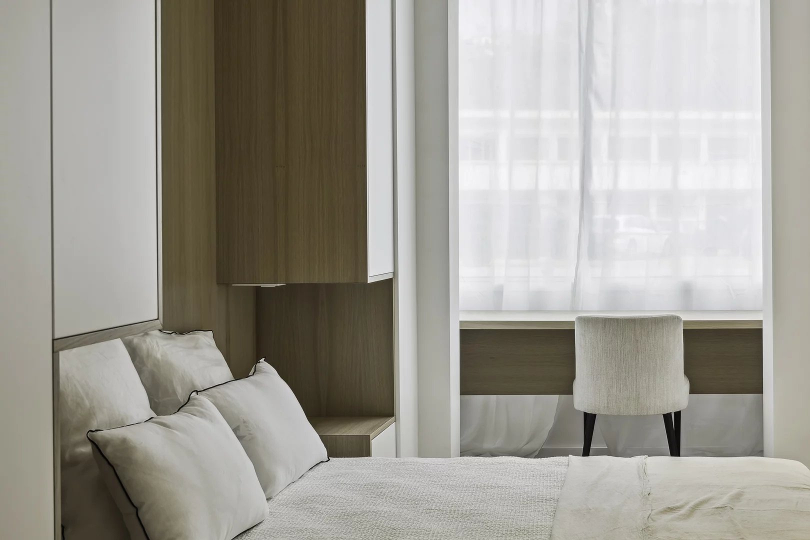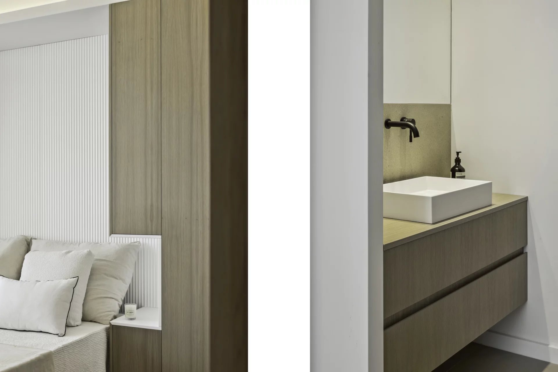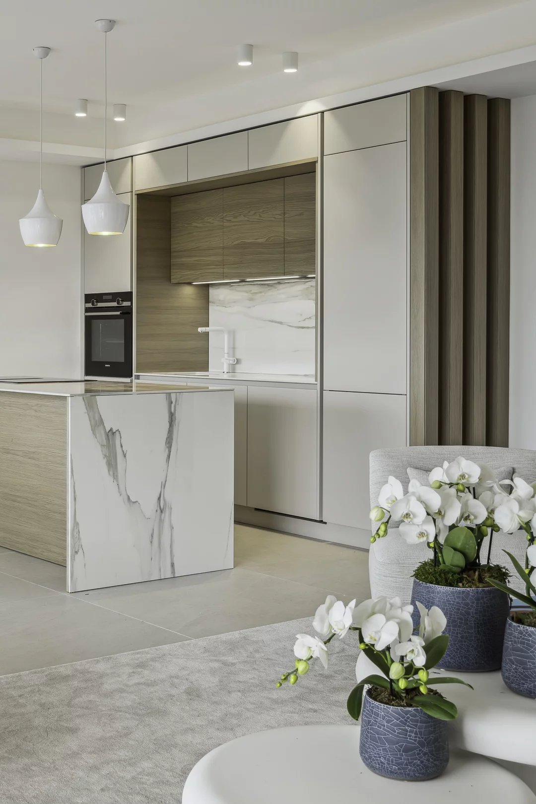 Luxurious finishes, including contemporary parquet flooring, bring a touch of sophistication and warmth to the space.