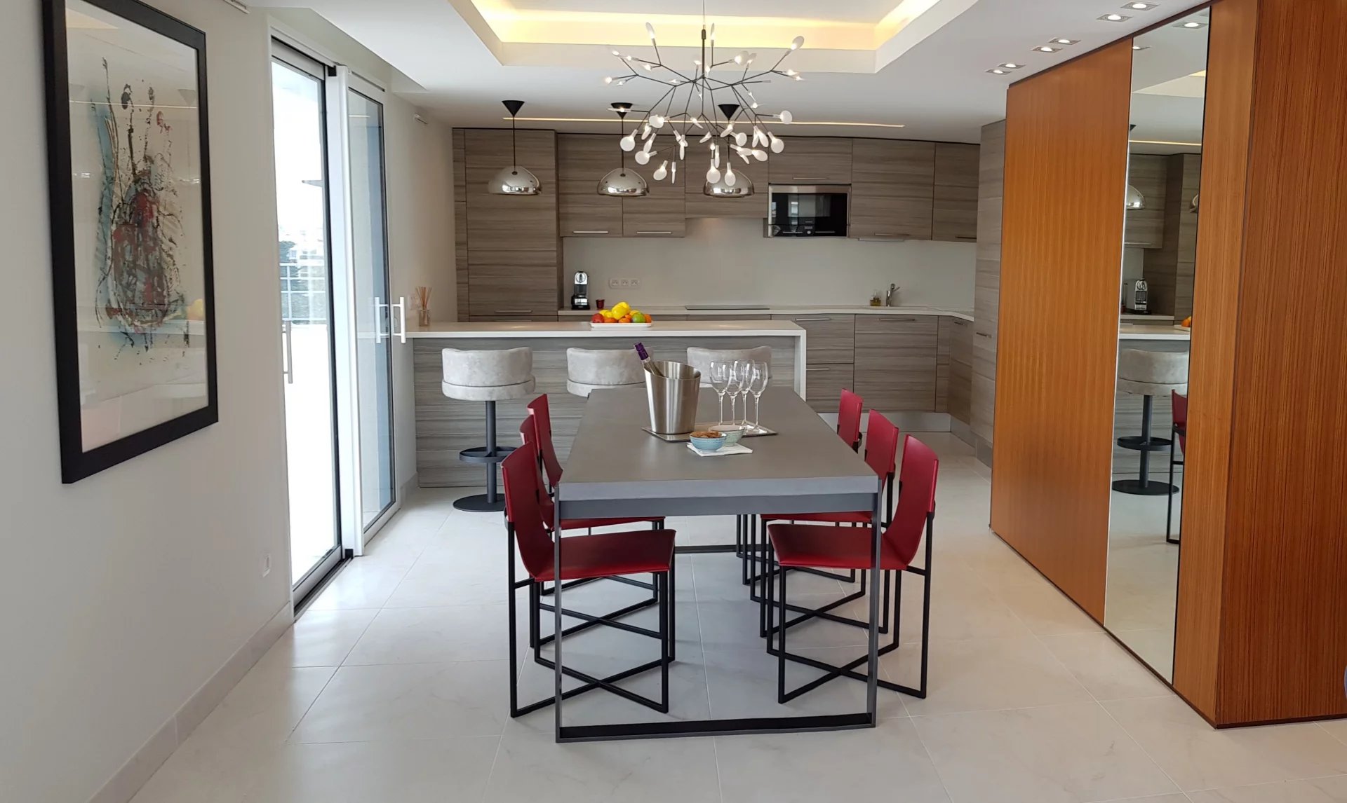 – Dining room with open-plan fitted kitchen opening onto the terrace with sea view