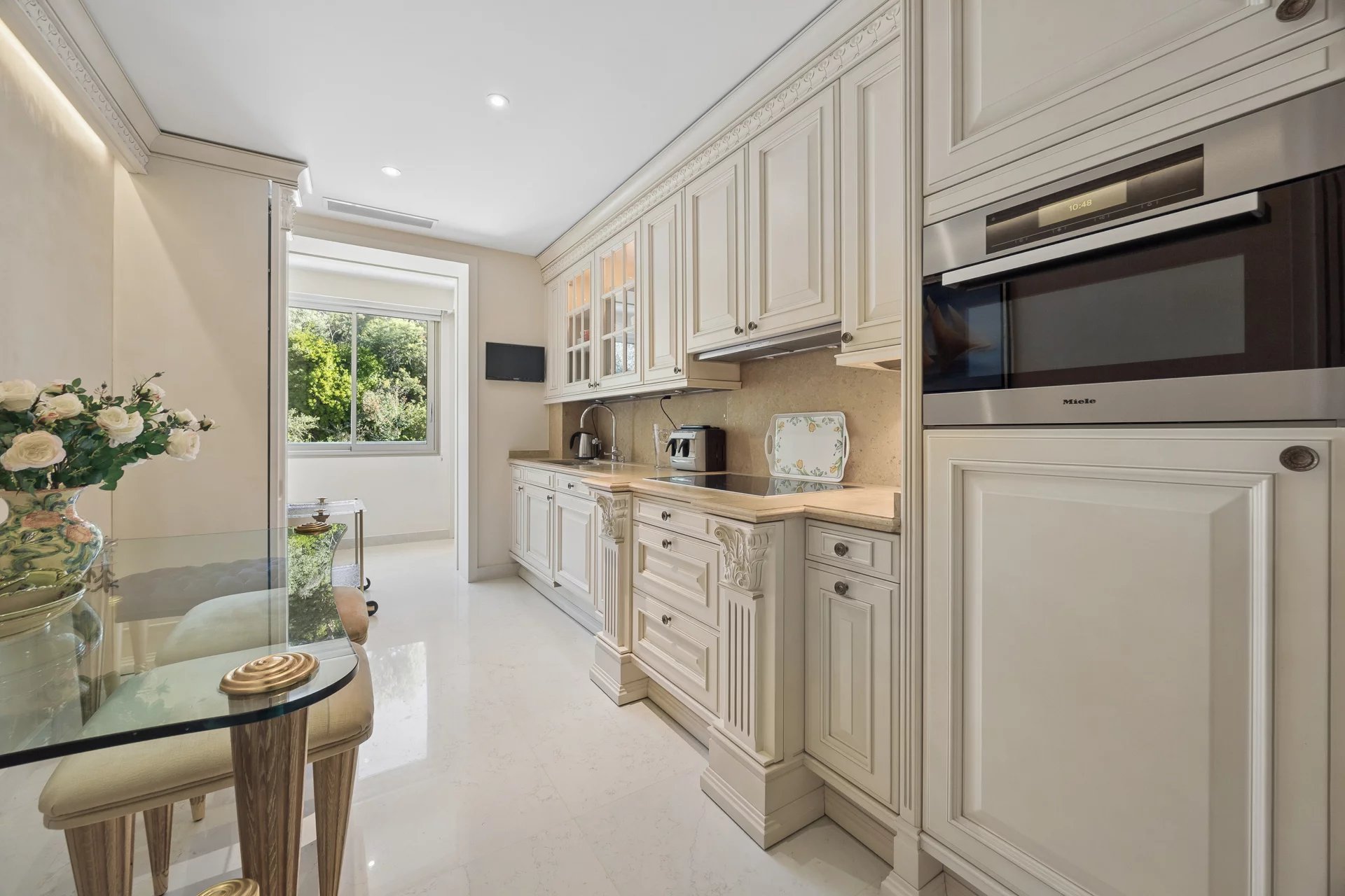 The entrance opens to a spacious and bright living/dining room, with a corner terrace of 37.15 m2 offering breathtaking views of the Mediterranean Sea and the Lerins Islands. The separate, fully equipped kitchen with a loggia is a functional and pleasant space.