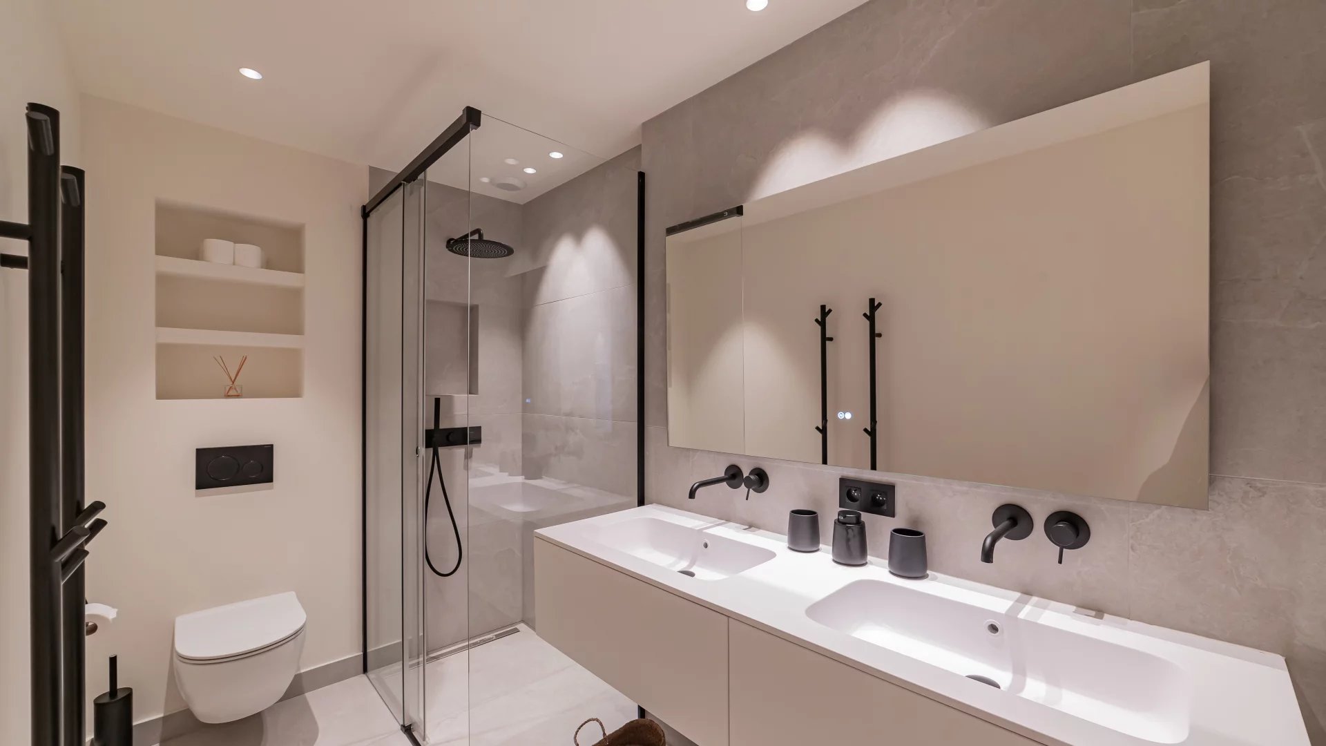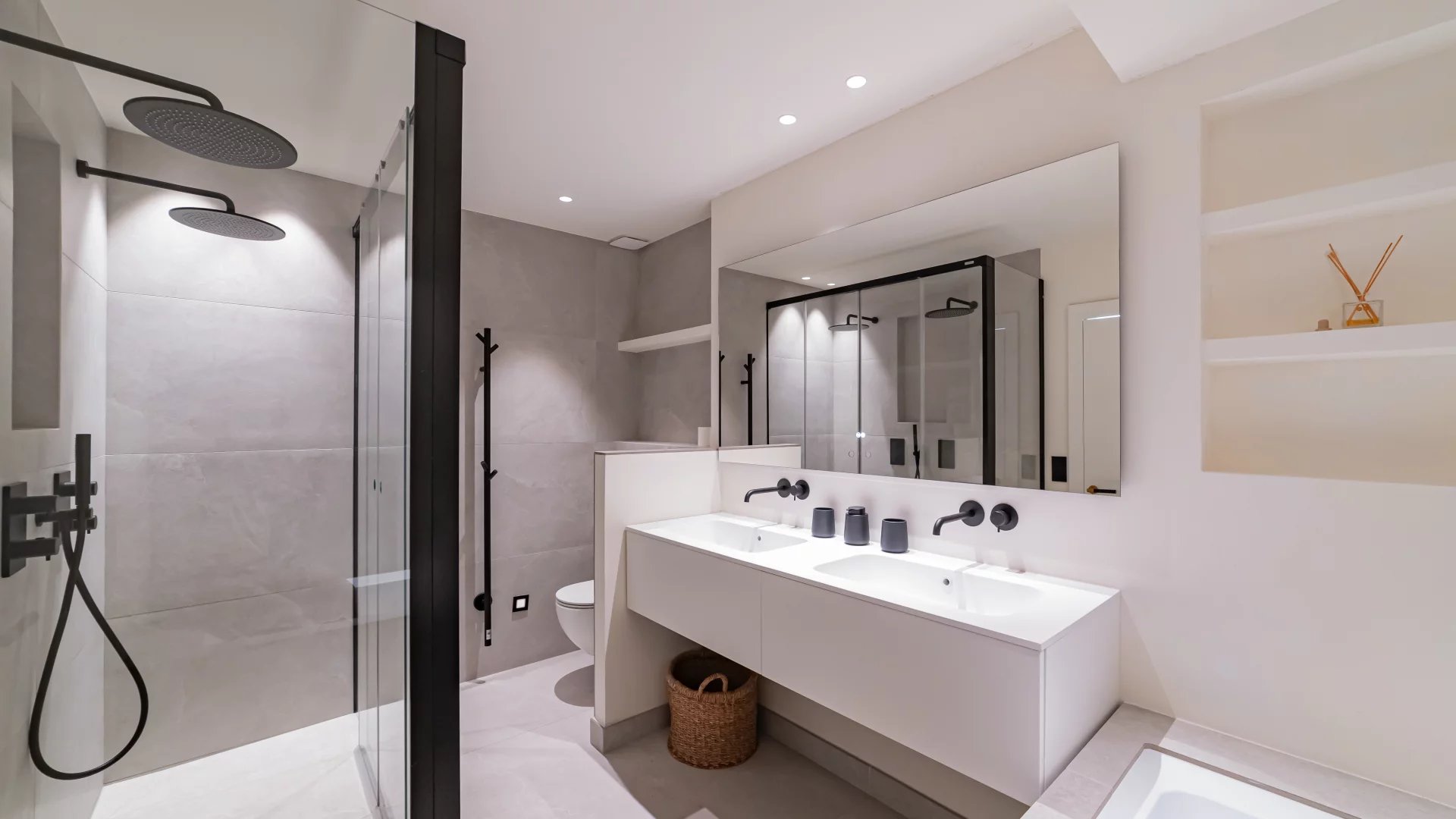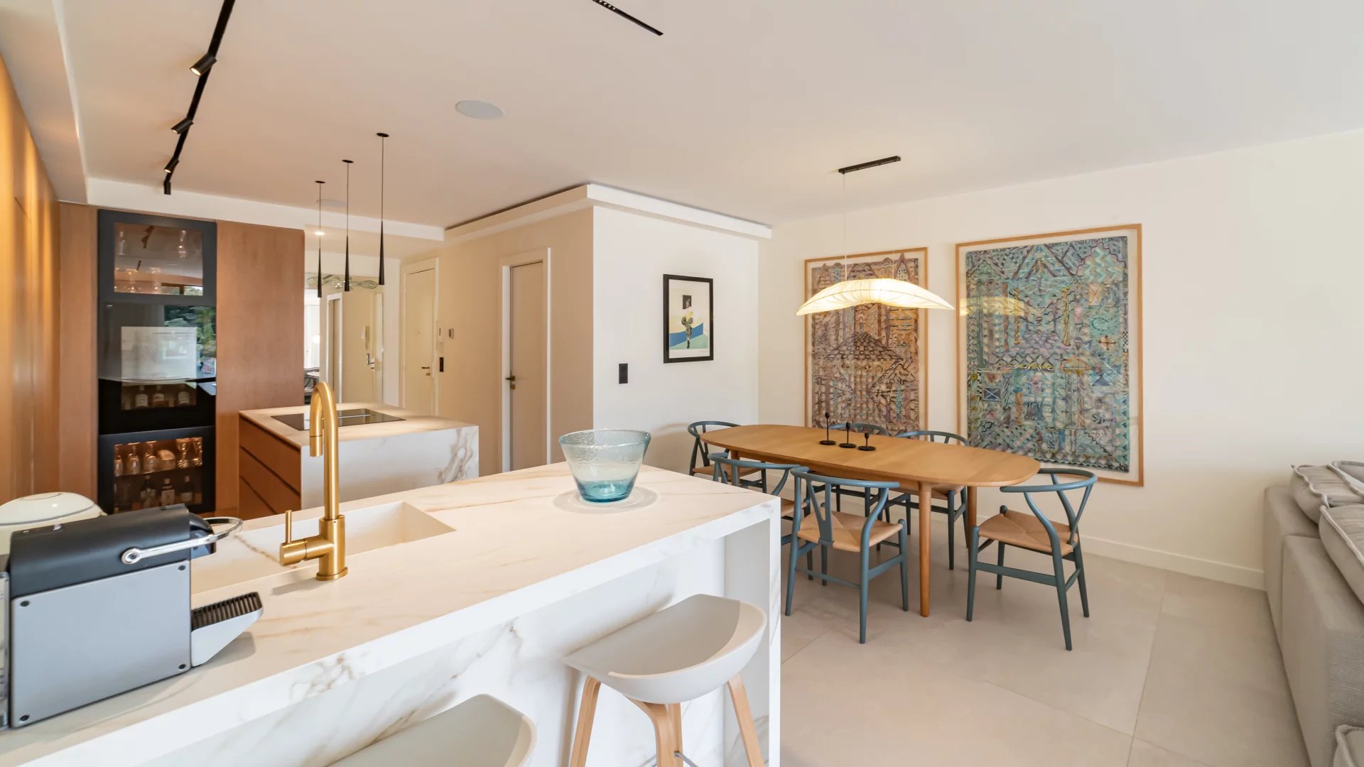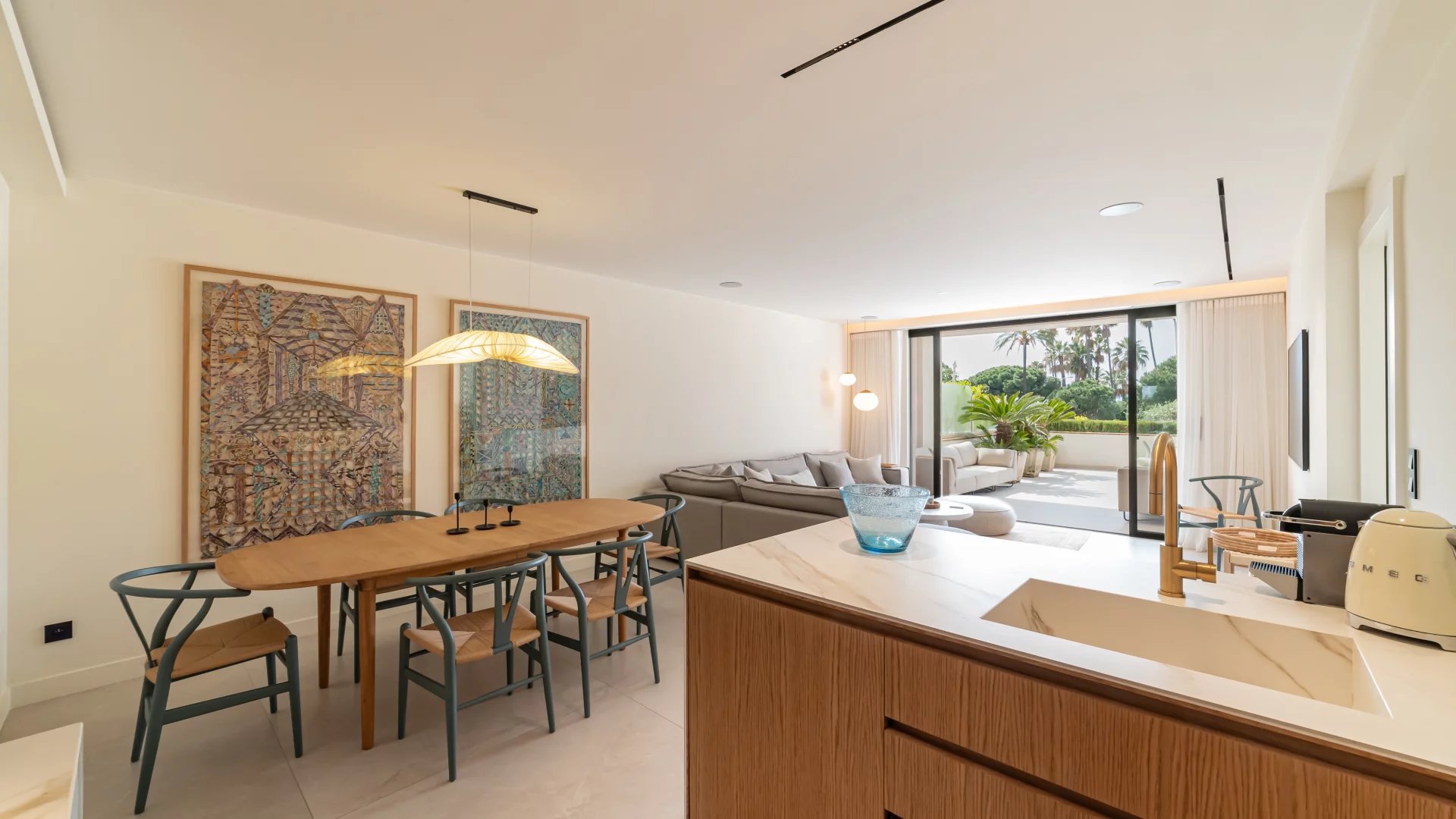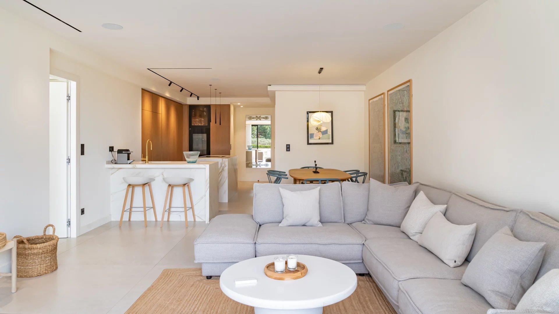 – A light-filled living and dining area, opening seamlessly onto the terrace, with a bespoke open-plan kitchen equipped with top-of-the-range appliances