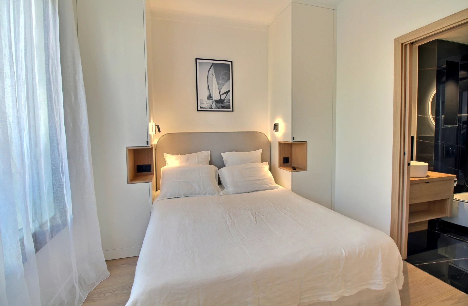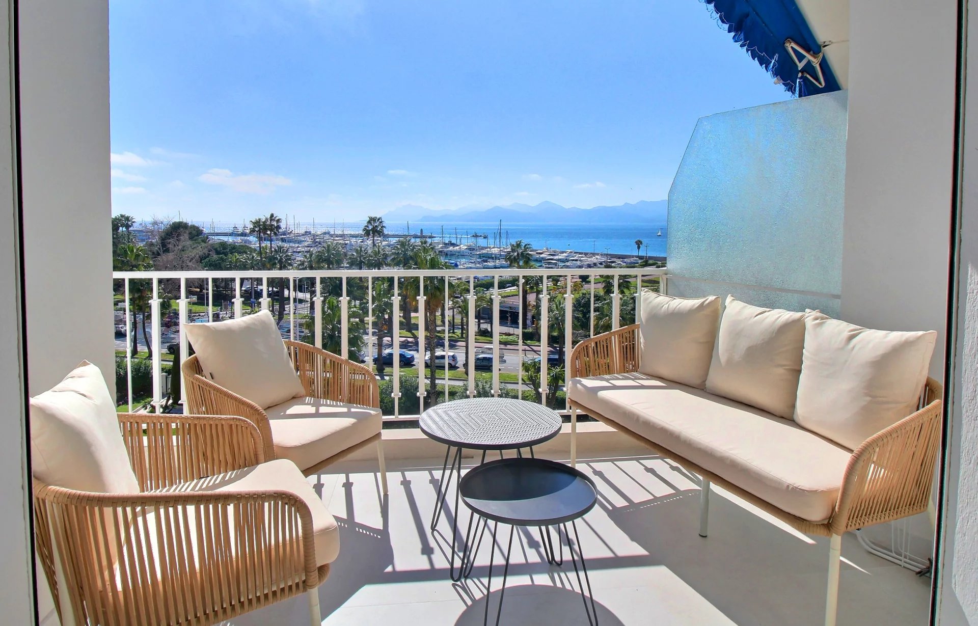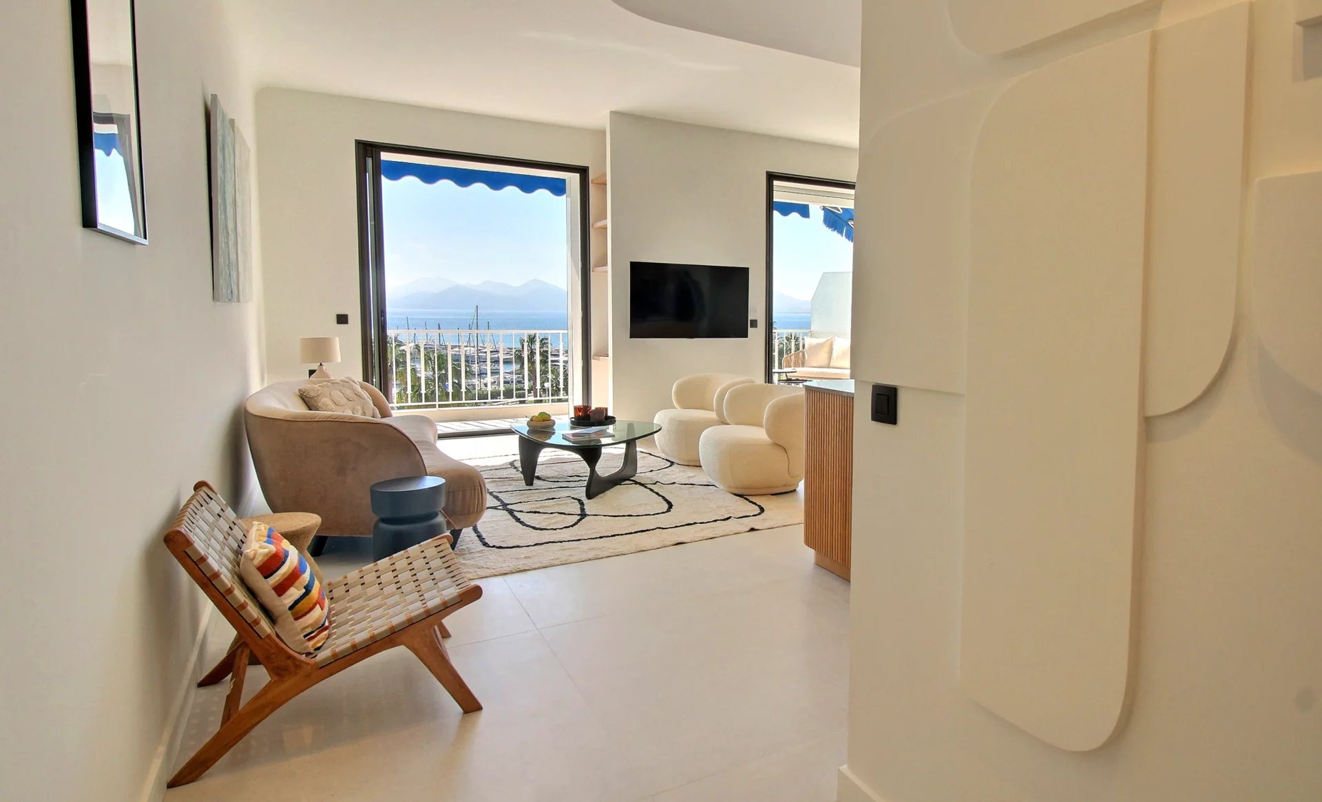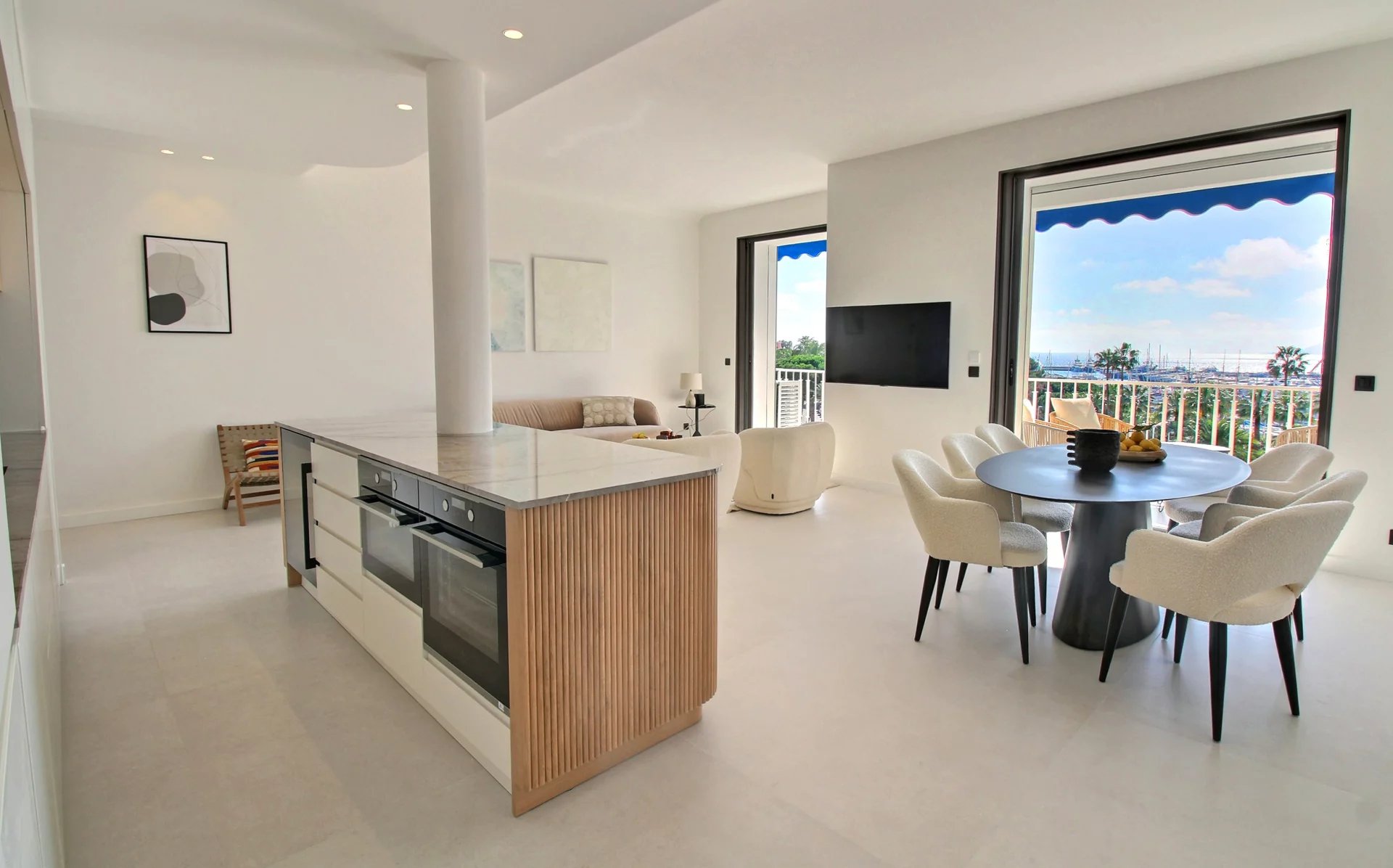 Entirely renovated with refined fittings and quality materials, it comprises 3 bedrooms en suite, a beautiful living room with open kitchen, a terrace with a view of the sea, the Esterel mountains and the Port Canto.