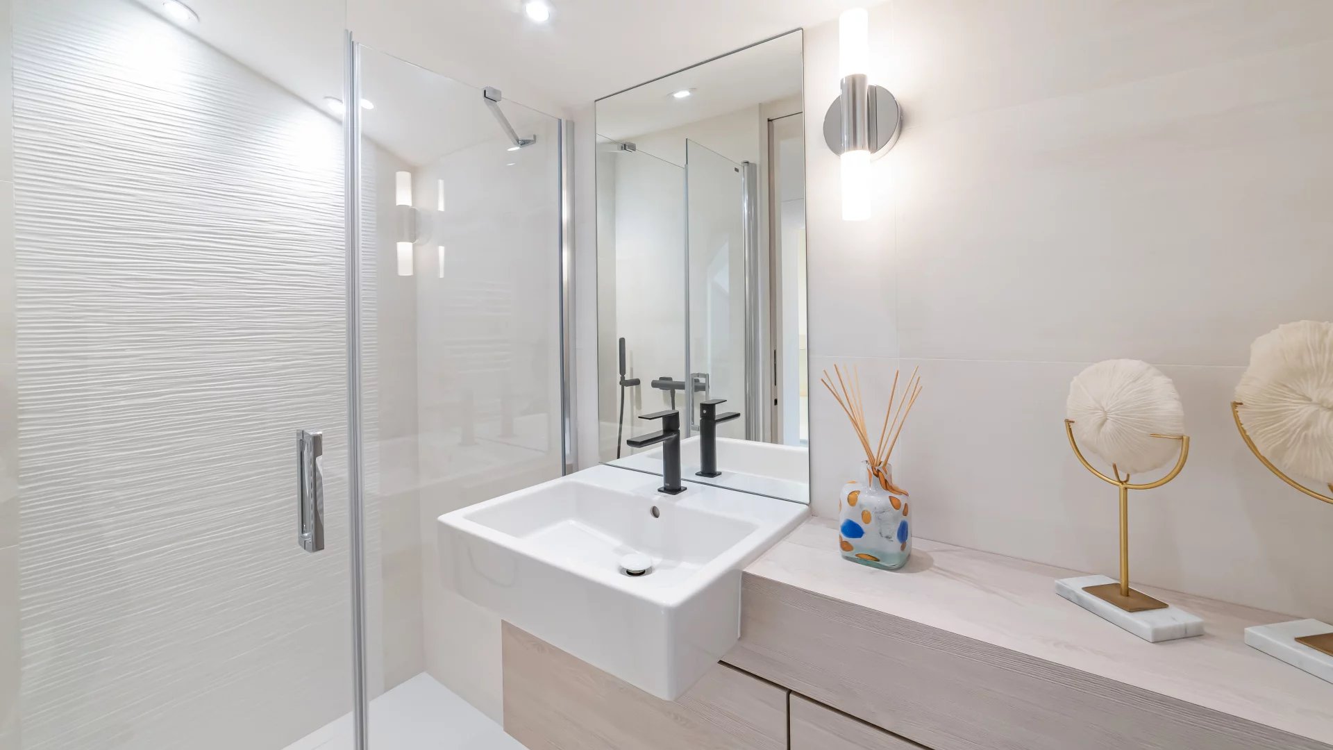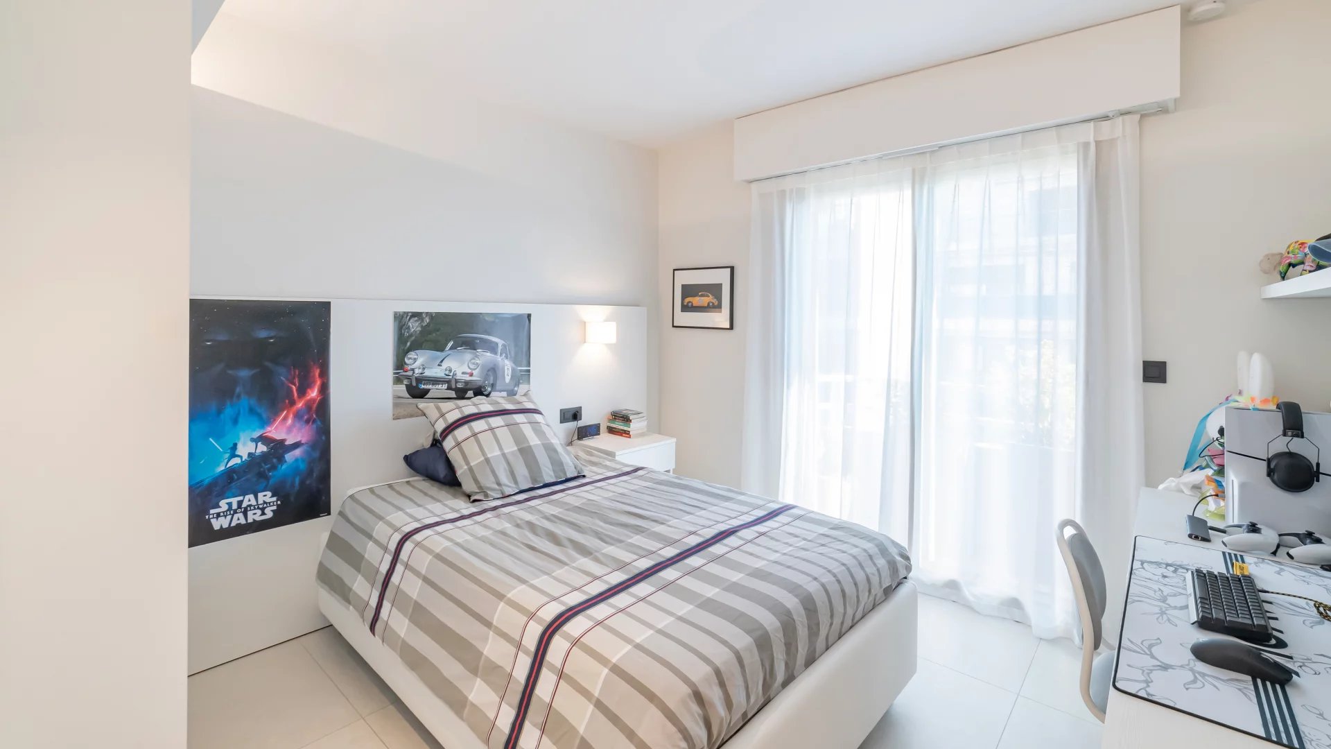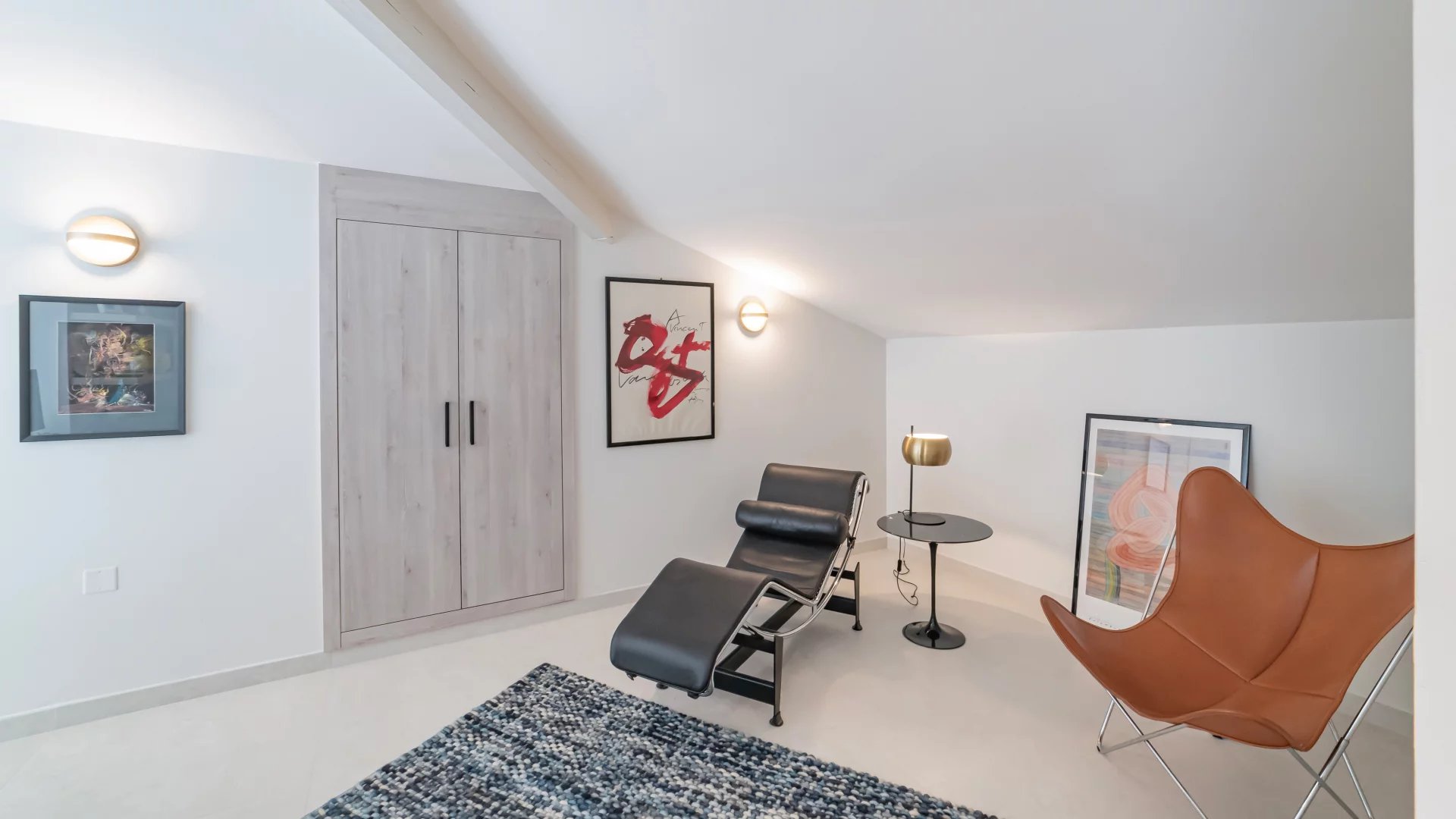 It boasts 50 m2 of terraces. South-facing, it has a floor area of over 200 m2 and comprises: an entrance hall with guest toilet, a cathedral ceiling double living room with open-plan fitted kitchen, a master bedroom with en suite shower room, study area and dressing room, all opening onto the terrace, two other bedrooms each opening onto a balcony and sharing a shower room.