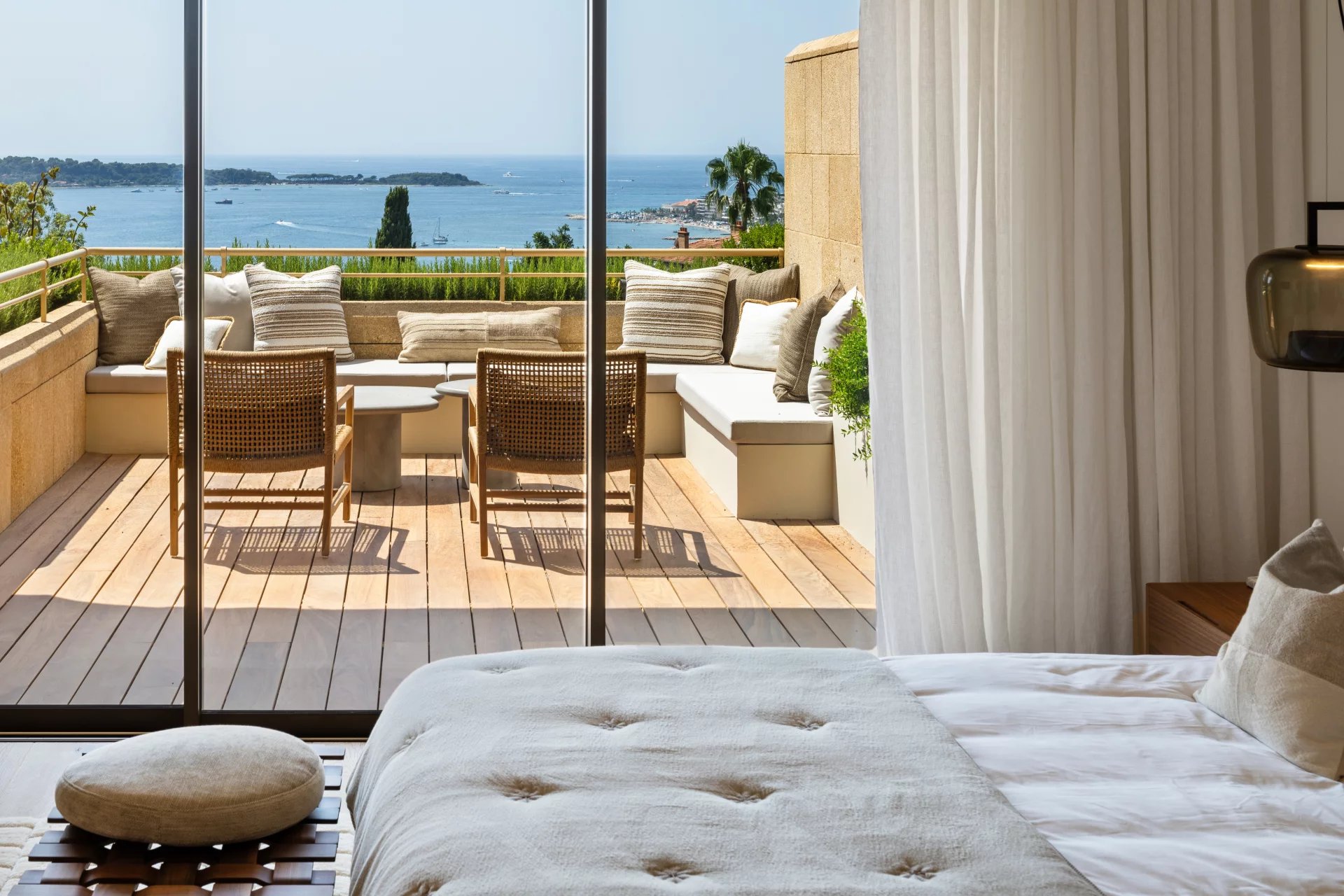 Bright, not overlooked and sheltered from view, it has a large entrance, a very large living-dining room area extending onto a terrace, an ultra-modern fitted kitchen closed by a glass roof, a TV lounge area, a master bedroom en suite with dressing room and bathroom, with private access to the terrace and sea view, two en suite bedrooms with shower room and private balconies, a laundry room for a functional space.