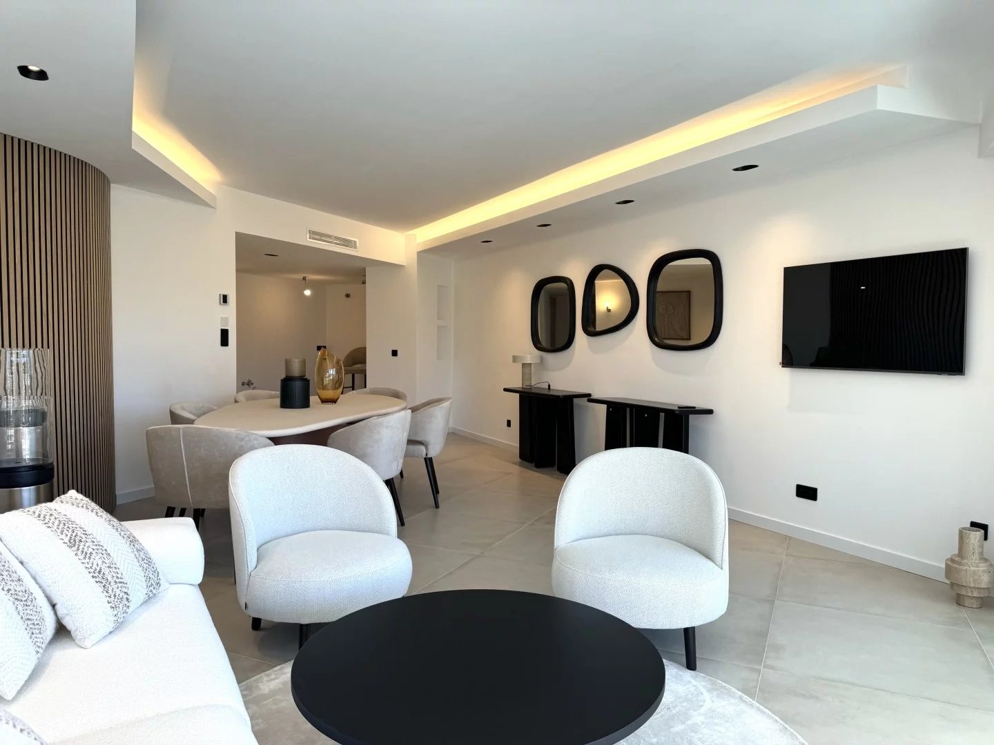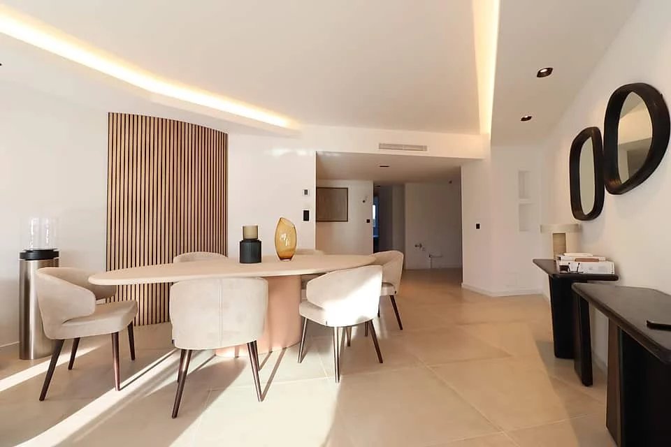 Accommodation comprises an entrance hall, a bright living room with panoramic windows opening onto a lovely terrace facing the sea, an open-plan kitchen, three bedrooms and two bathrooms.