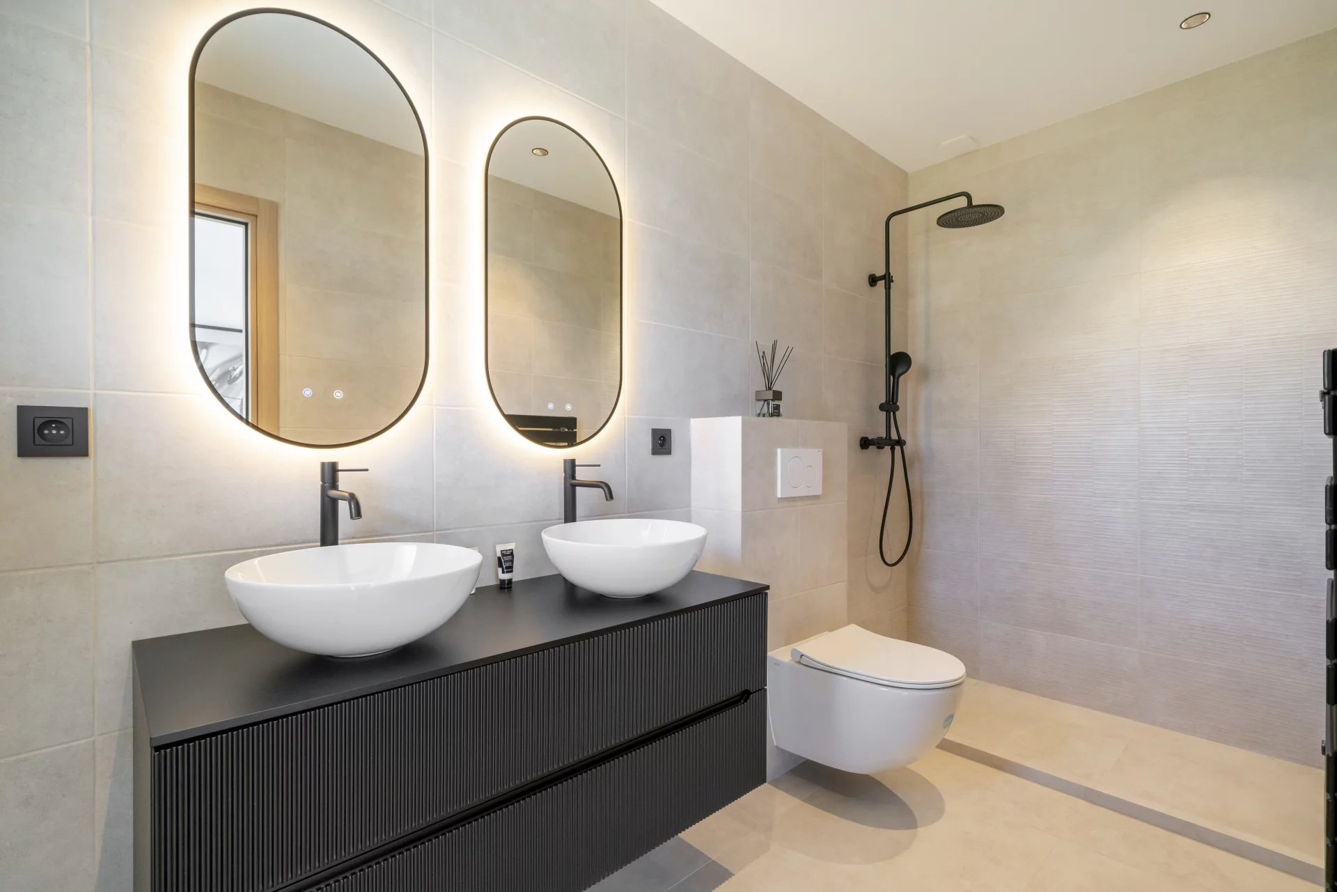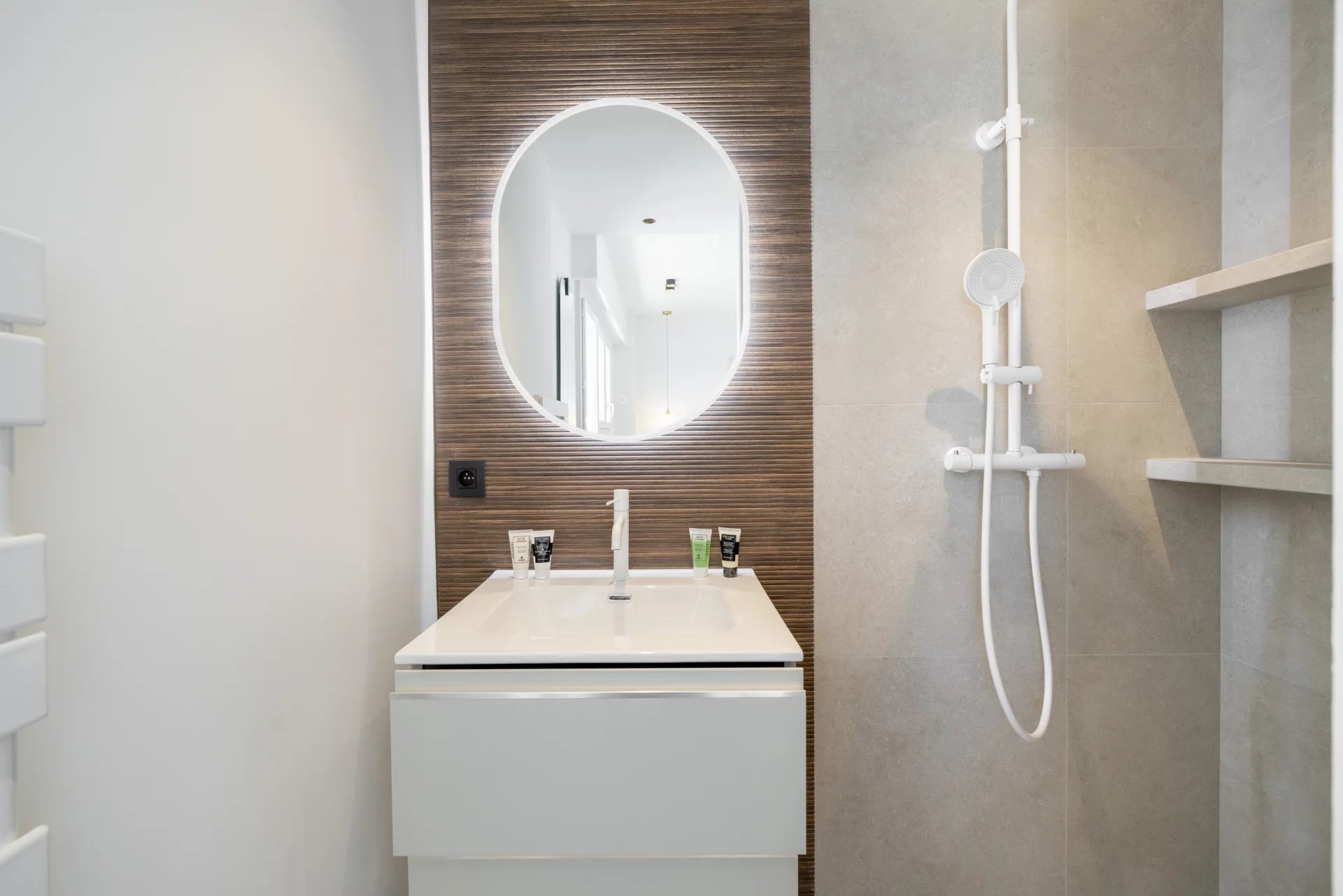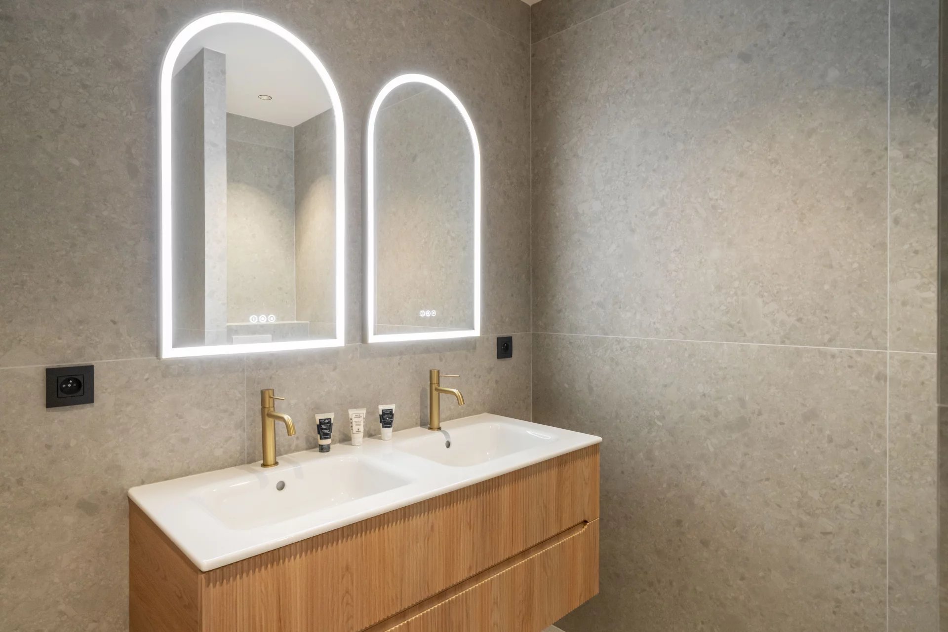 It comprises an entrance hall, a living room with kitchen opening onto the terrace, 3 en suite bedrooms.