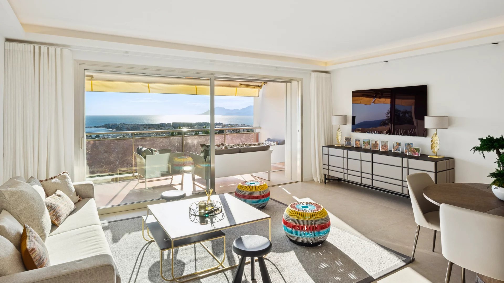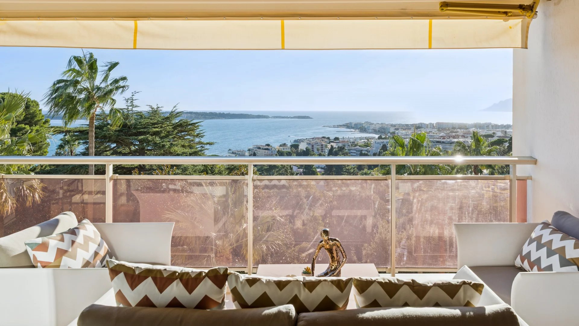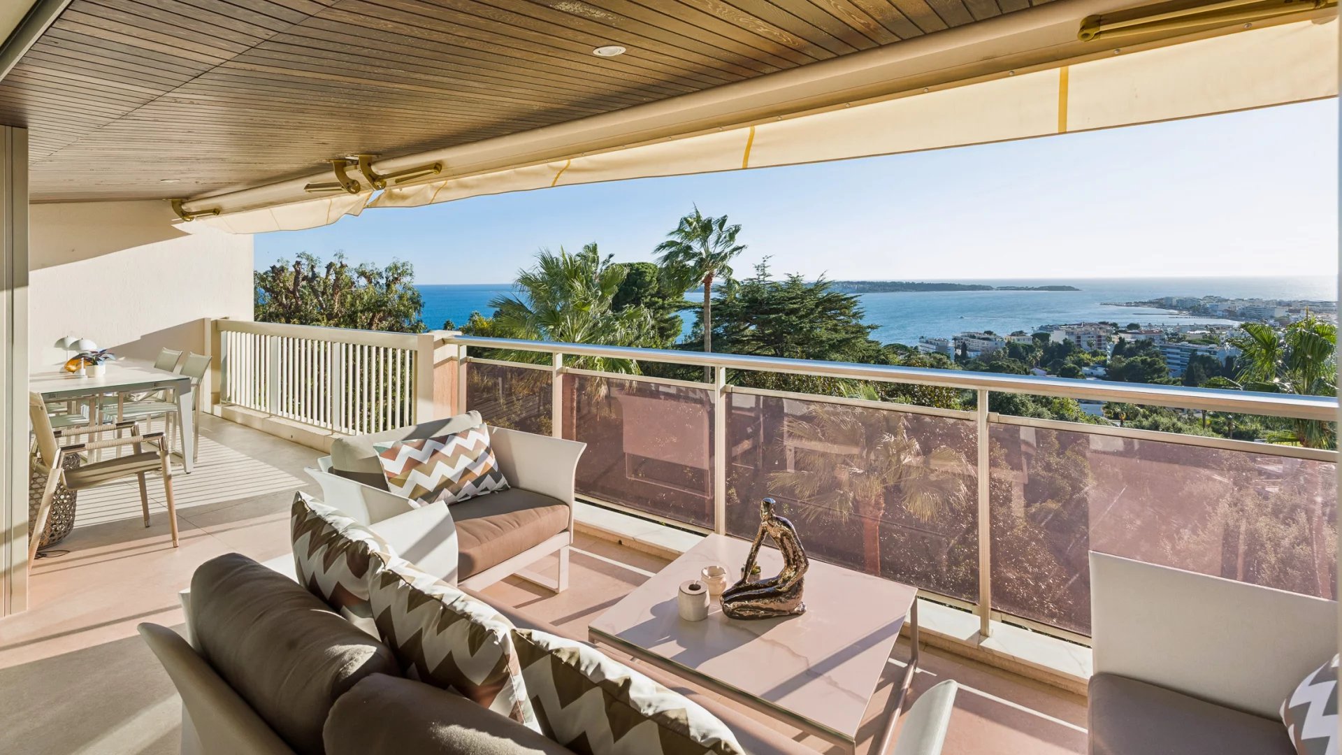 Upon entering, you will be charmed by a spacious and bright living room that opens onto a magnificent terrace of around 23 m2. Enjoy breathtaking views of the Mediterranean Sea, the Lerins Islands, and Palm Beach, perfect for outdoor relaxation.