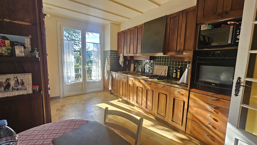 The villa includes an entrance hall, a separate kitchen, and a night area comprising three bedrooms and two shower rooms, along with guest toilets. The landscaped garden features a swimming pool with pool house, creating a relaxing outdoor environment ideal for enjoying the Mediterranean climate.