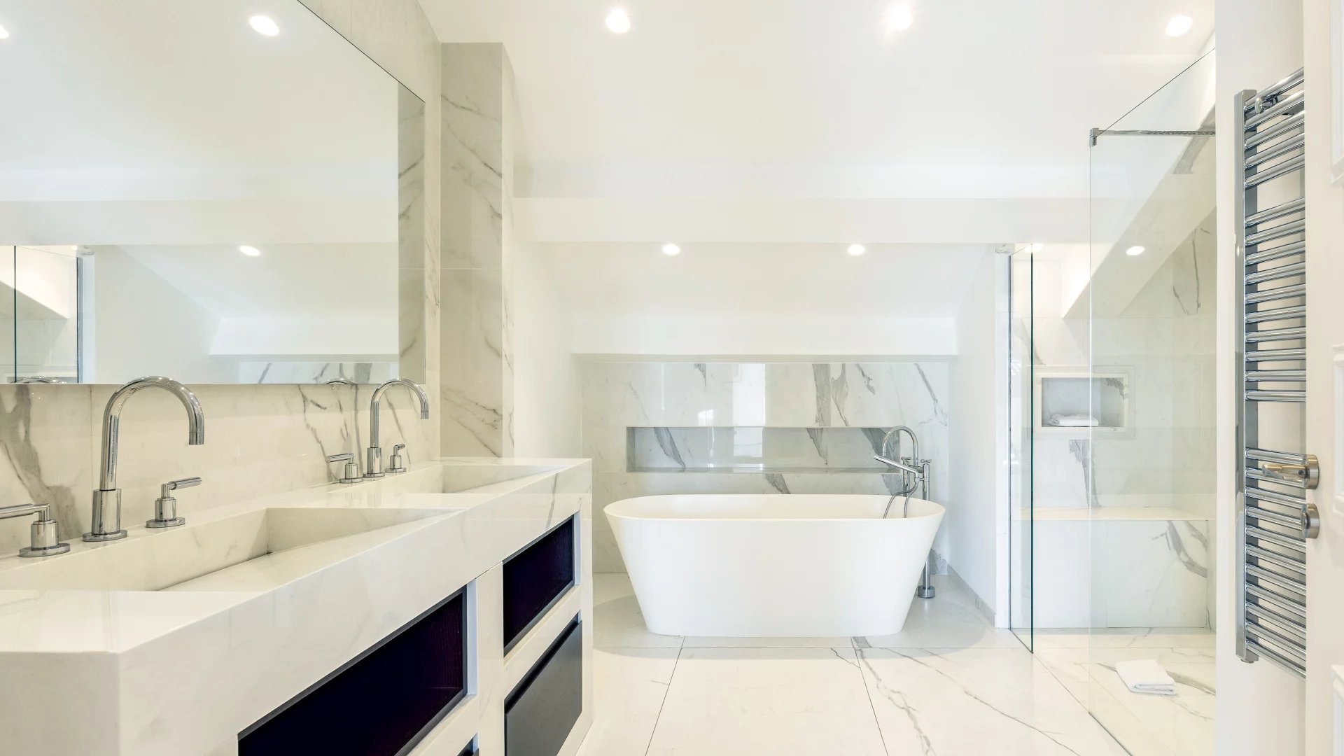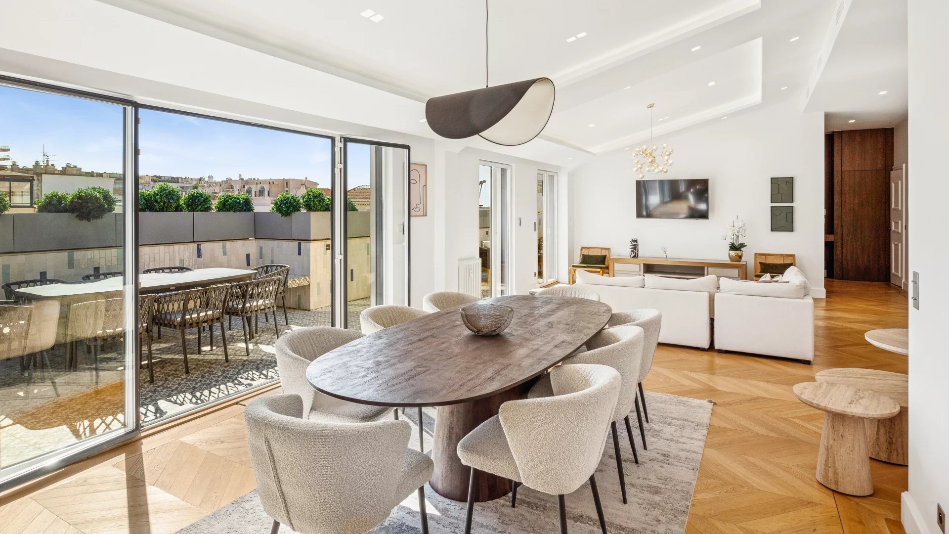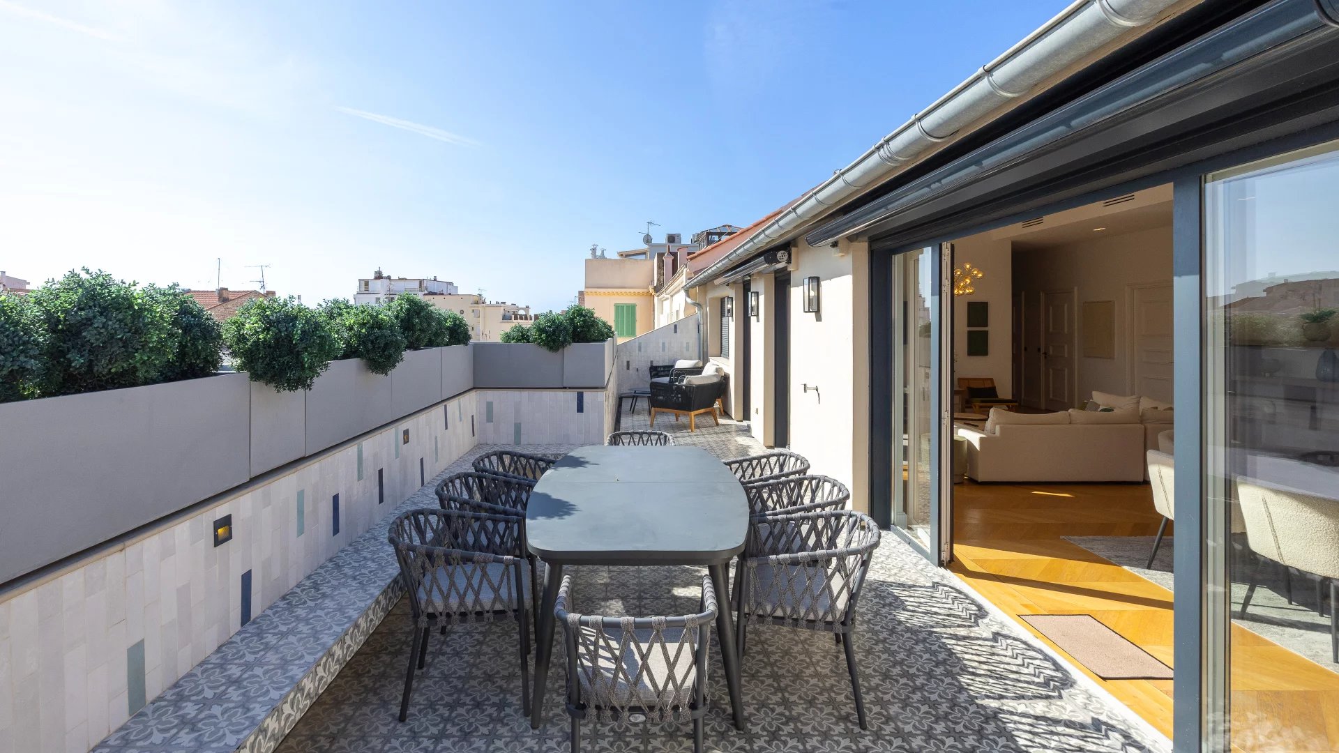 It offers a spacious living room with kitchen and dining area opening onto a 49 m2 terrace, as well as 4 bedrooms with bathrooms and a laundry room.