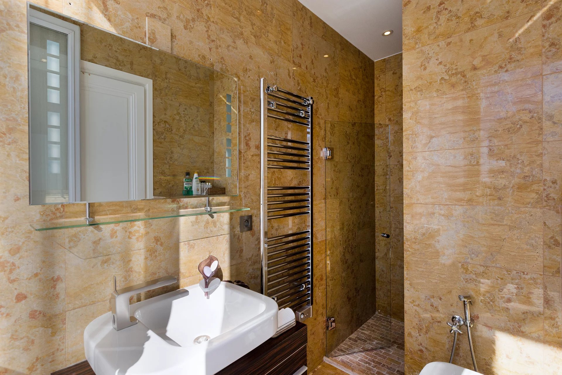 This spacious 200 m2 apartment, finished with noble and high-quality materials, offers four en-suite bedrooms, a large independent kitchen, and a bright living room with impressive high ceilings.