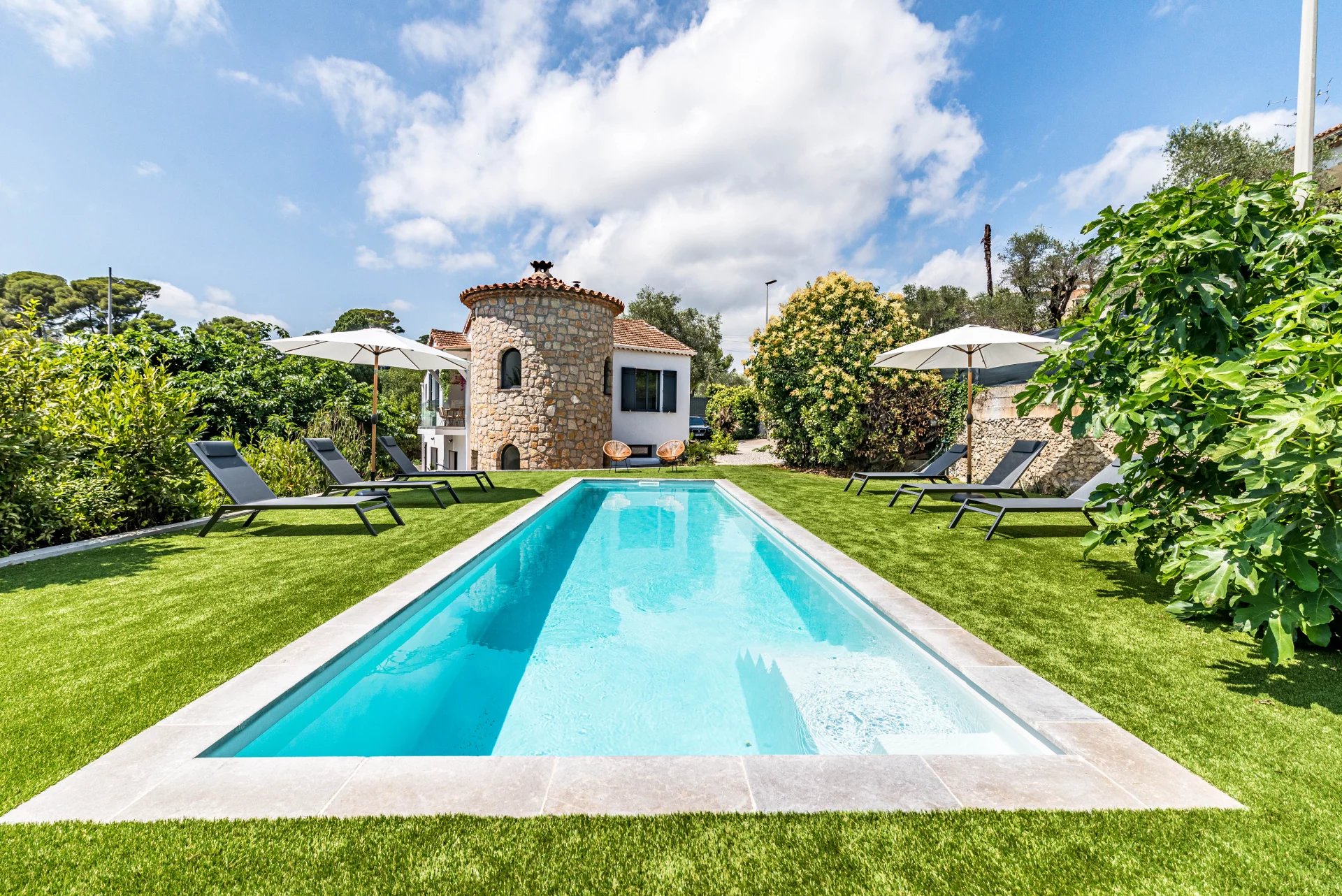 Upstairs on the roof, a private terrace of 100 m2 has a summer kitchen, a bathroom, as well as a breathtaking view of the bay of Cannes, the city and the Var massif of Esterel.