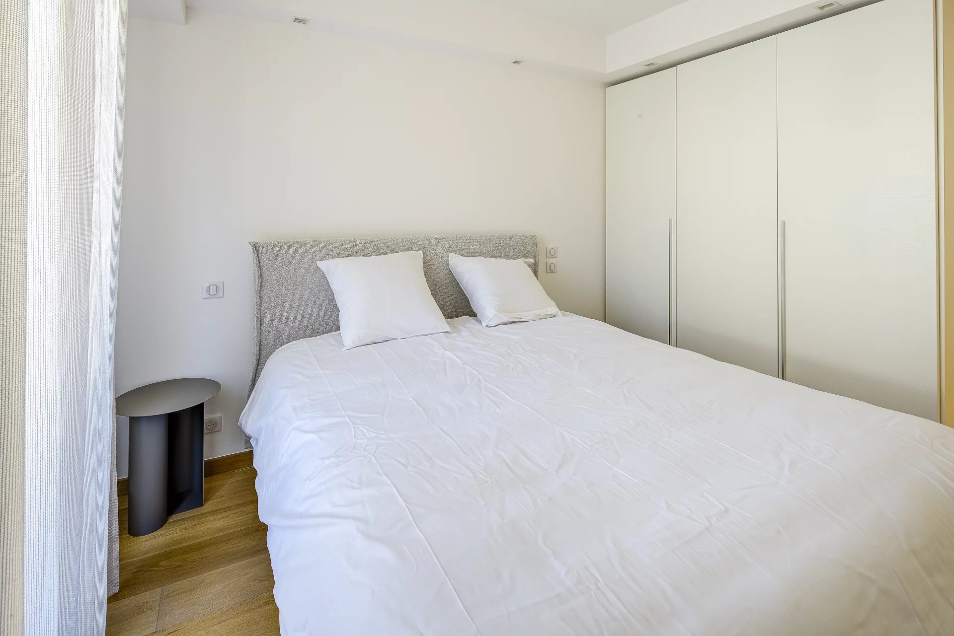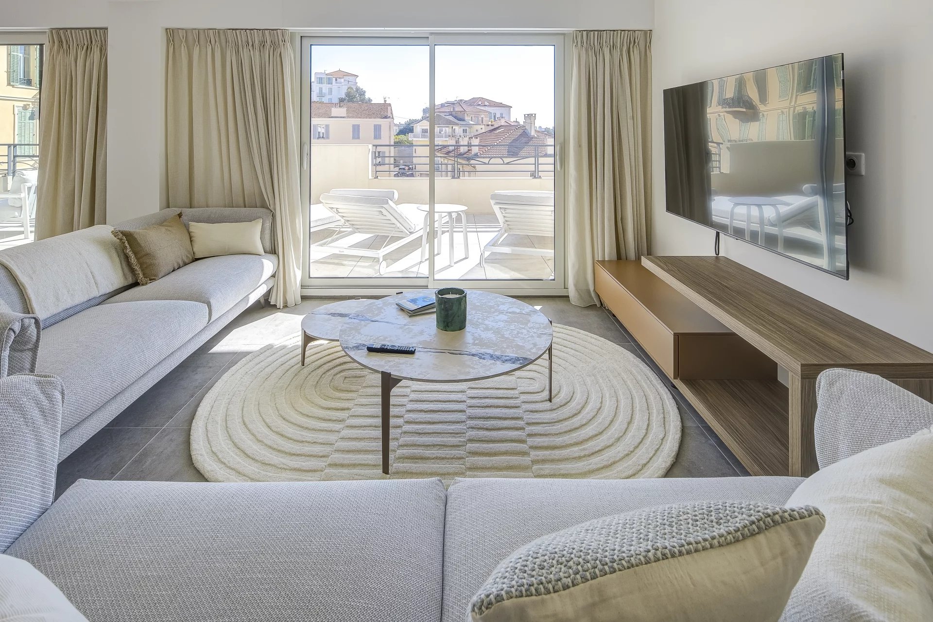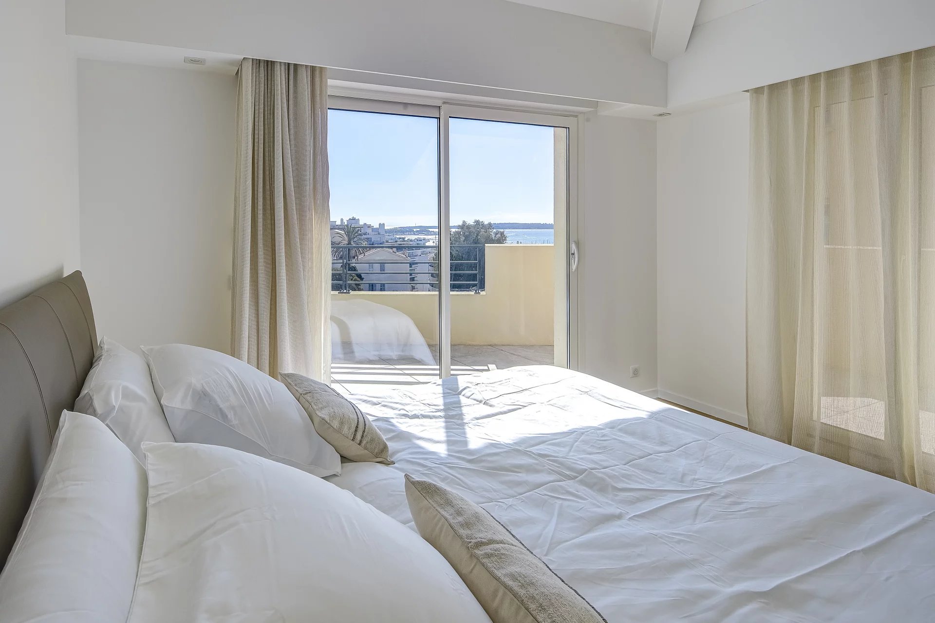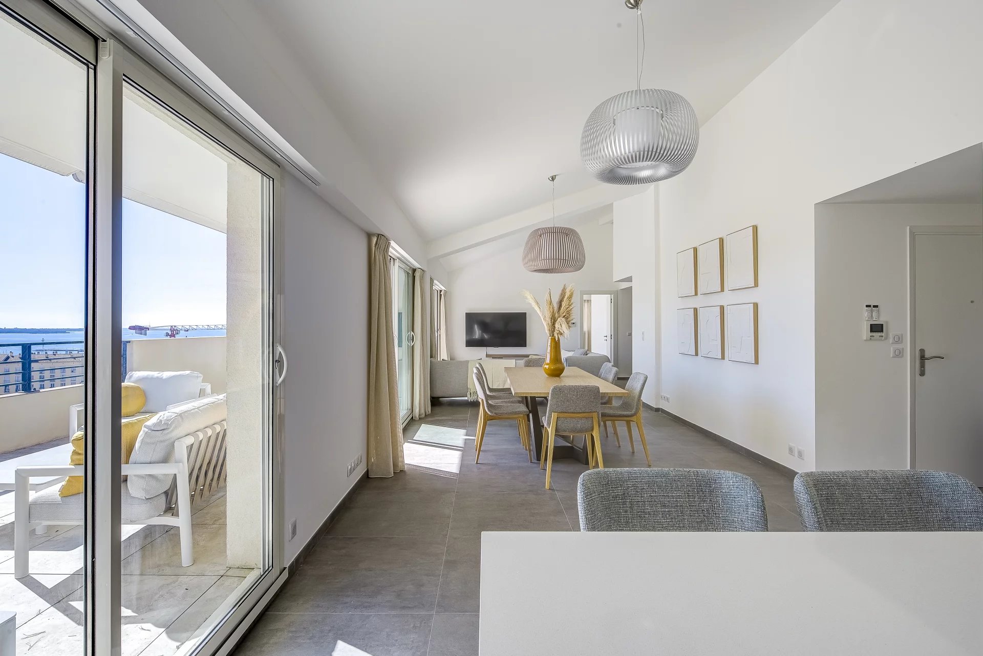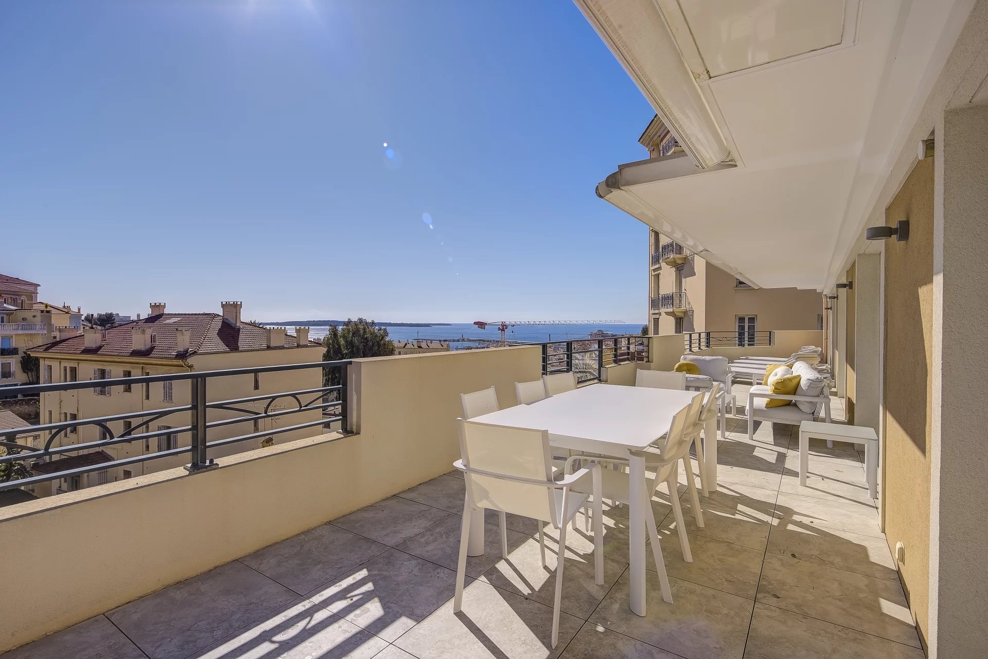 This apartment, currently under renovation, comprises an entrance hall, a lovely living and dinning room with an equipped open kitchen and a scullery, all opening onto a large terrace with a beautiful view of the sea and the Lerins islands.