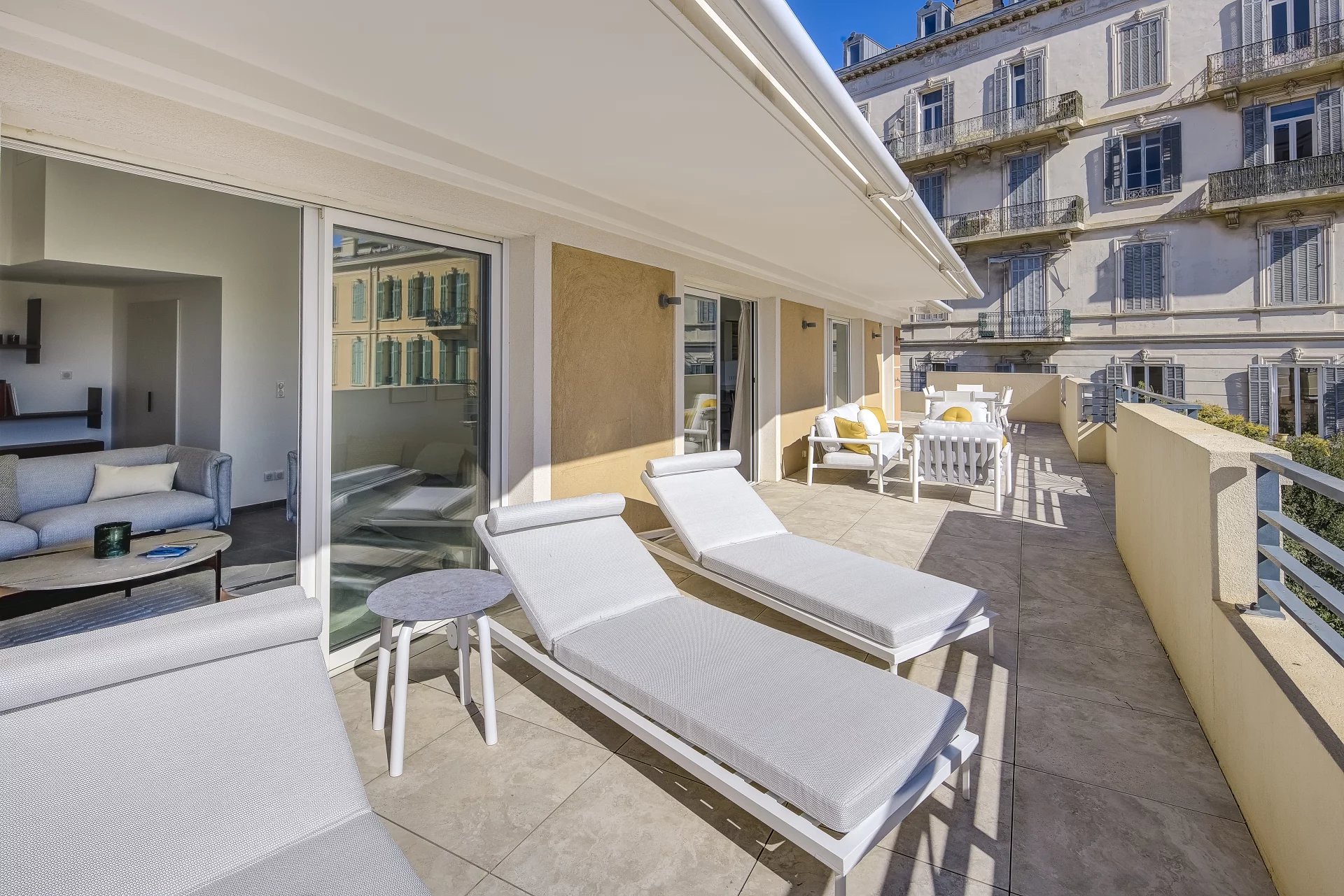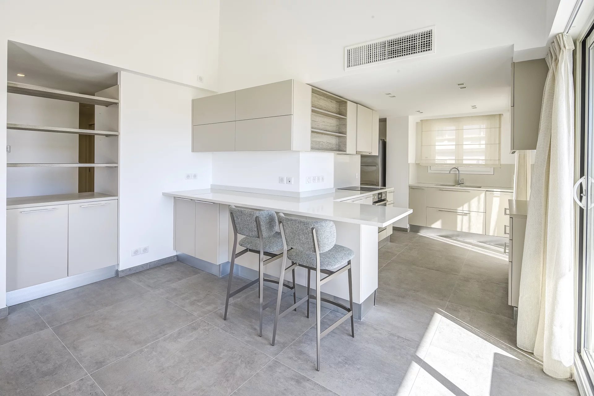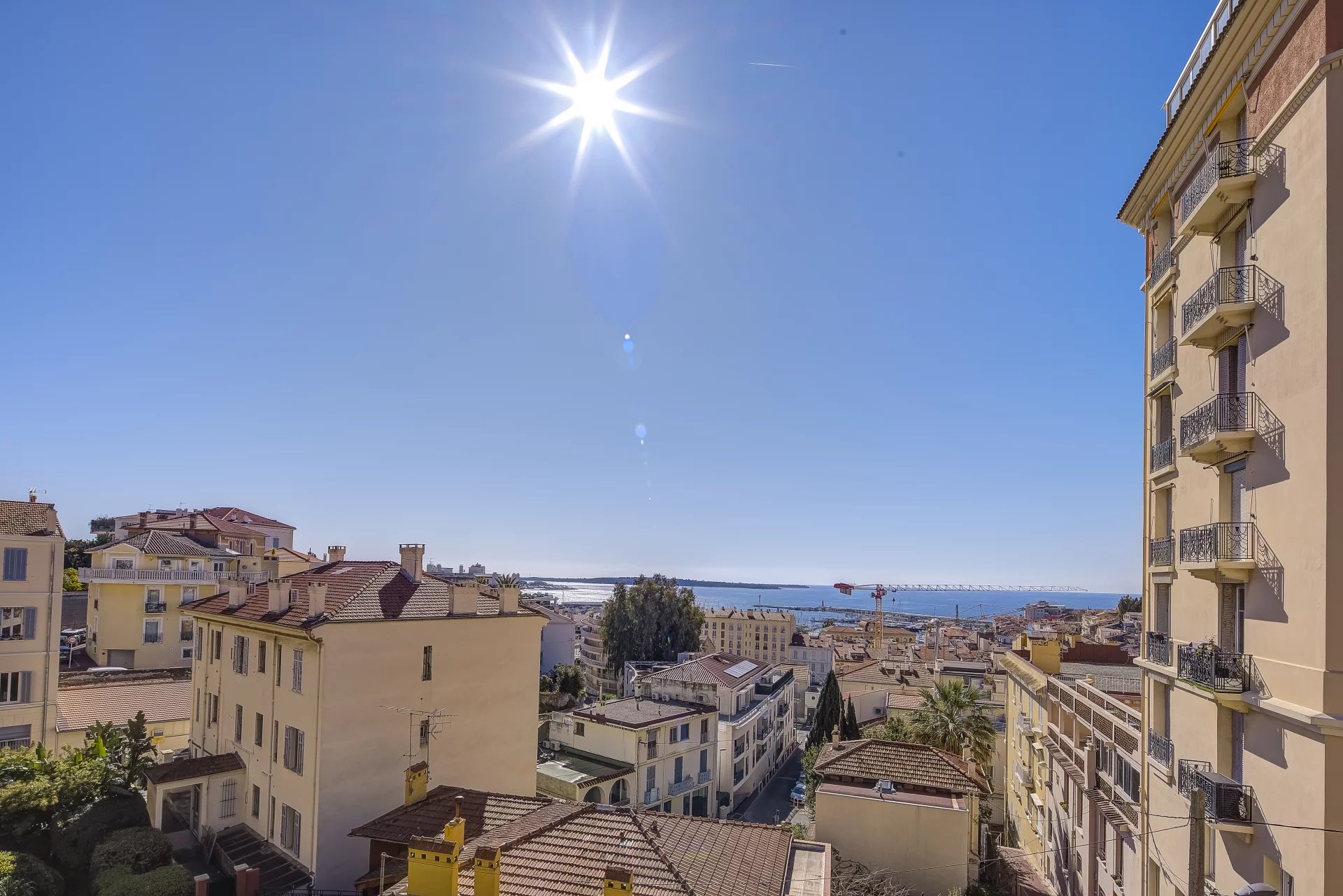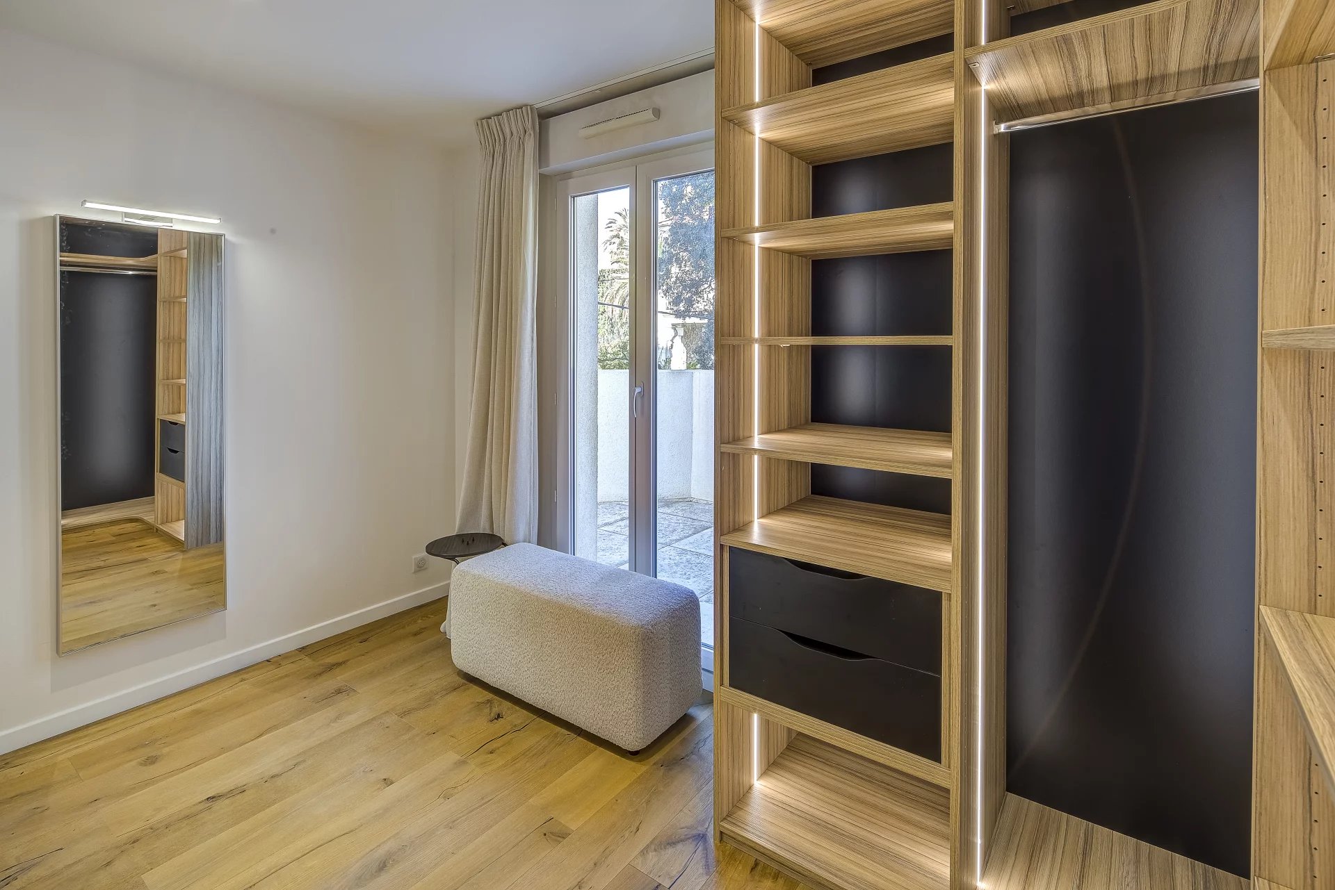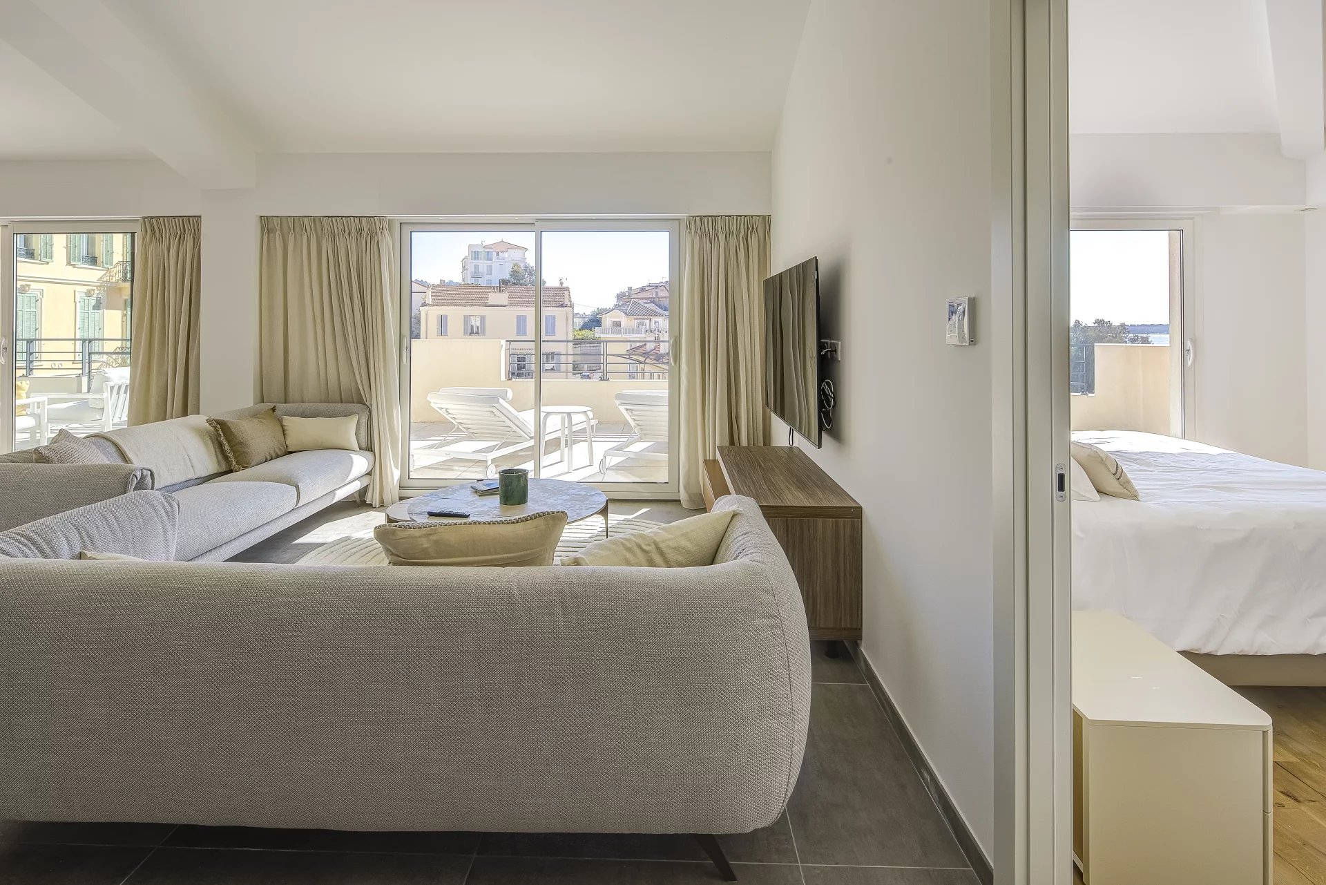 This apartment, currently under renovation, comprises an entrance hall, a lovely living and dinning room with an equipped open kitchen and a scullery, all opening onto a large terrace with a beautiful view of the sea and the Lerins islands.