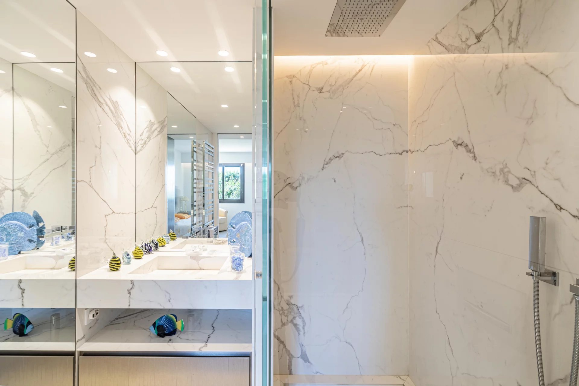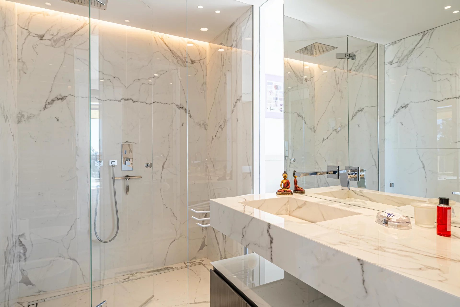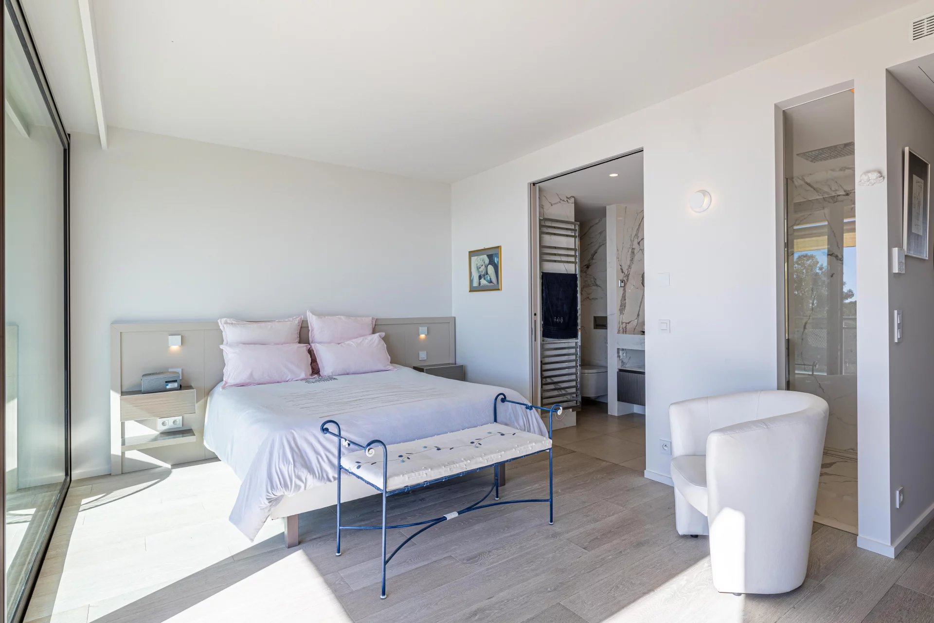 On the lower level, four en-suite bedrooms, all with uninterrupted views and their own shower rooms, two of which open onto a large 35 m2 terrace, a gym with its own shower room and a laundry room.