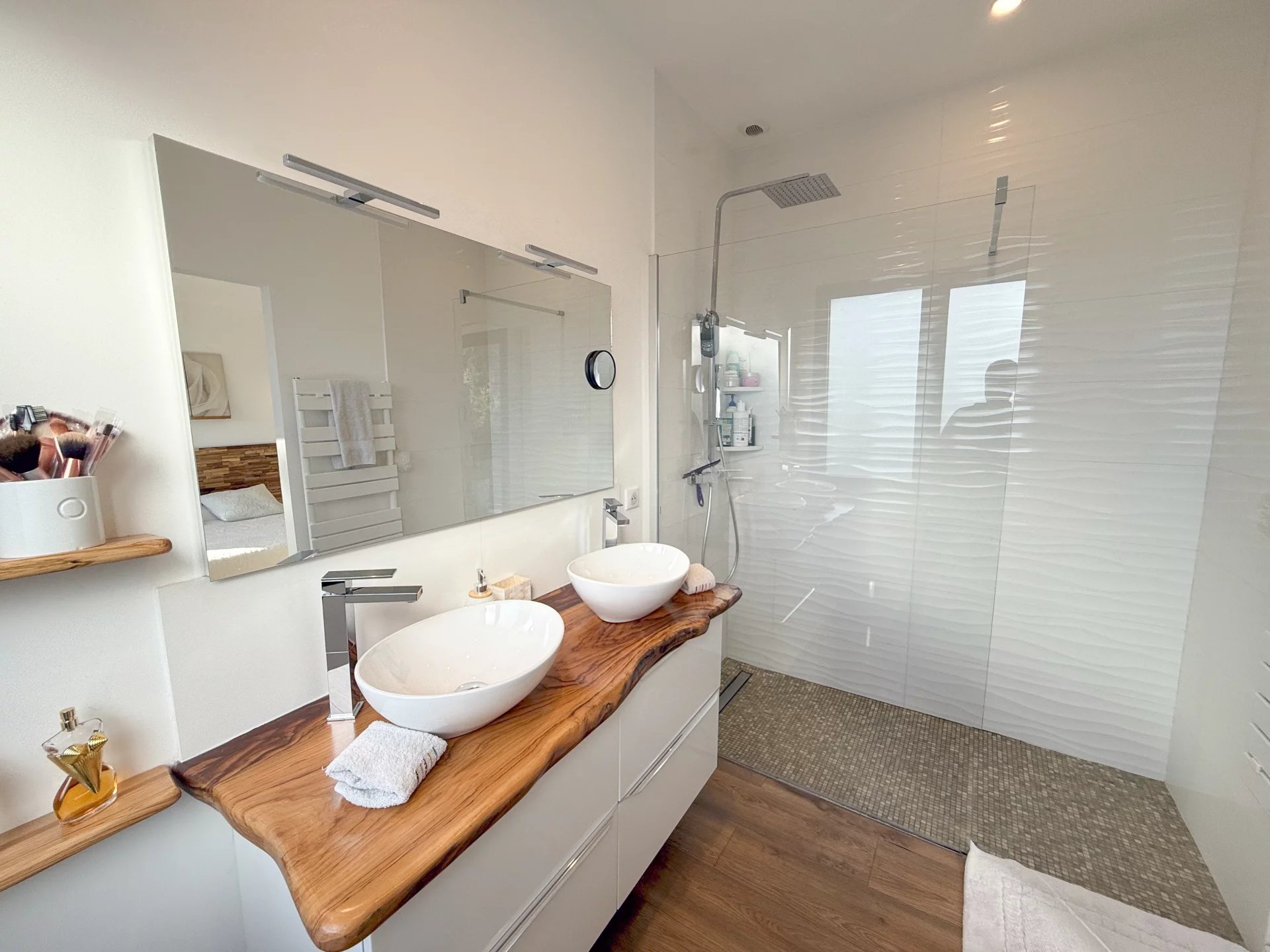 The main villa includes on the ground floor, a large living room with open fitted kitchen, a pantry, an ensuite bedroom with dressing room and bathroom; on the 1st floor, 2 en-suite bedrooms each with their own bathroom, an office, a dressing room; and on the garden level, a double garage + outbuildings.