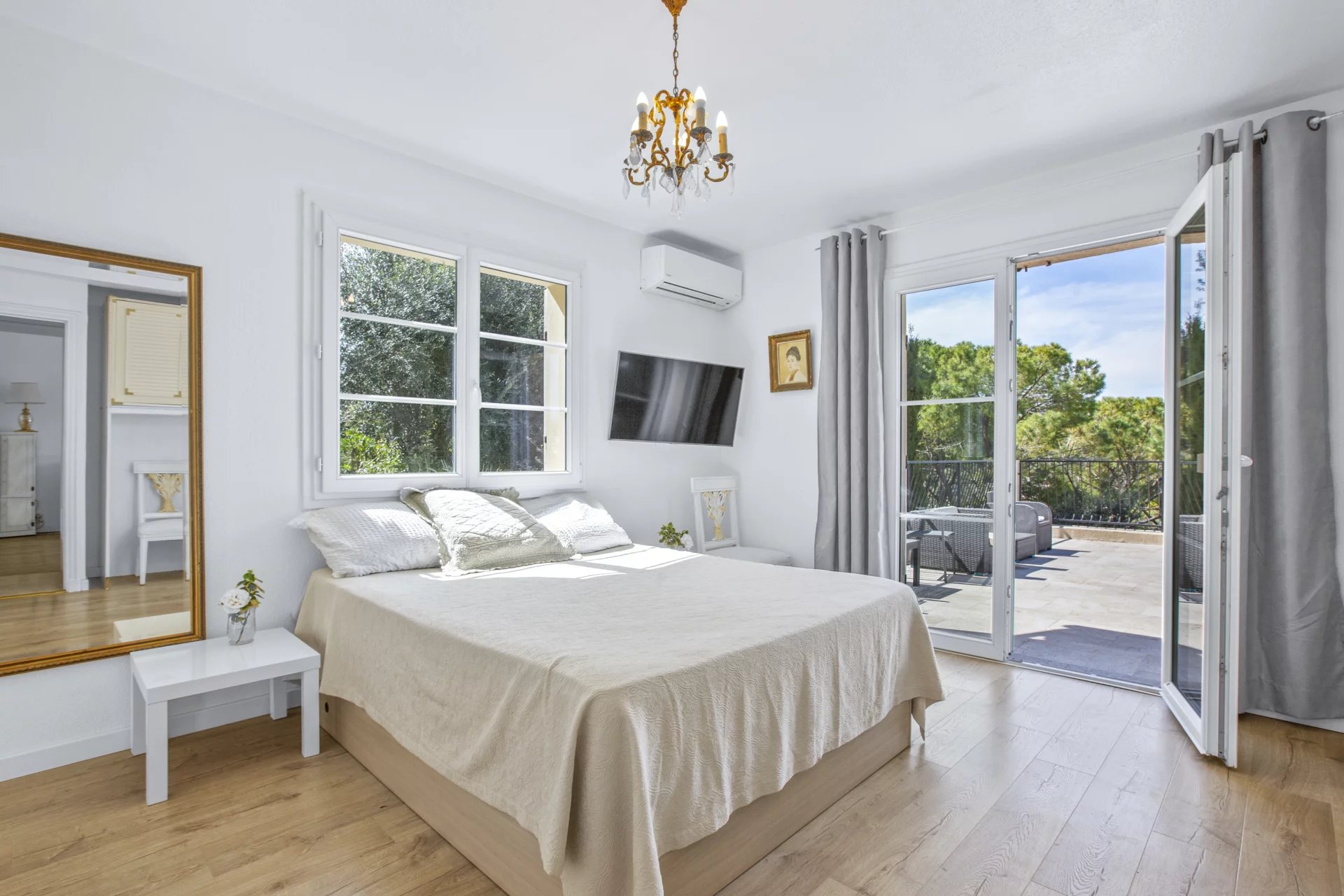 Spread over three levels, it features an independent apartment on the garden level, a bright 53 m2 living room on the first floor opening onto a shaded terrace, as well as an independent kitchen and three bedrooms, two of which have en-suite bathrooms and access to a 53 m2 panoramic terrace with breathtaking views of the hills and the Estérel.