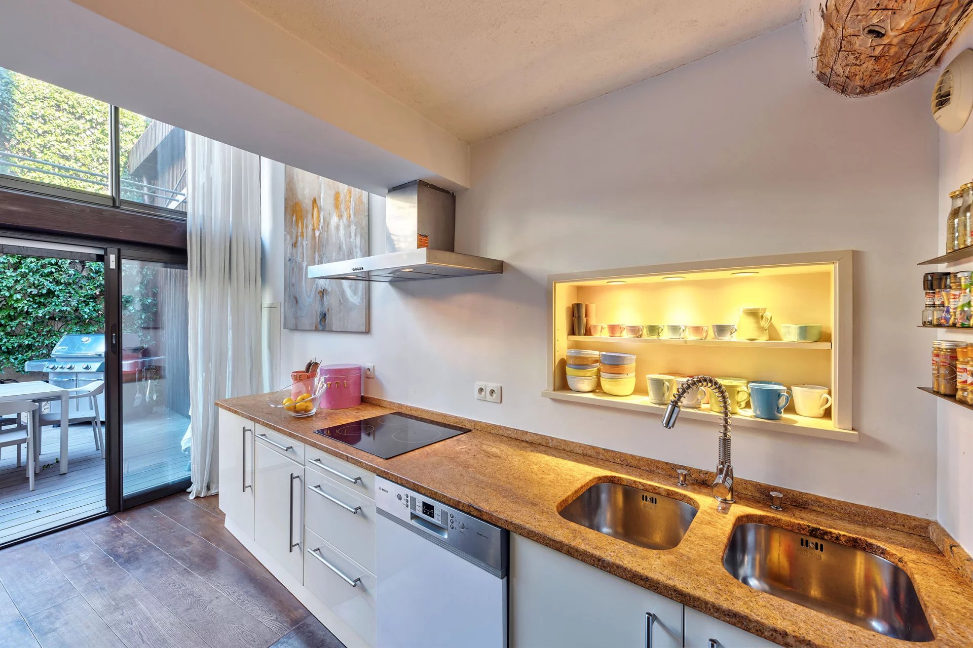 Set in a condominium, the detached house enjoys a 180 m2 garden planted with trees, a rarity in the centre of town, with a large terrace for relaxing or entertaining.