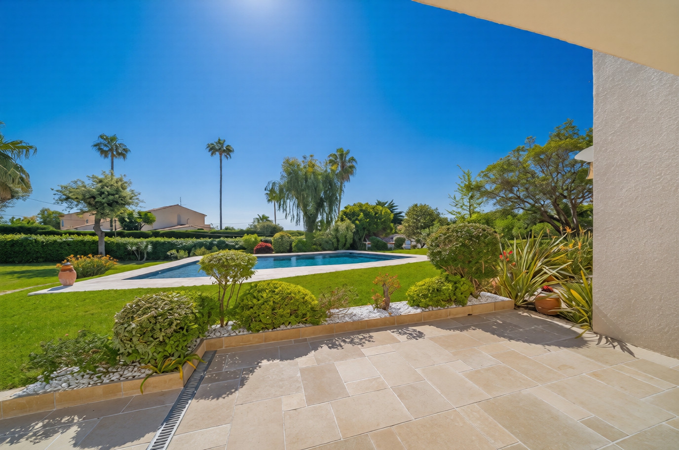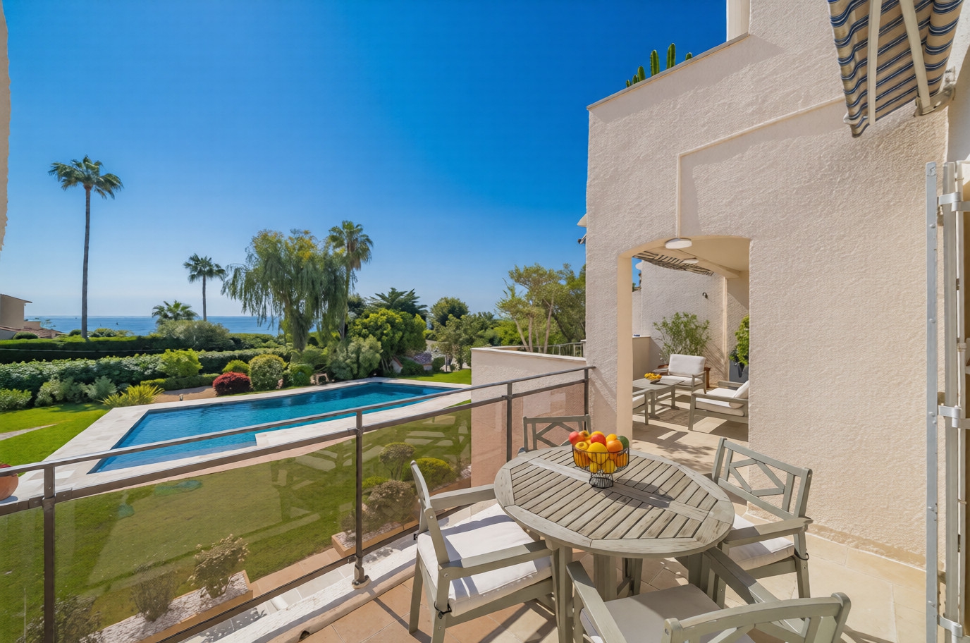 The living areas open onto the outdoors and enjoy sea views as well as views over the lush grounds of the residence. It also offers access to a private condominium swimming pool.