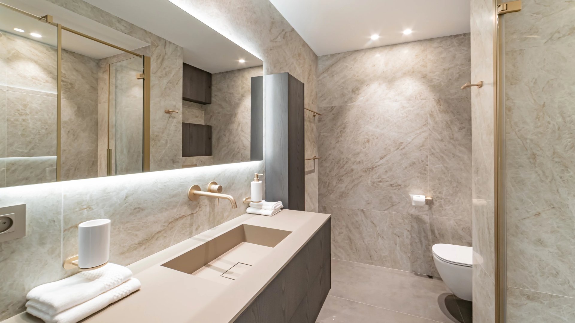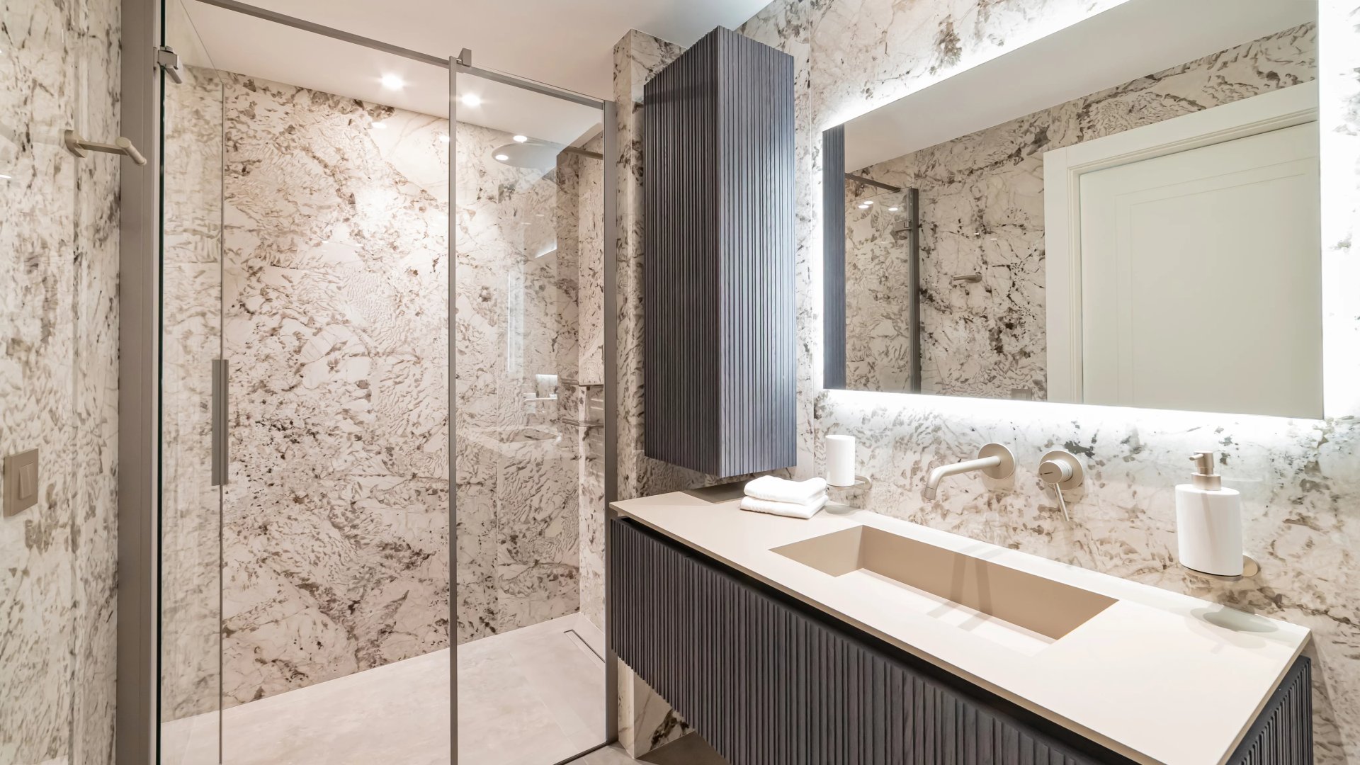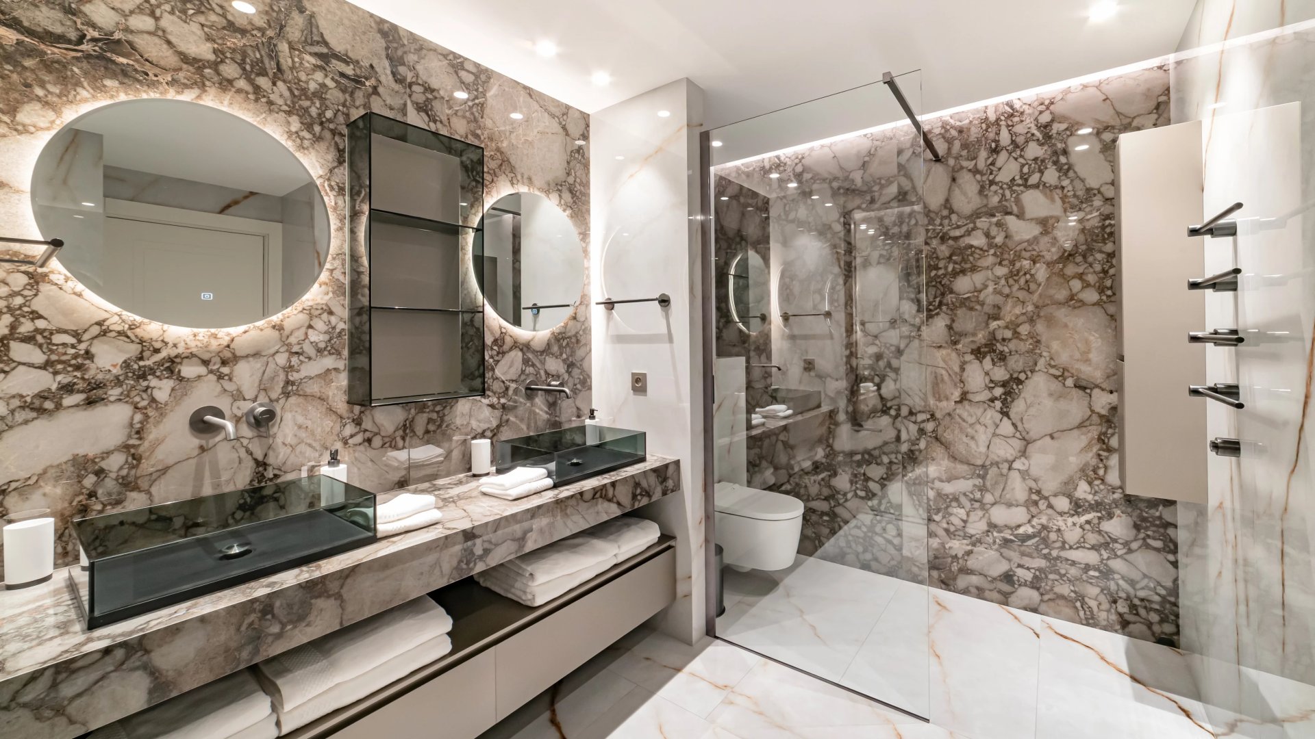 The sleeping area includes three superb master suites, each with its bathroom and direct access to the terrace, as well as a fourth bedroom with a bathroom also opening to the outside, and a fifth bedroom with its bathroom.