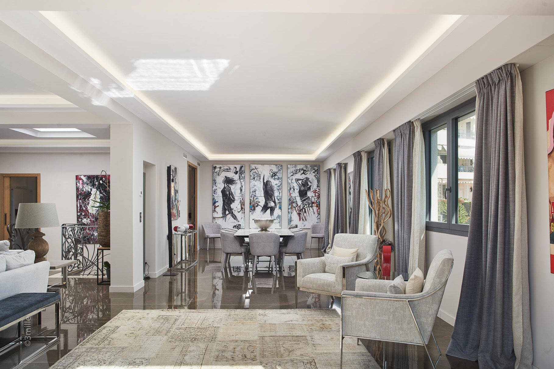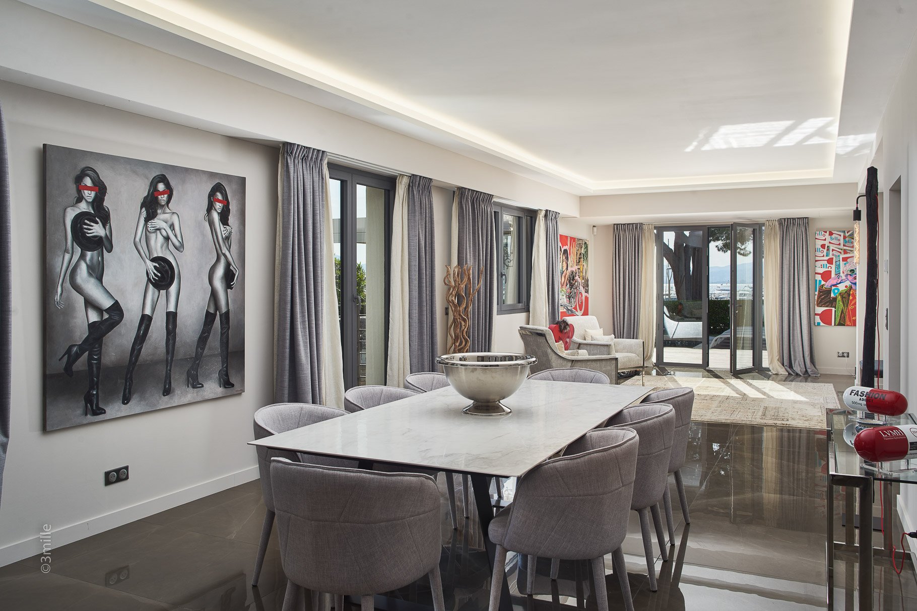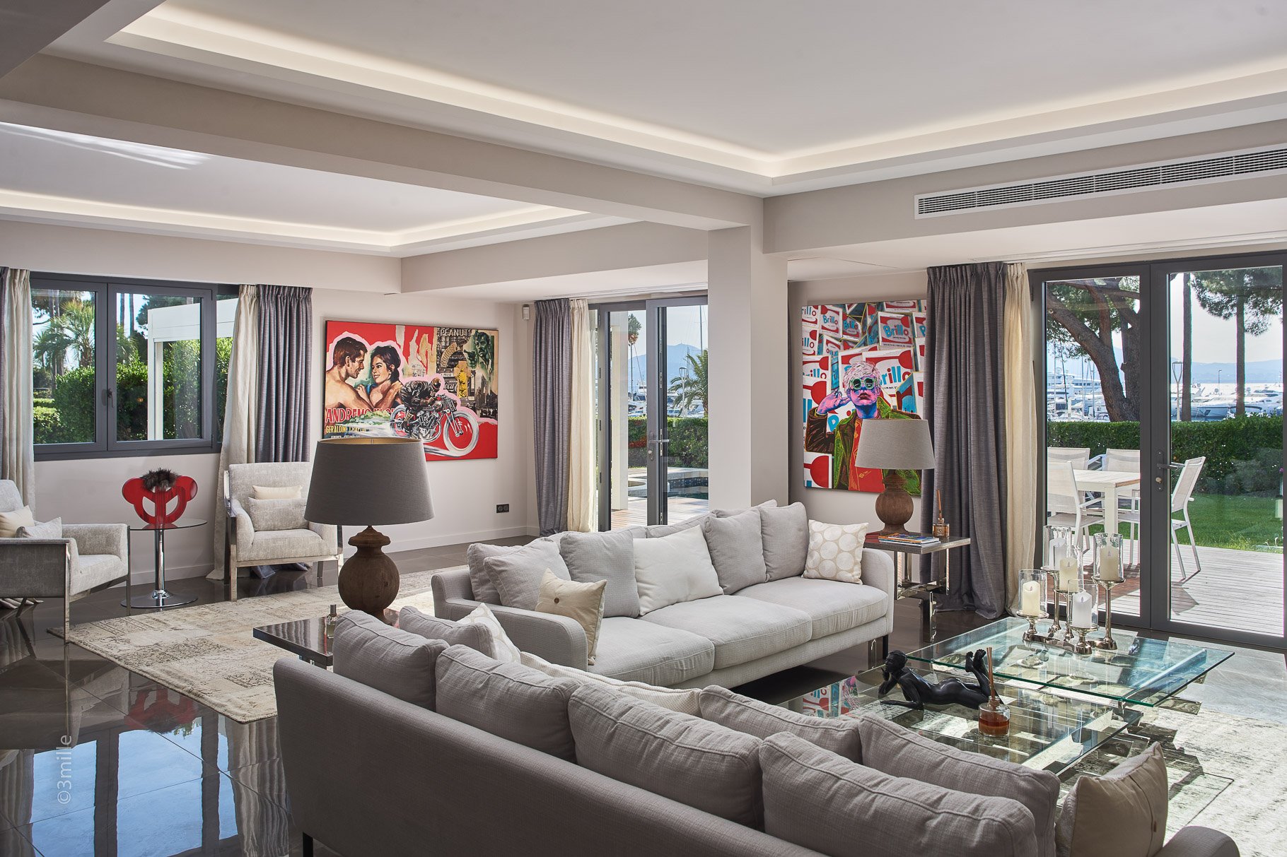 In the world famous coastal town of Cannes: on the highly sought after neighbourhood on the Croisette, facing Port Canto surrounded by greenery, 340 m2 well appointed contemporary property.