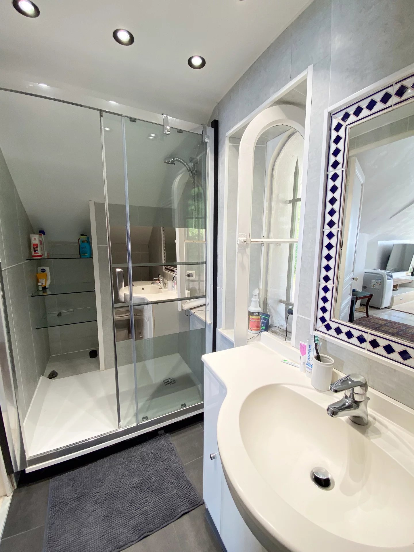 Upstairs, the first floor hosts a bedroom and a modern shower room, while the second floor provides an additional bedroom—ideal for guests or a private office.