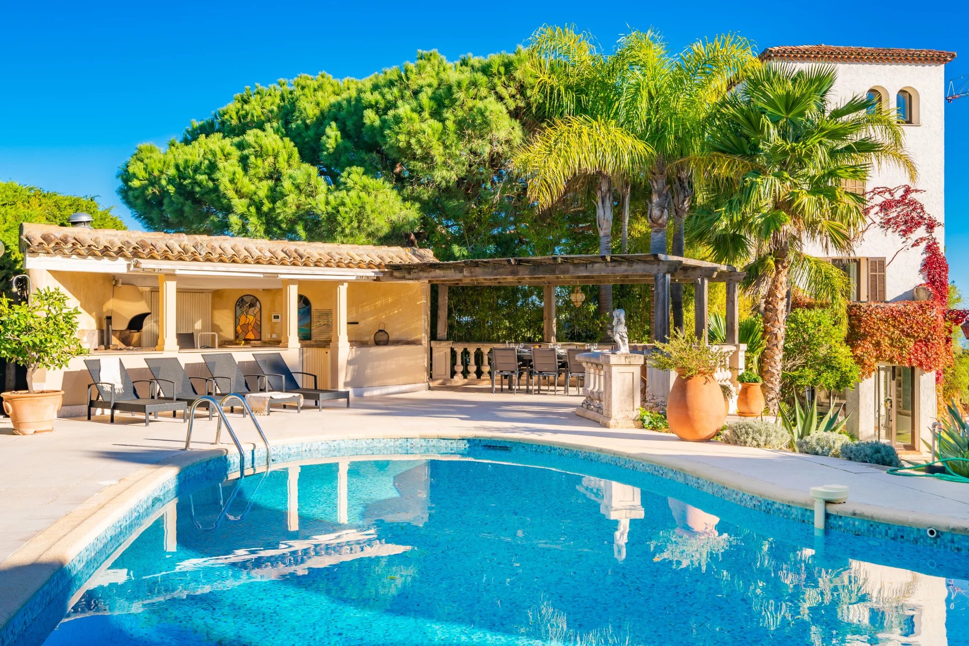 The exterior is made up of a large garden, a furnished terrace with panoramic sea view, as well as a swimming pool with pool house and summer kitchen.