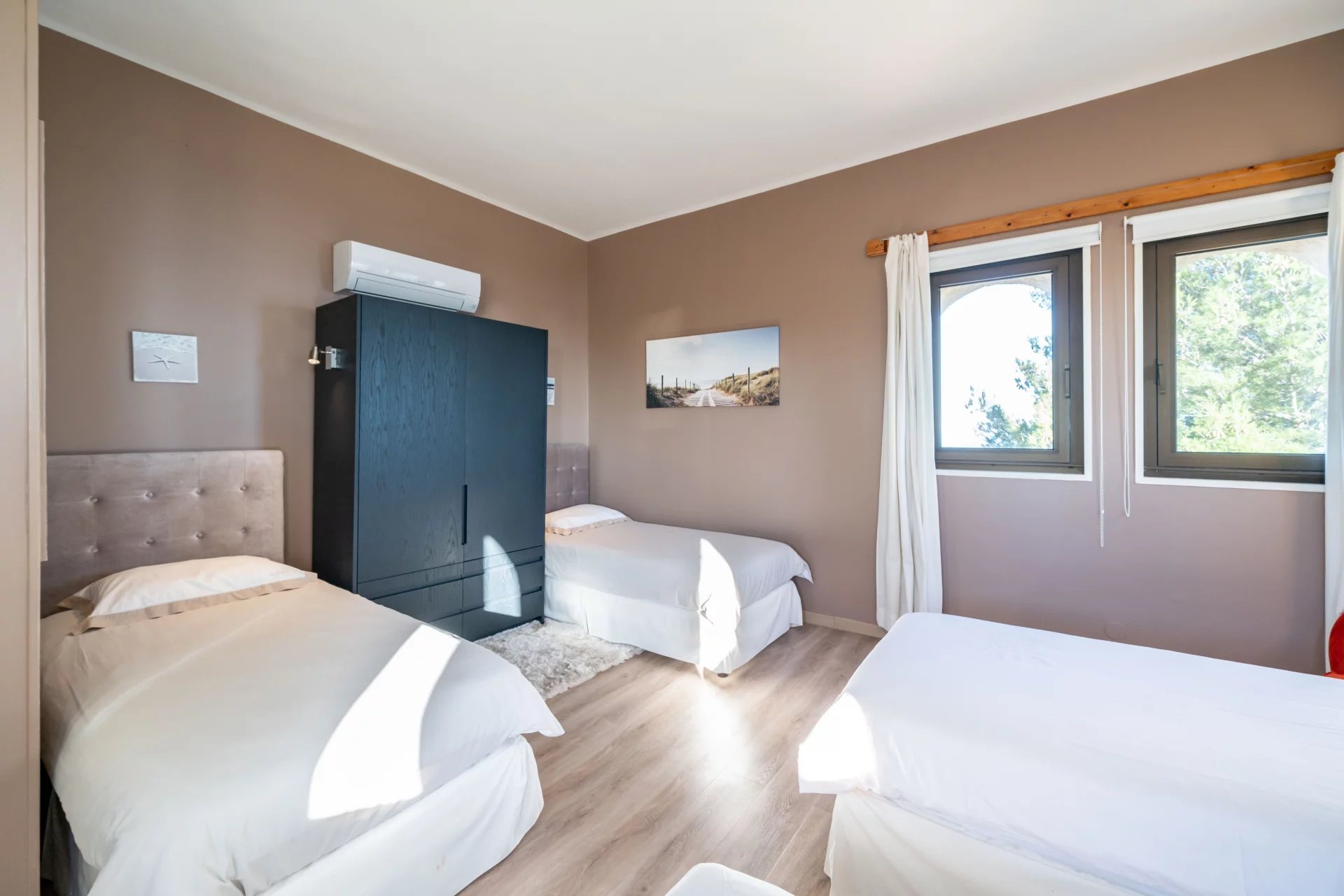 The property consists of a double living room and a dining room for 8 guests opening onto a sea view terrace, a fully equipped independent kitchen with wine cellar and scullery, a laundry room, a bedroom single bed en suite, 3 double bedrooms en suite, an extra bedroom, a bedroom with 4 single beds and a child’s bedroom.